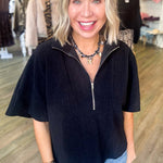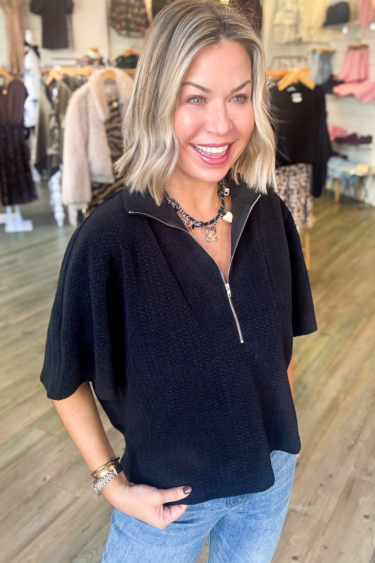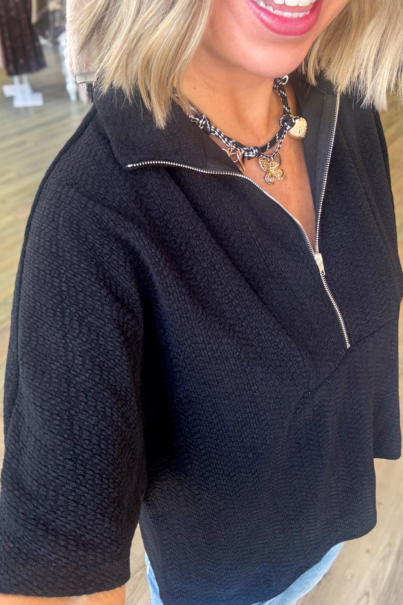 Effortless layering meets laid-back style with this sleek black pullover. The front zip design lets you control your vibe—wear it fully zipped for a polished look or leave it open for that relaxed, undone aesthetic. Perfect for throwing on over your favorite tee or keeping solo when the temperature drops. Versatile, comfortable, and endlessly easy to style, this pullover is about to become your go-to piece for everything from casual coffee runs to cozy nights in.