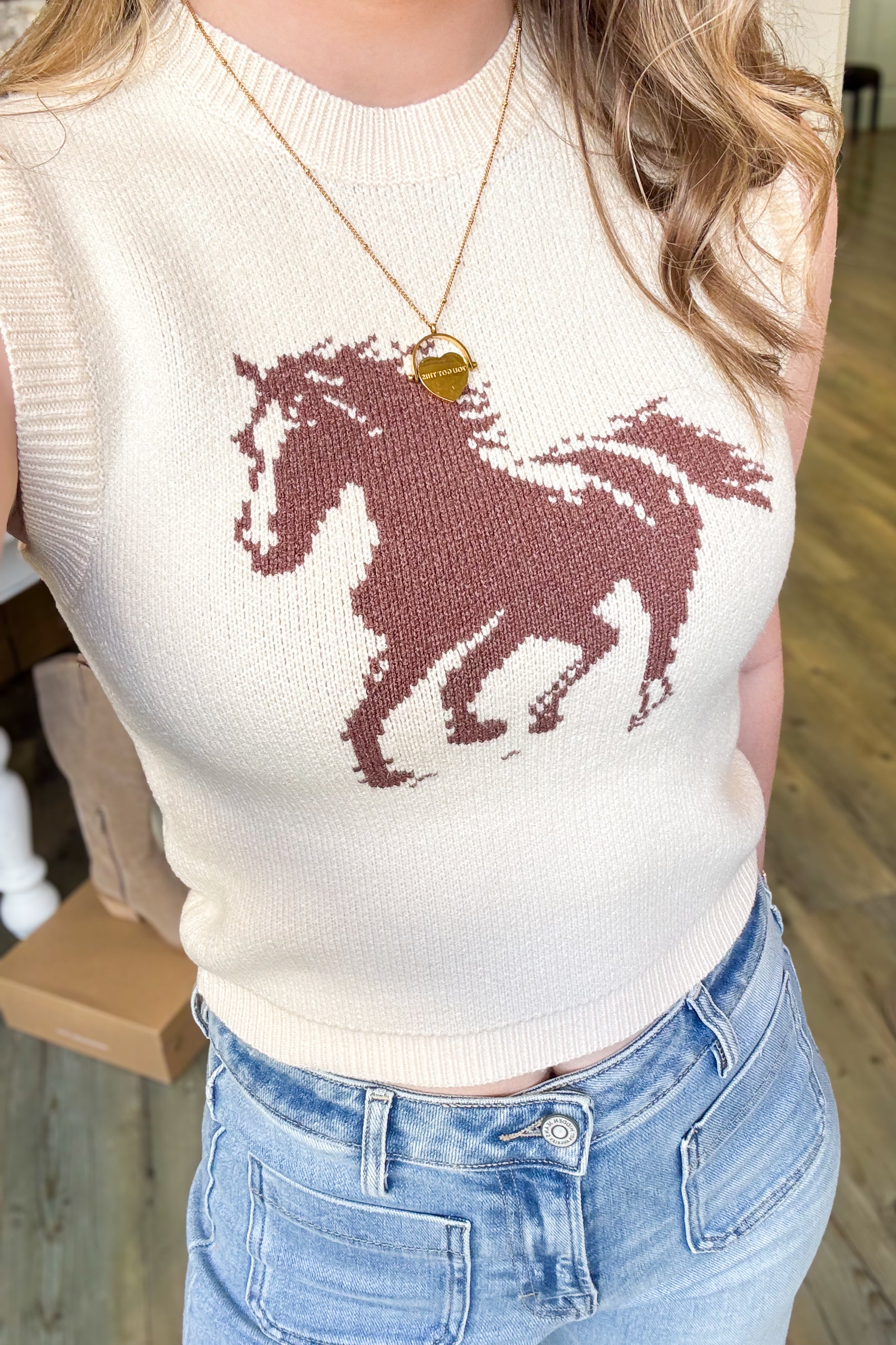 Saddle up in bold style with this striking Horse Knit Vest. Featuring an eye-catching equestrian graphic that commands attention, this piece transforms any outfit into a statement look. The comfortable knit construction moves with you, while the vest's versatile design layers effortlessly over tees or long sleeves. Perfect for those who dare to showcase their passion for horses with unapologetic flair. Make your mark—wear it with confidence.