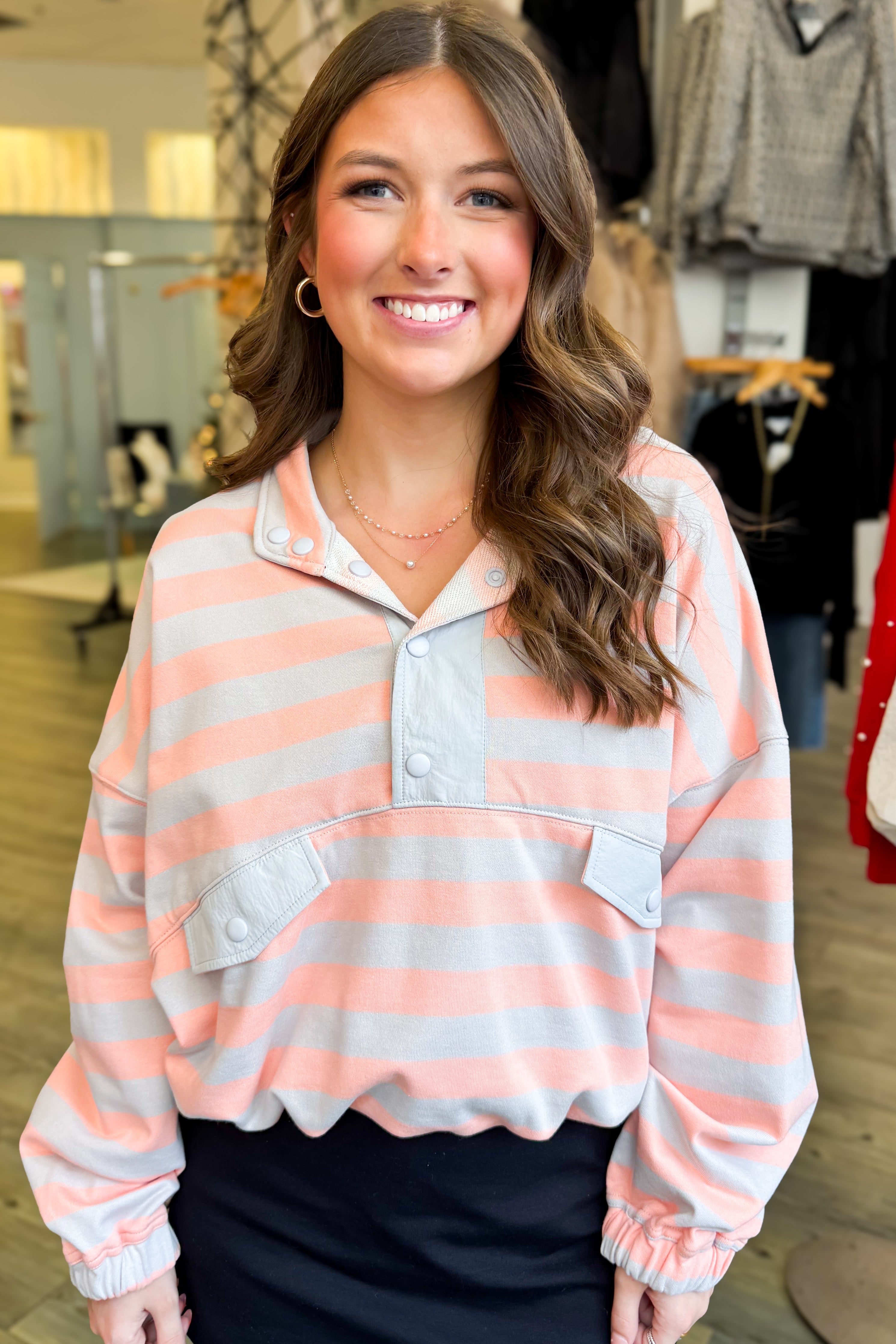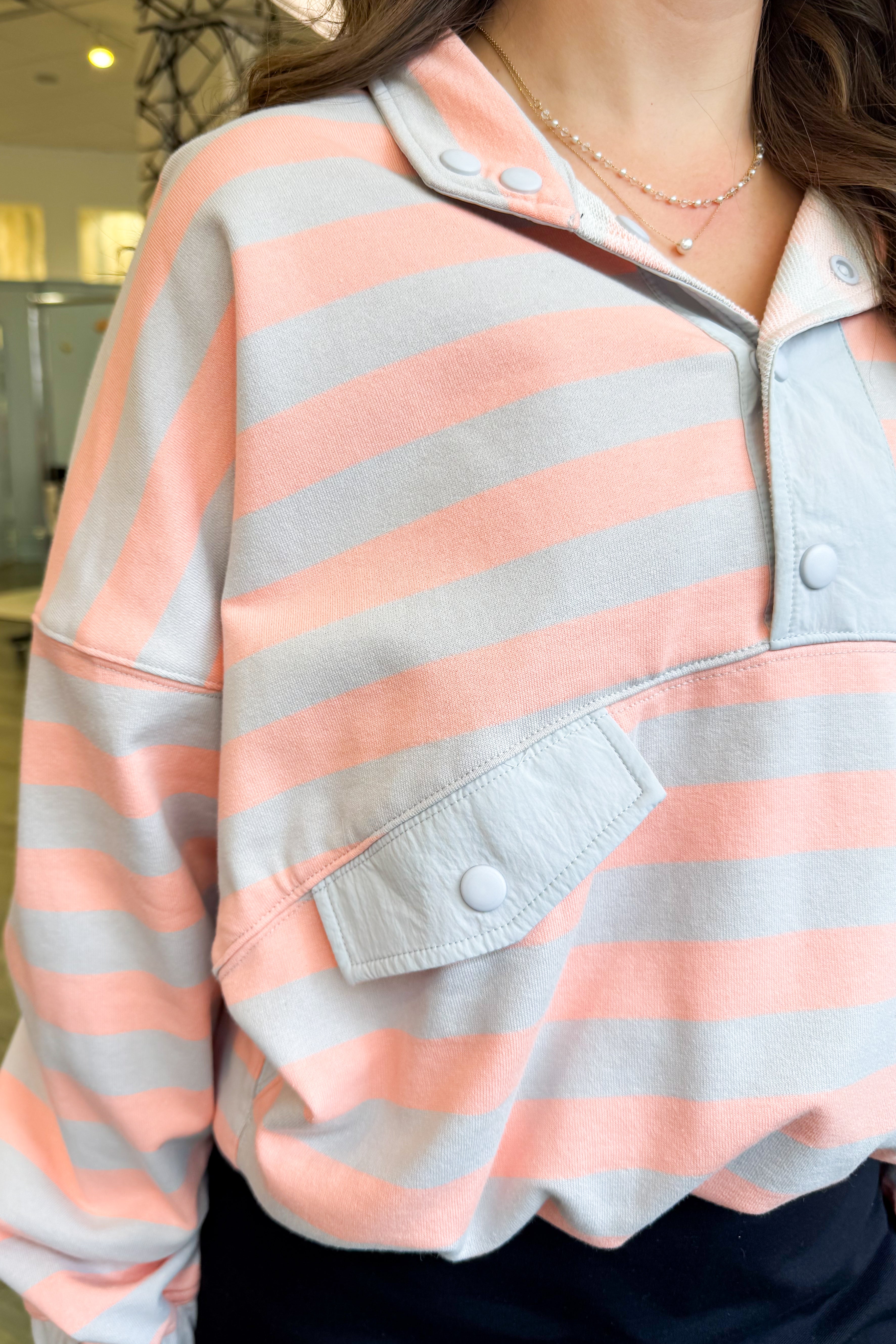 Elevate your casual wardrobe with this refined striped pullover, crafted from luxurious French terry in complementary grey and salmon tones. The semi-button-up design offers versatile styling options, allowing you to adjust coverage and create a polished look effortlessly. Perfectly coordinated to pair with our Solid Sporty Short, this piece seamlessly transitions from relaxed weekends to refined leisure moments. The soft, breathable fabric ensures all-day comfort while maintaining an understated elegance that works across multiple seasons.