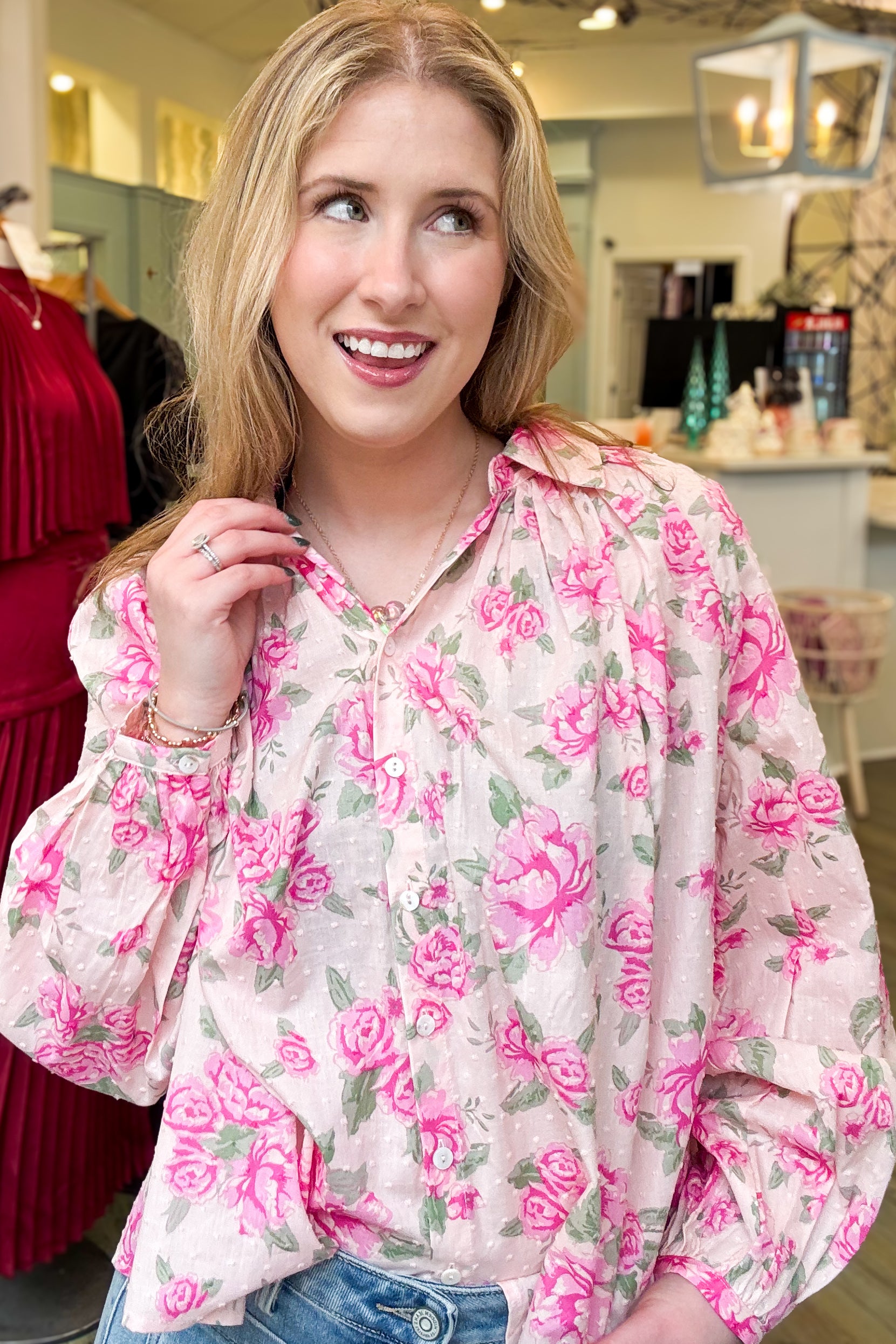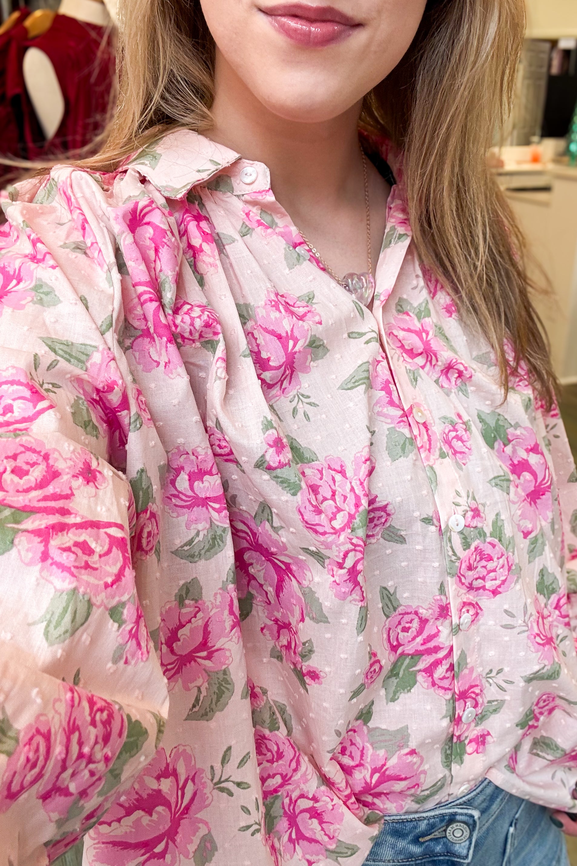 Discover the perfect addition to your closet with this stunning pink floral blouse. The classic button-up front and flowing long sleeves create a flattering silhouette that works beautifully for any occasion—from casual weekends to professional settings. The charming floral print adds personality and visual interest while remaining effortlessly versatile. Invest in a piece that combines timeless appeal with everyday wearability, and you'll reach for it again and again.