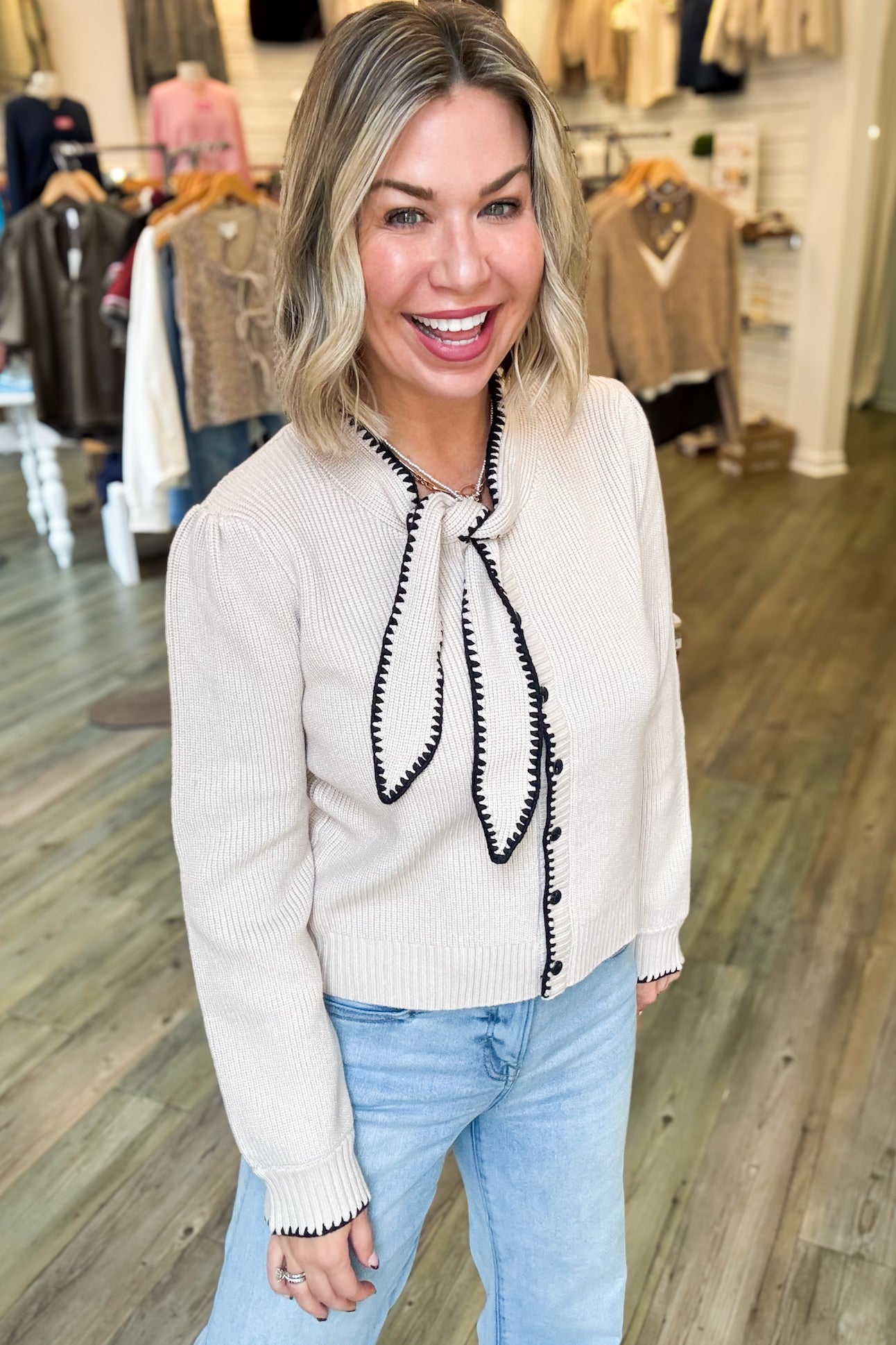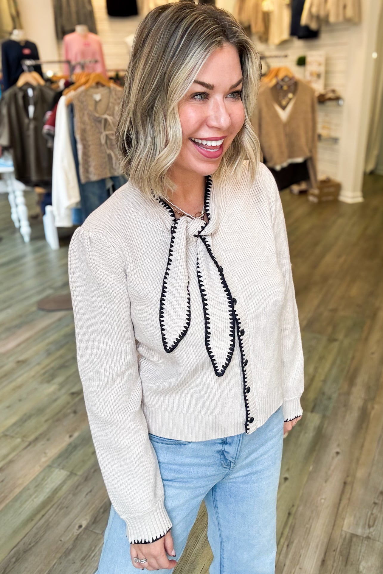 The Presley Sweater Top is your new go-to for effortless style. This sand-colored knit features charming black button and tie details that add just the right amount of personality to your everyday look. Perfect for layering or wearing solo, it's the kind of piece that works as hard as you do—whether you're heading to brunch or the office. Cozy, chic, and ready for anything.