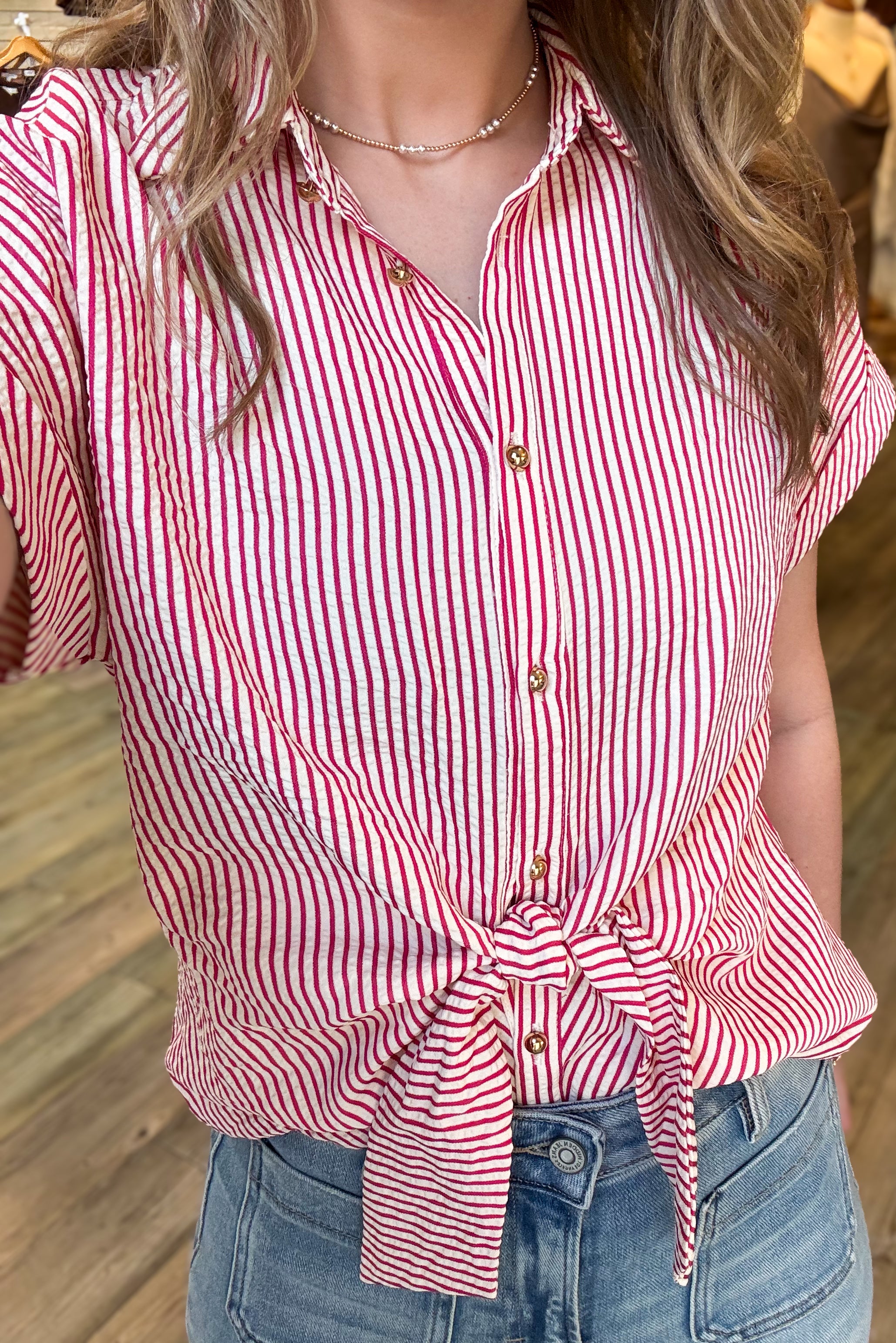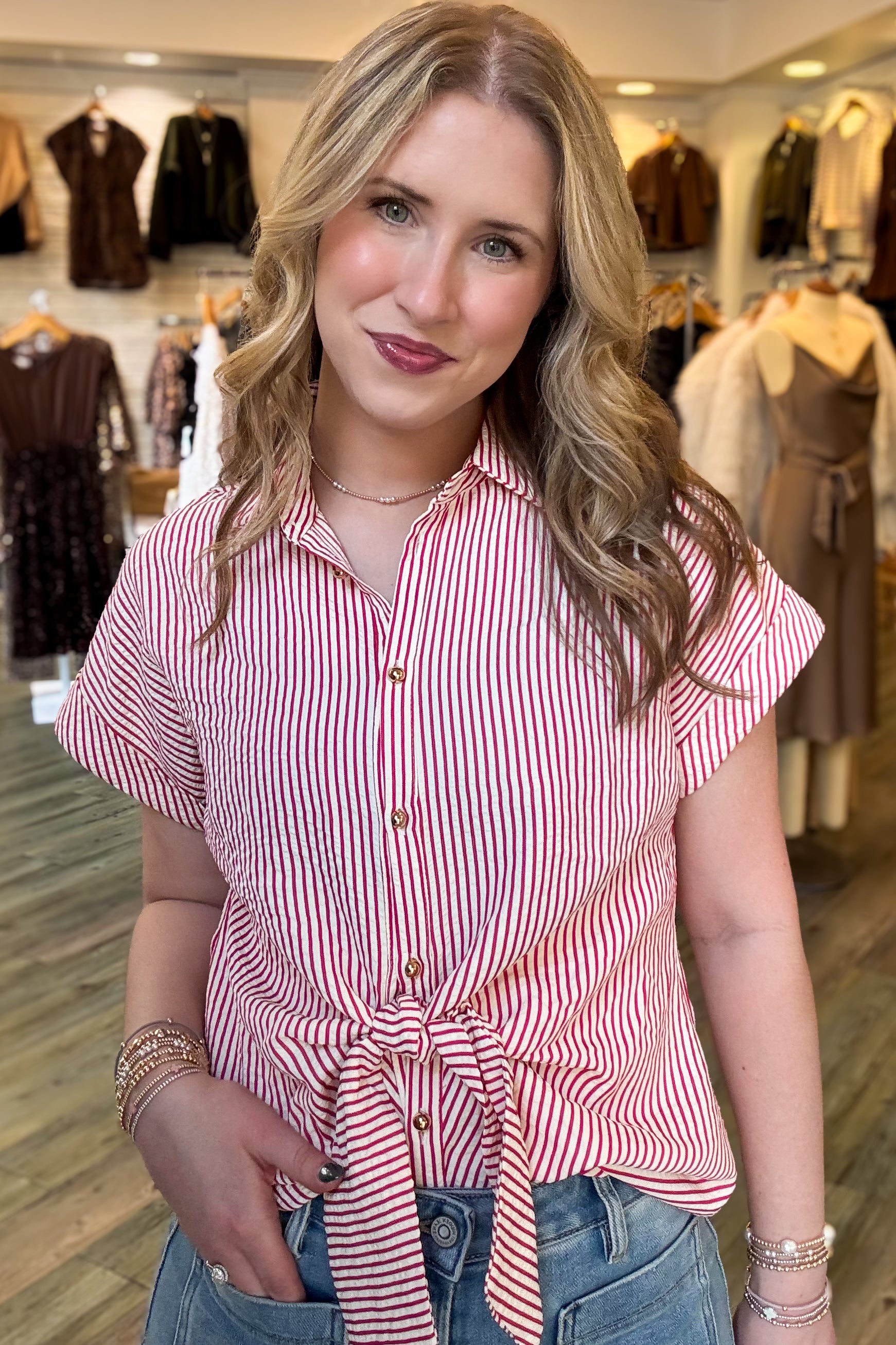 Effortlessly chic and undeniably versatile, this red and white striped blouse brings timeless appeal to your everyday wardrobe. The charming tie front detail adds a playful twist, while the button-down closure offers easy styling options—dress it up for the office or down for casual outings. Short sleeves keep things breezy and comfortable, making it perfect for layering or wearing solo. A wardrobe essential that transitions seamlessly from season to season.