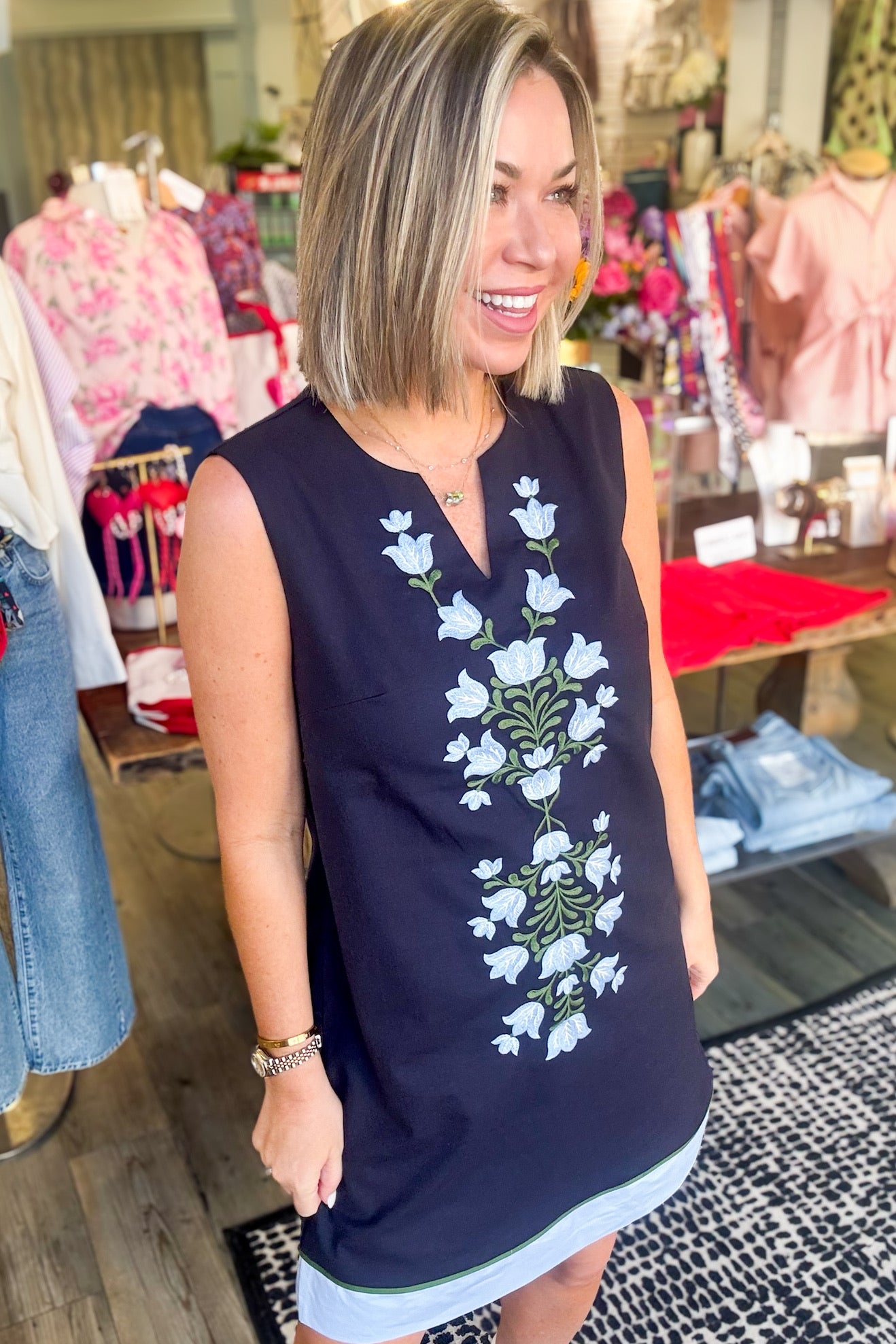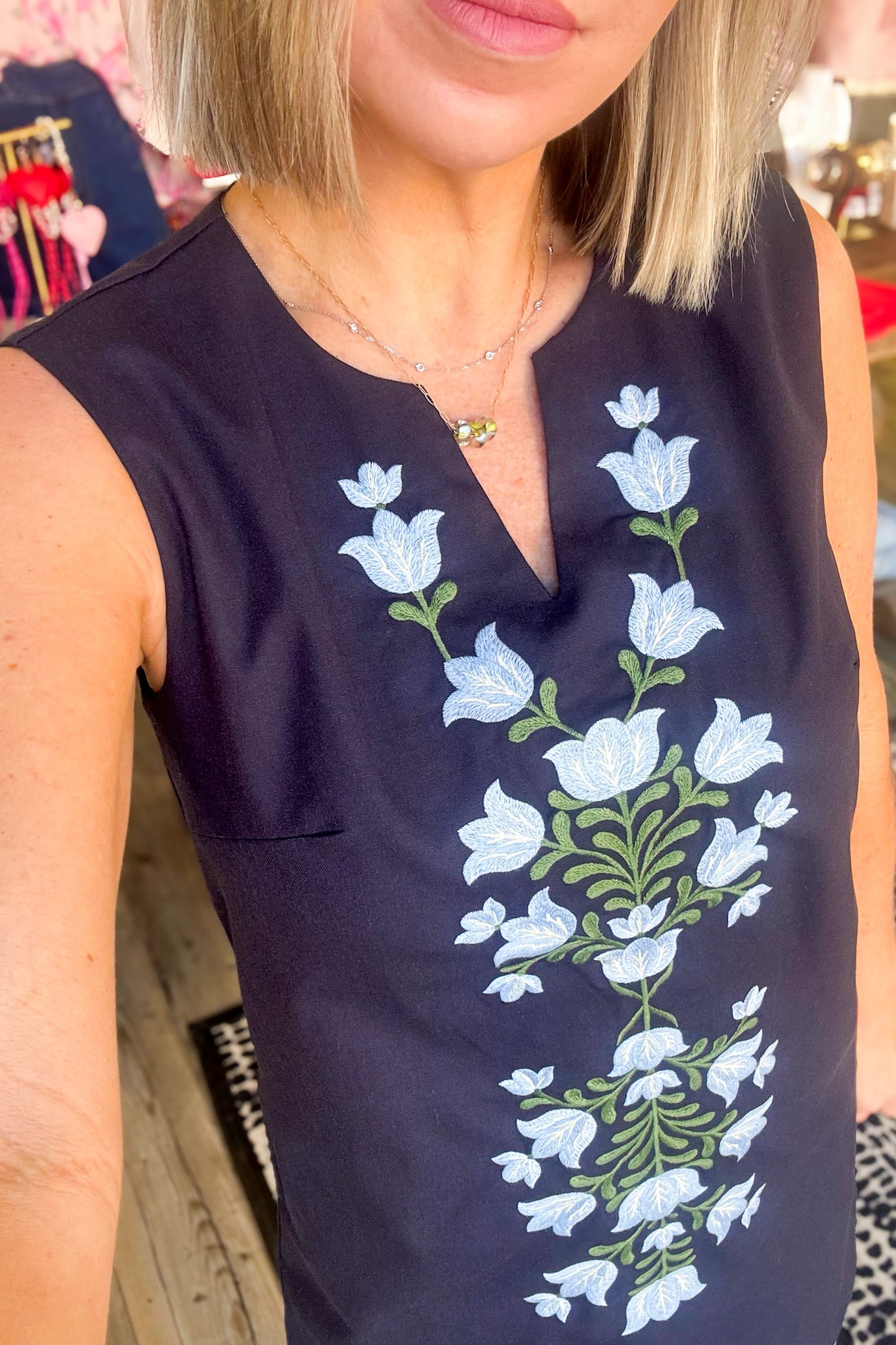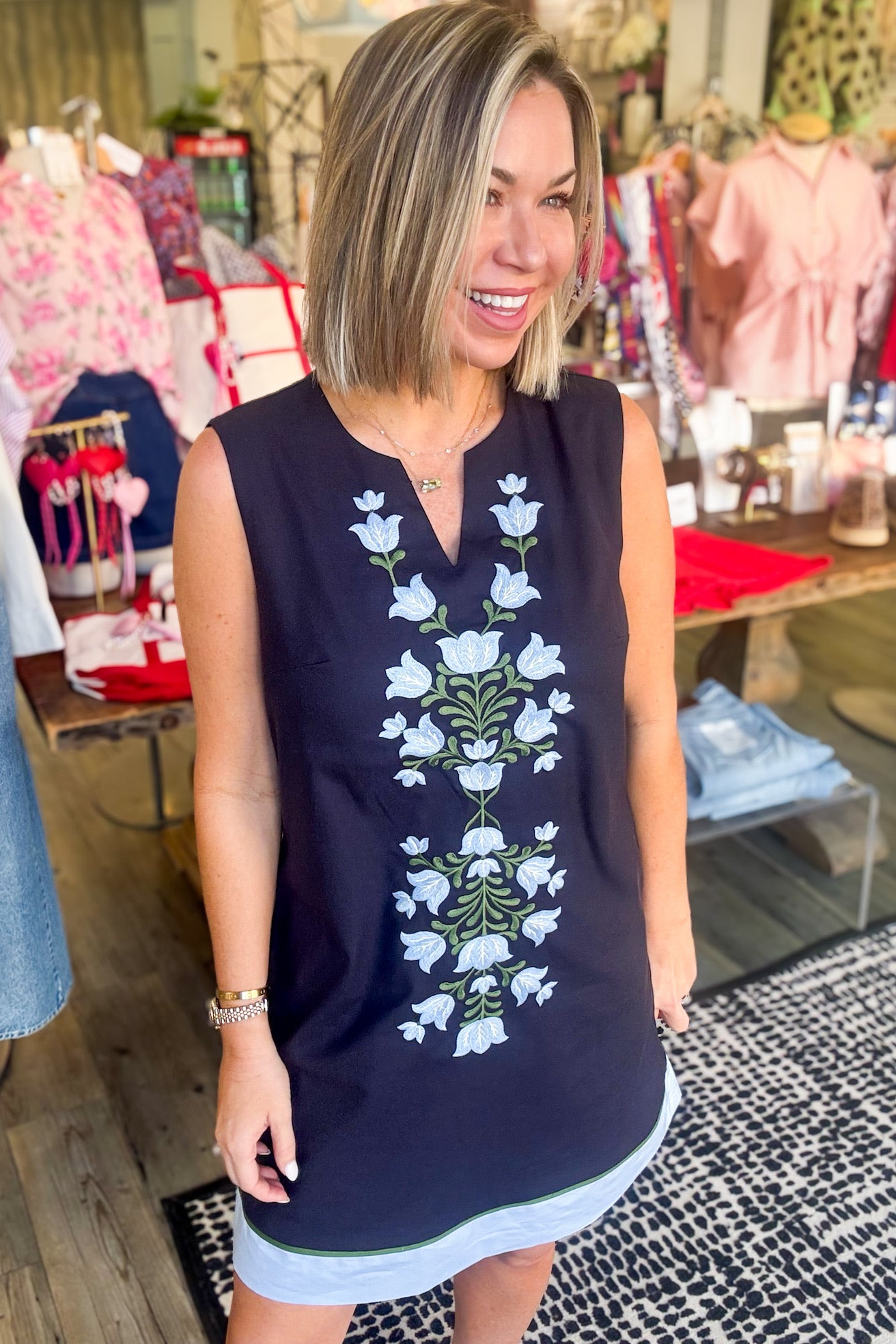 The Frances Embroidered Dress combines timeless elegance with everyday practicality. This sleeveless navy piece features a flattering V-neckline and delicate floral embroidery that adds sophisticated charm. Functional pockets make it as wearable as it is beautiful, perfect for transitioning from brunch to evening events. A versatile wardrobe essential that works beautifully on its own or layered with your favorite cardigan or jacket.