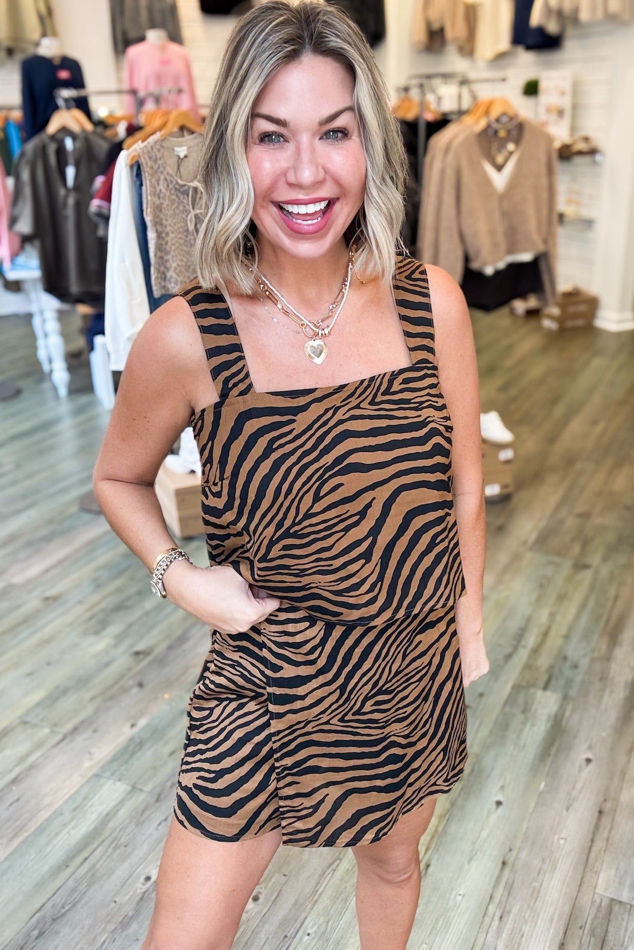 Unleash your wild side with this fierce tiger print set! The asymmetric draped mini wrap skort pairs perfectly with the matching square neck crop top for a bold, coordinated look. Perfect for making a statement at parties, nights out, or whenever you're ready to turn heads. This playful two-piece combo brings serious attitude and style to your wardrobe.
