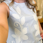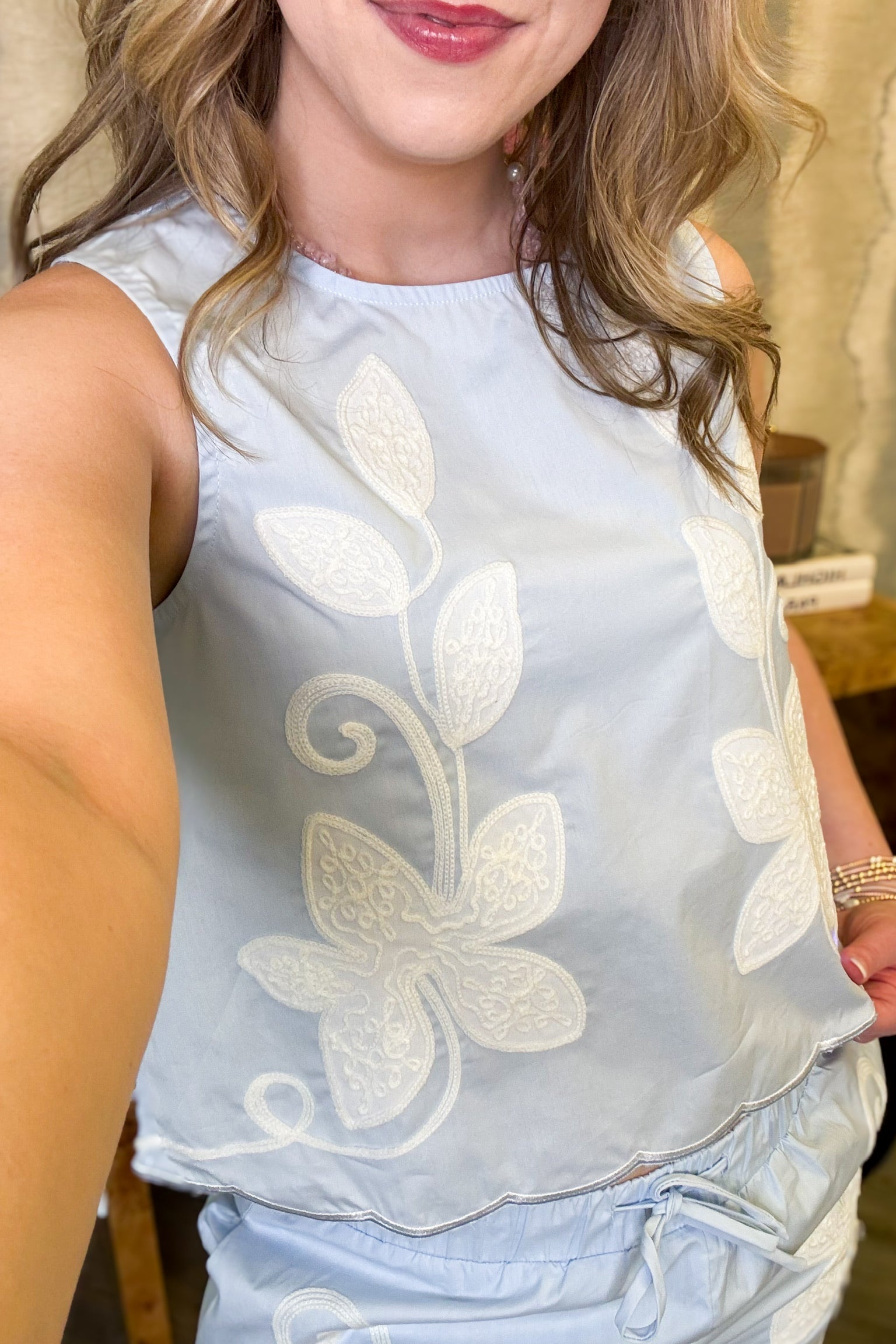 The Catherine Floral Embroidered Scallop Top exemplifies refined elegance with its soft light blue palette and intricate floral embroidery detailing. The distinctive double line scallop neckline creates a polished silhouette that elevates any ensemble. Crafted with attention to detail, this piece seamlessly coordinates with the matching Catherine Floral Embroidered Scallop shorts, allowing you to create a cohesive, curated look. Perfect for those who appreciate timeless design and understated sophistication.