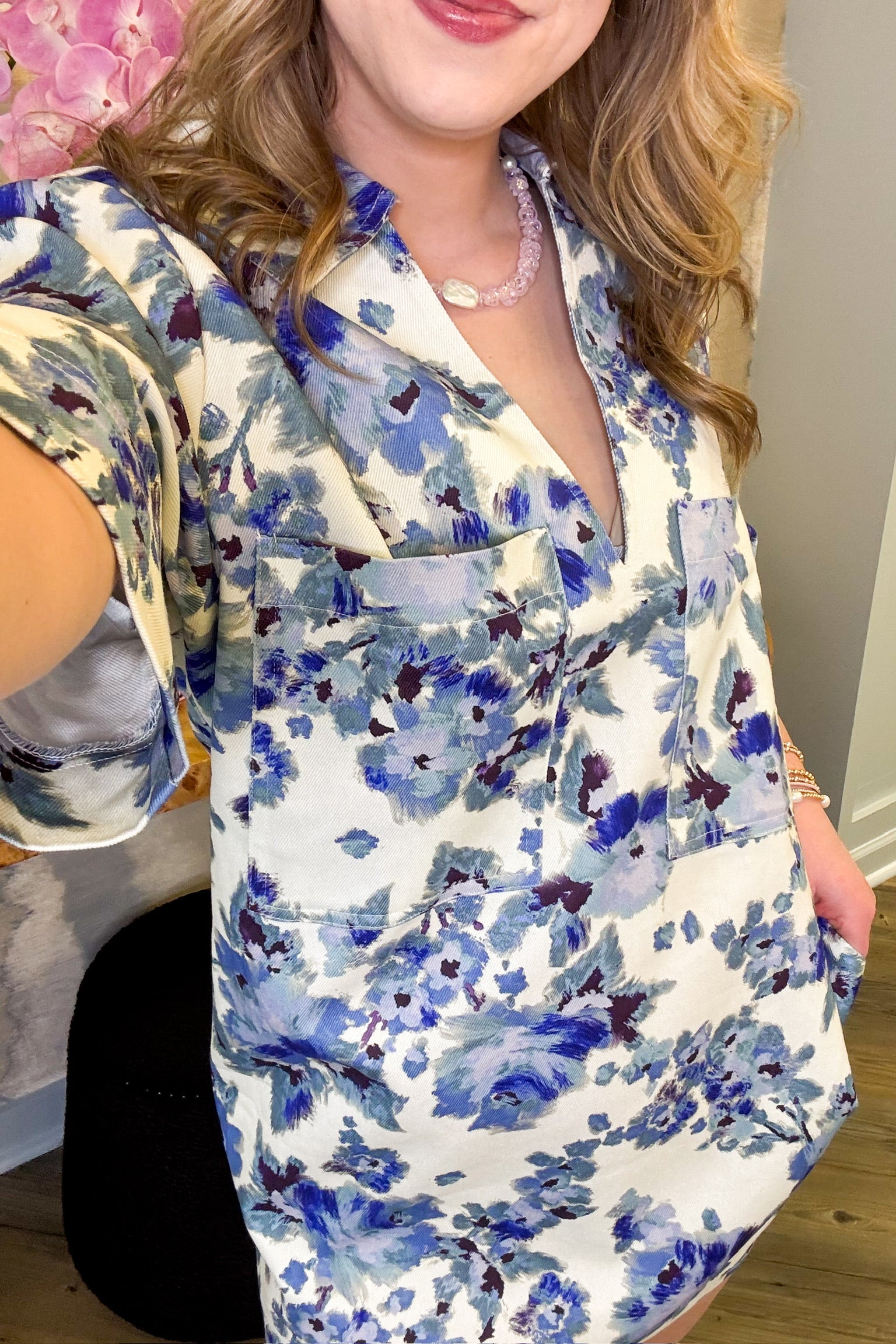 Twirl into spring with the Pasha Floral Dress, a charming blue floral number that's equal parts fun and functional. The flattering deep V-neckline and crisp collar create an effortlessly chic look, while the short sleeves keep things breezy. Practical front chest pockets and waist pockets mean you can finally carry your essentials without a bag—because who needs one when you've got style and storage? Perfect for casual outings or weekend adventures.