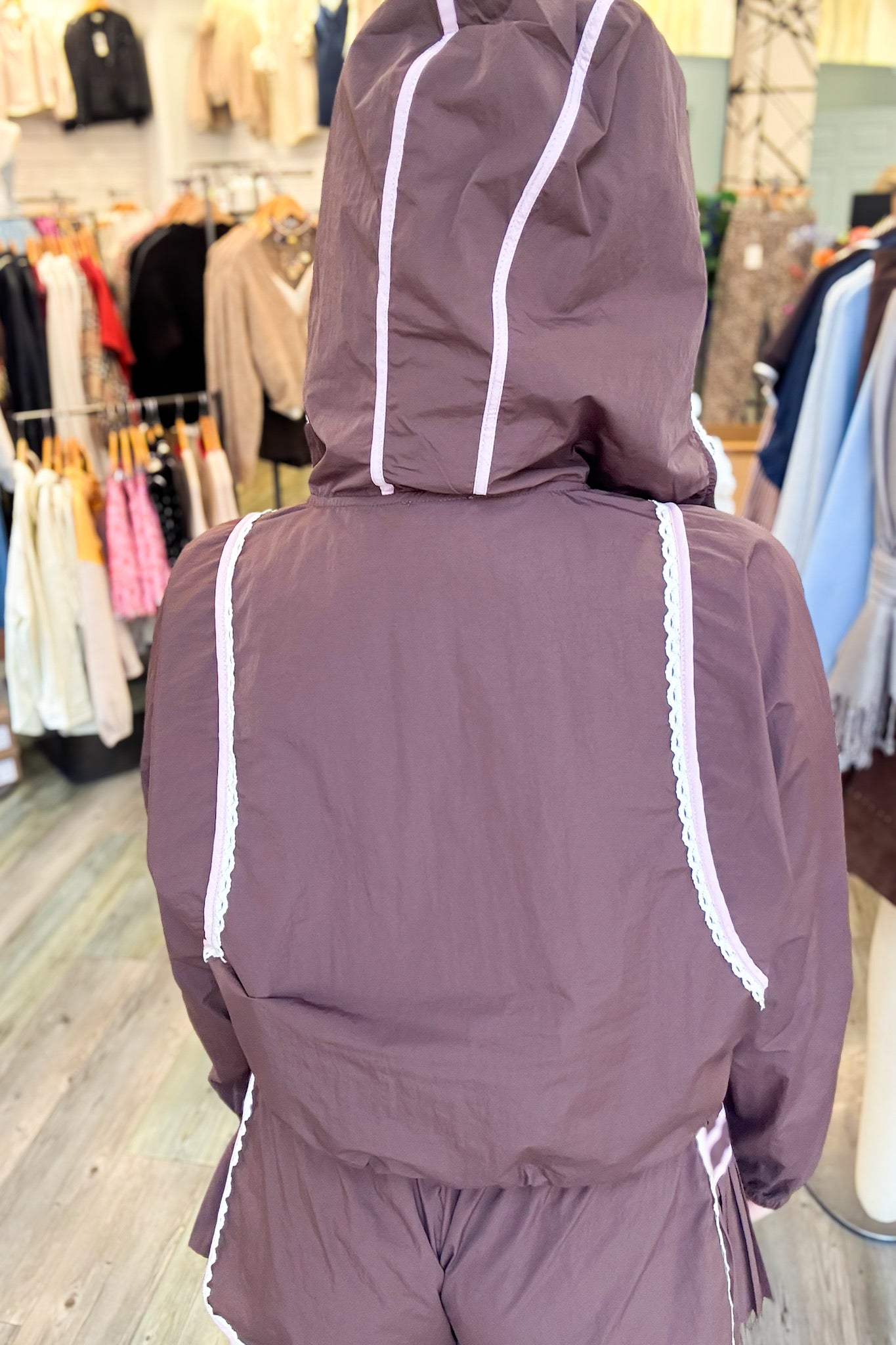 The Monica Windbreaker Set brings effortless style with its rich brown hue and charming design details. This windbreaker features delicate binding accents and a playful scallop edge trim that adds personality to your everyday look. Perfect for layering on breezy days or throwing on for a quick outdoor adventure, it's the kind of piece that makes getting dressed fun. Lightweight and versatile, the Monica pairs beautifully with your favorite basics for a polished finish.