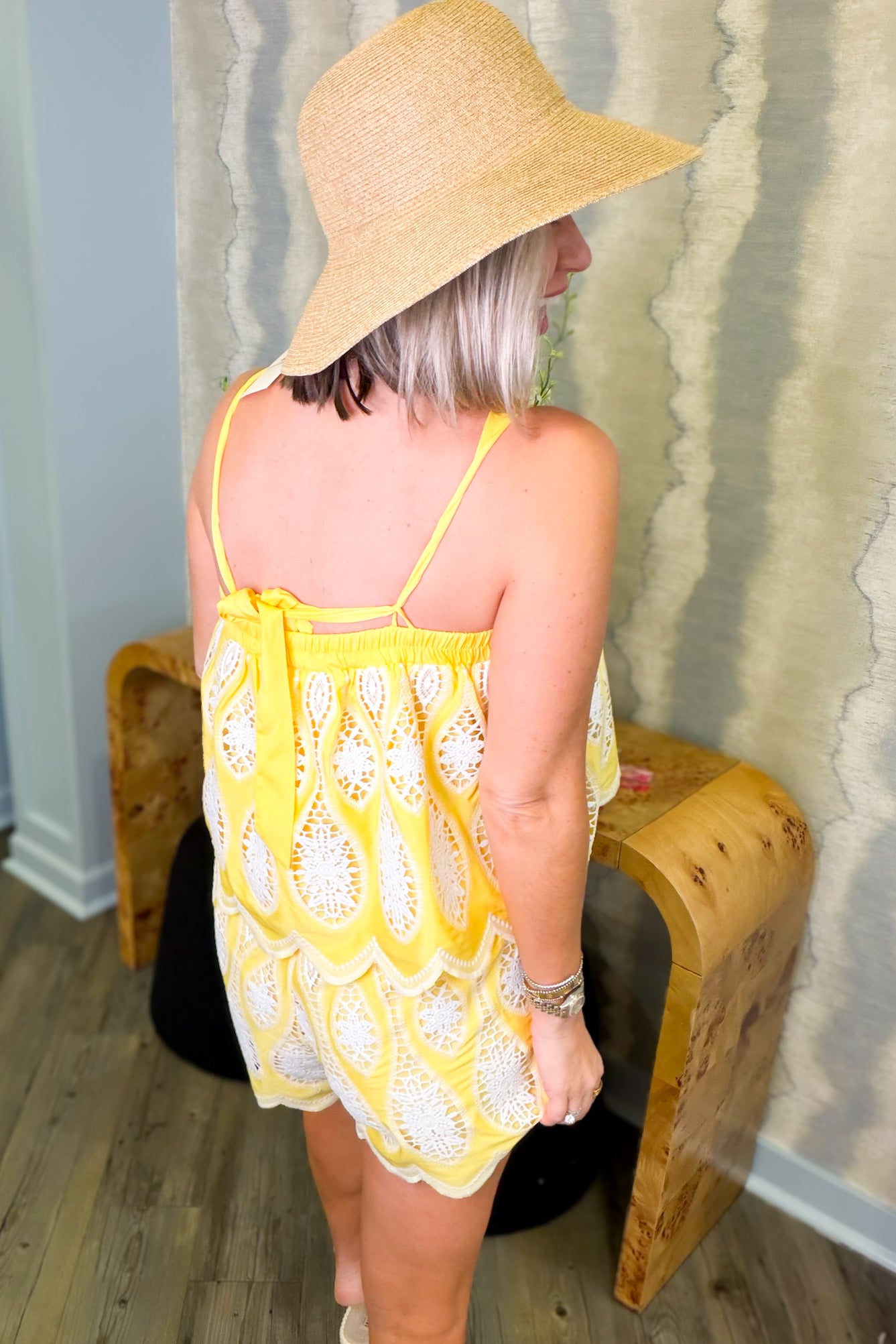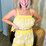 Brighten your wardrobe with this cheerful two-piece set! The crop top features vibrant yellow embroidered details and a charming back tie that adds a flirty touch. Pair it with the matching shorts, complete with a comfortable elastic waistband and functional pockets—because style shouldn't mean sacrificing practicality. Perfect for sunny days and carefree vibes, this set brings instant joy to your everyday look.