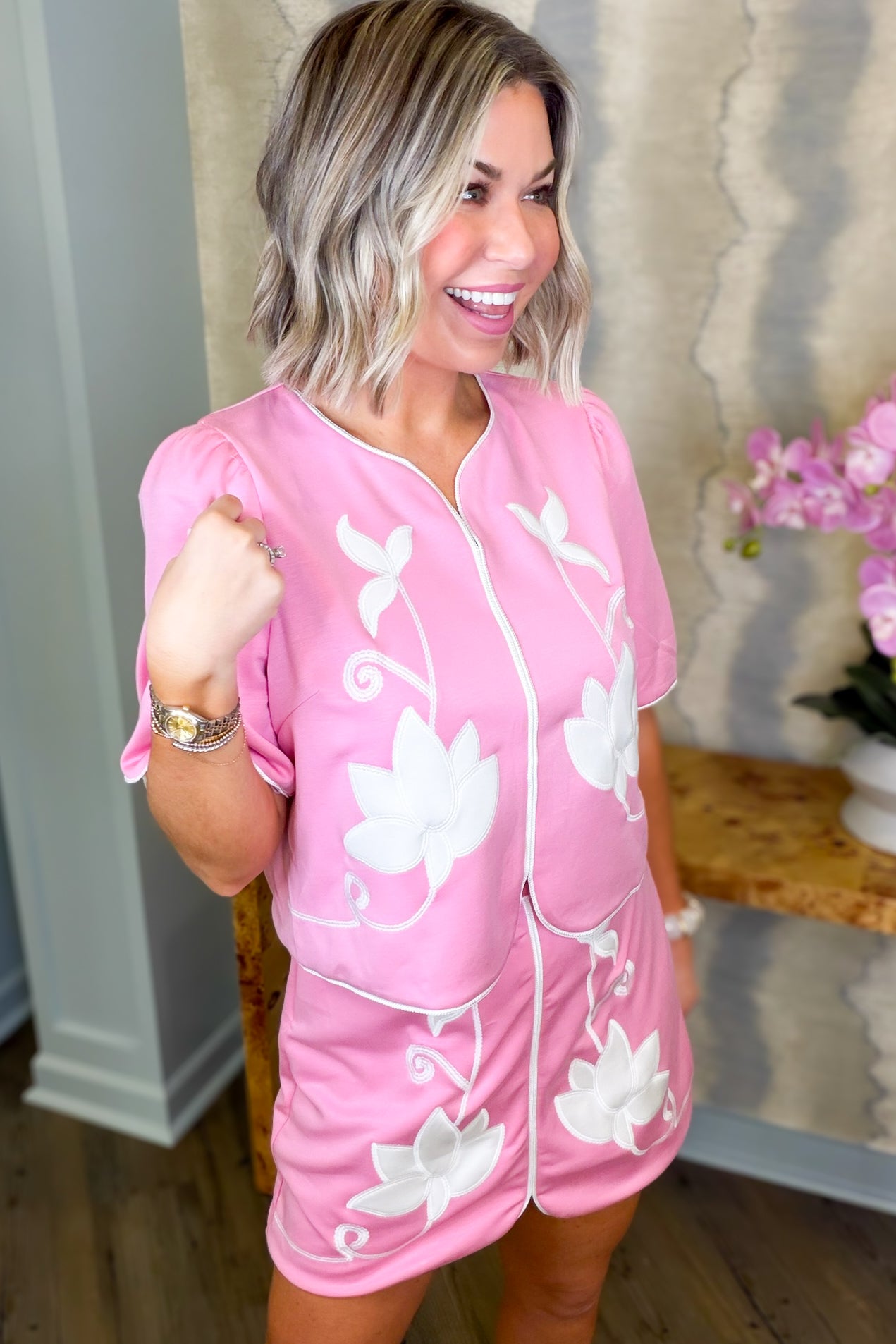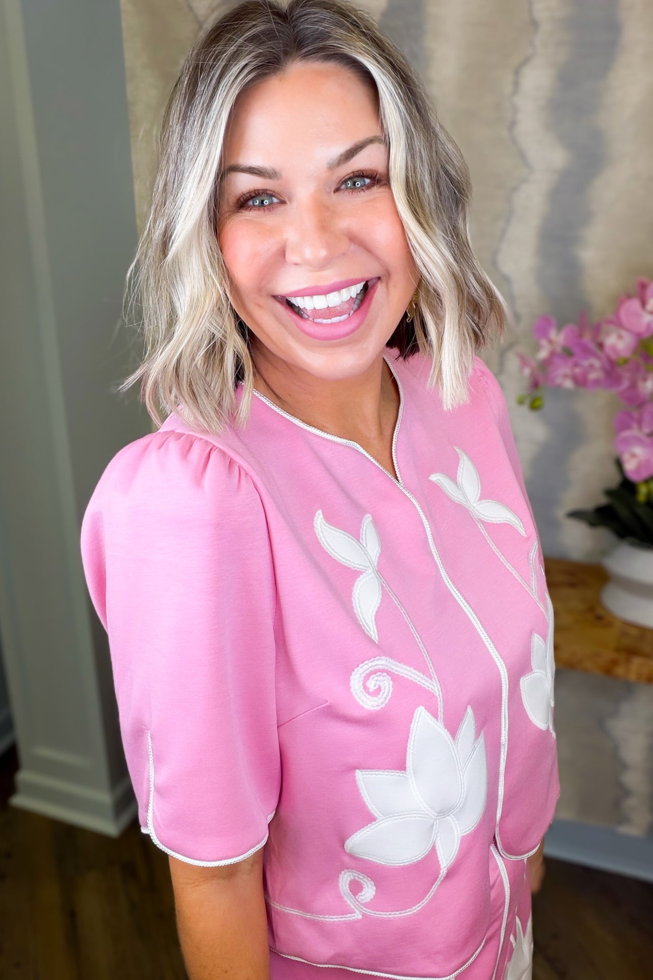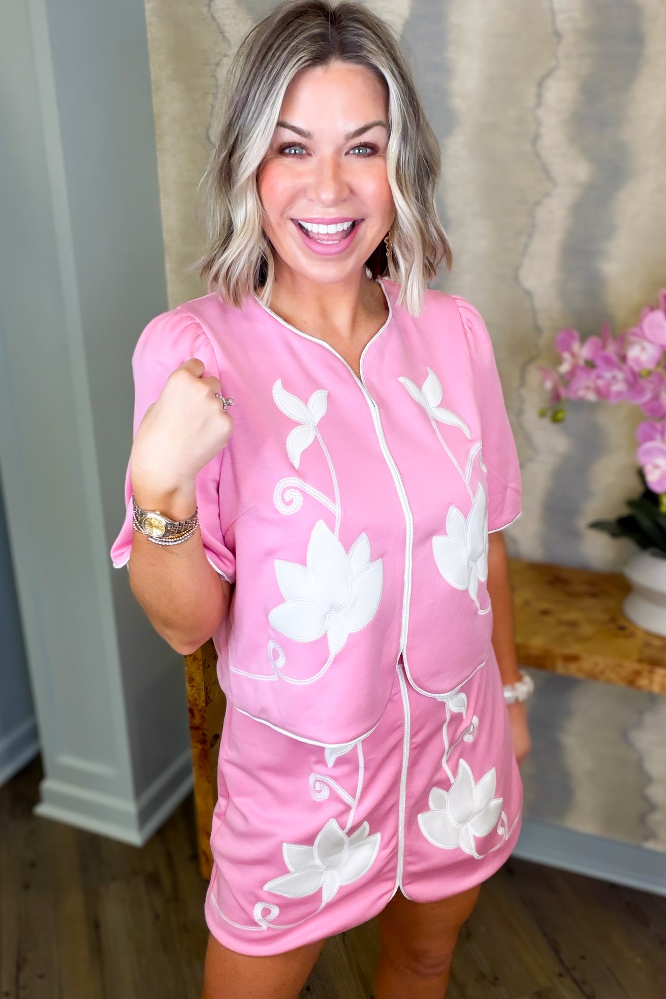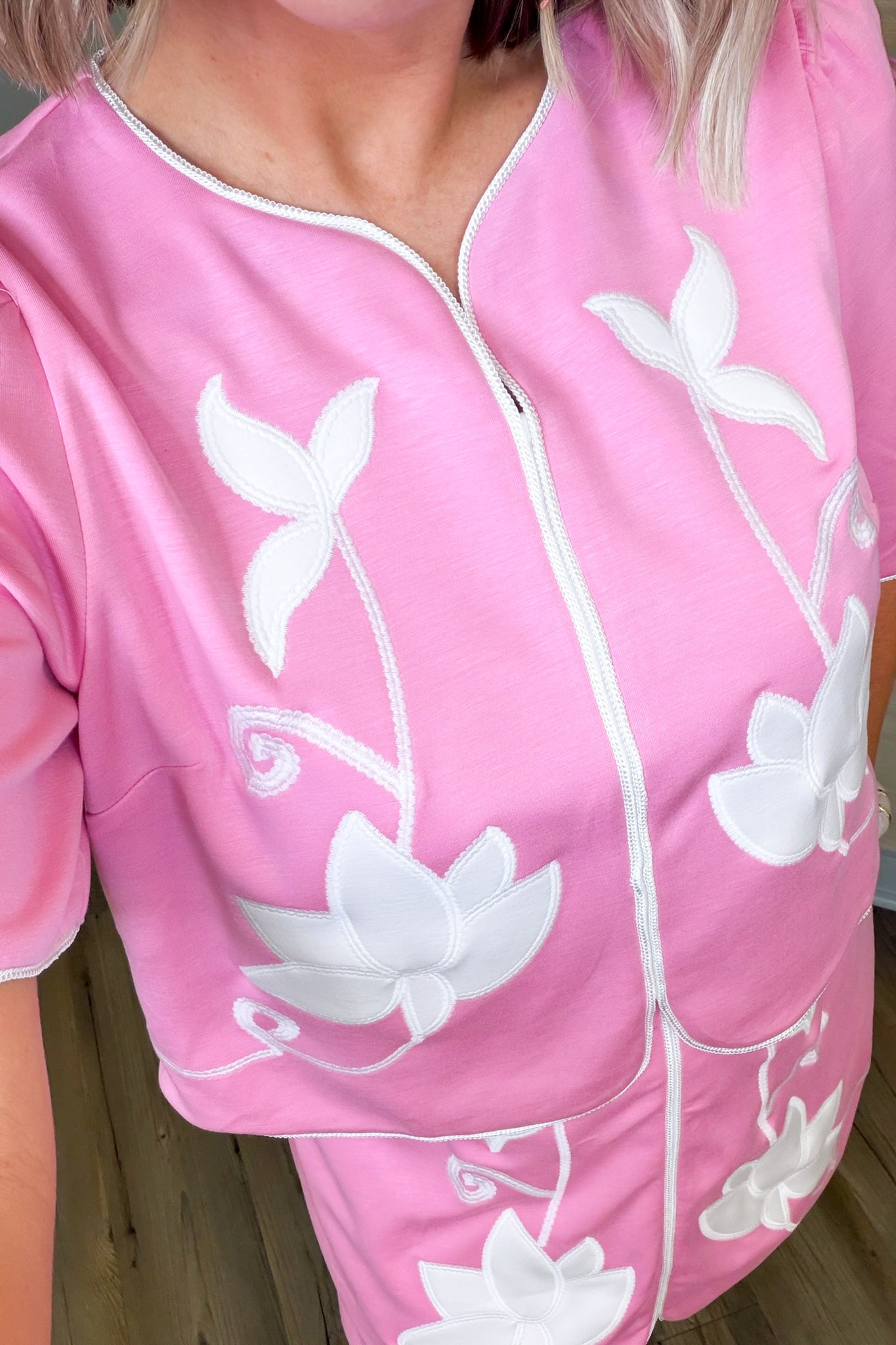 Say hello to effortless style with this delightful pink top! Adorned with charming floral embroidery, it features a flattering v-neckline and a practical back half zip for those moments when you want to mix things up. Designed to coordinate perfectly with the Callie Pink Skort, this piece is your ticket to a put-together look that feels anything but boring. Playful, feminine, and totally you.