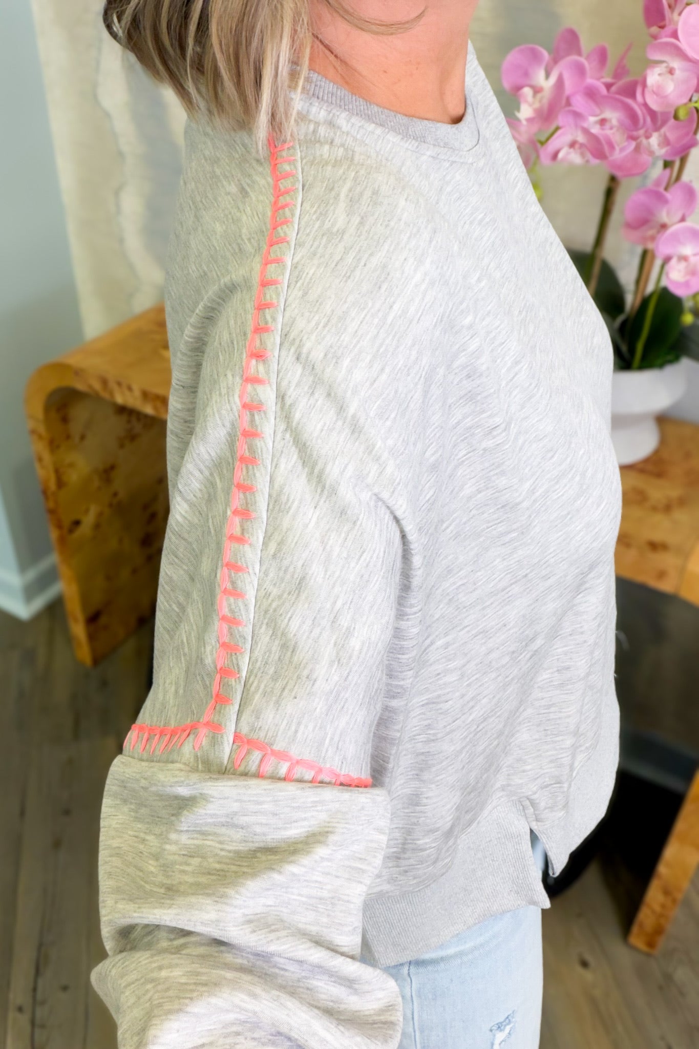 Rock a look that's anything but boring with this grey crewneck sweatshirt that's got serious personality. Hot pink stitching pops against the neutral base, creating eye-catching contrast details throughout, while cheeky front slits keep things fresh and fashion-forward. Whether you're keeping it chill or dressing it up, this sweatshirt proves that comfort and style are the ultimate power couple.