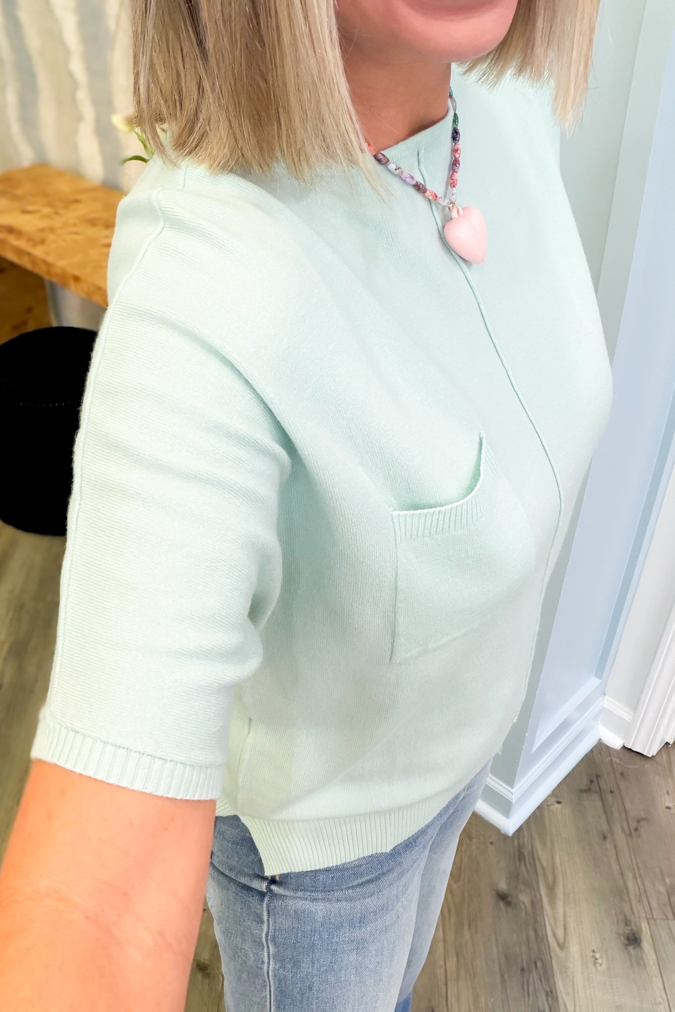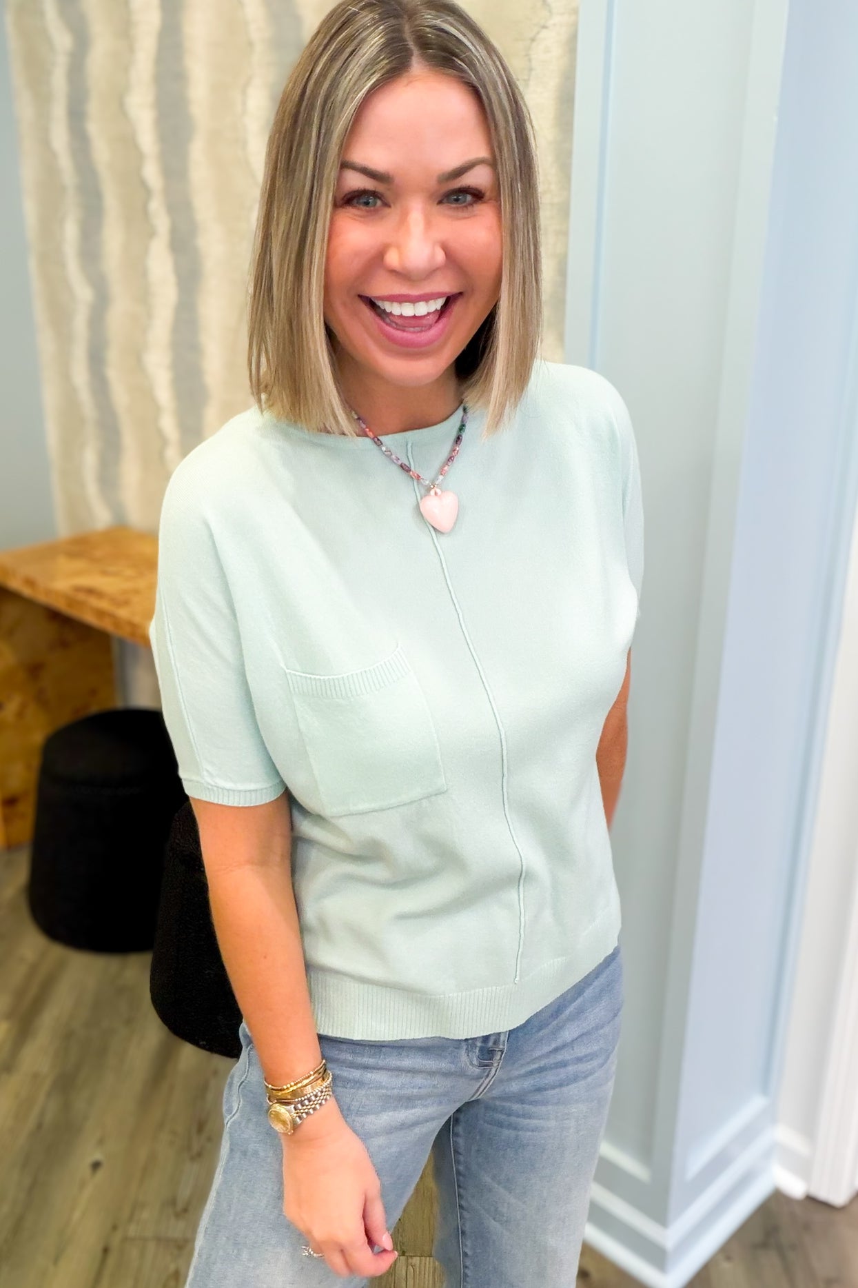 Slip into pure comfort with this mint-hued short-sleeve tee that feels like a cloud against your skin. The super soft fabric makes it your new go-to for casual days, while the handy front pocket adds a practical touch of style. Perfect for layering or wearing solo, this playful piece brings a fresh pop of color to any wardrobe.