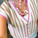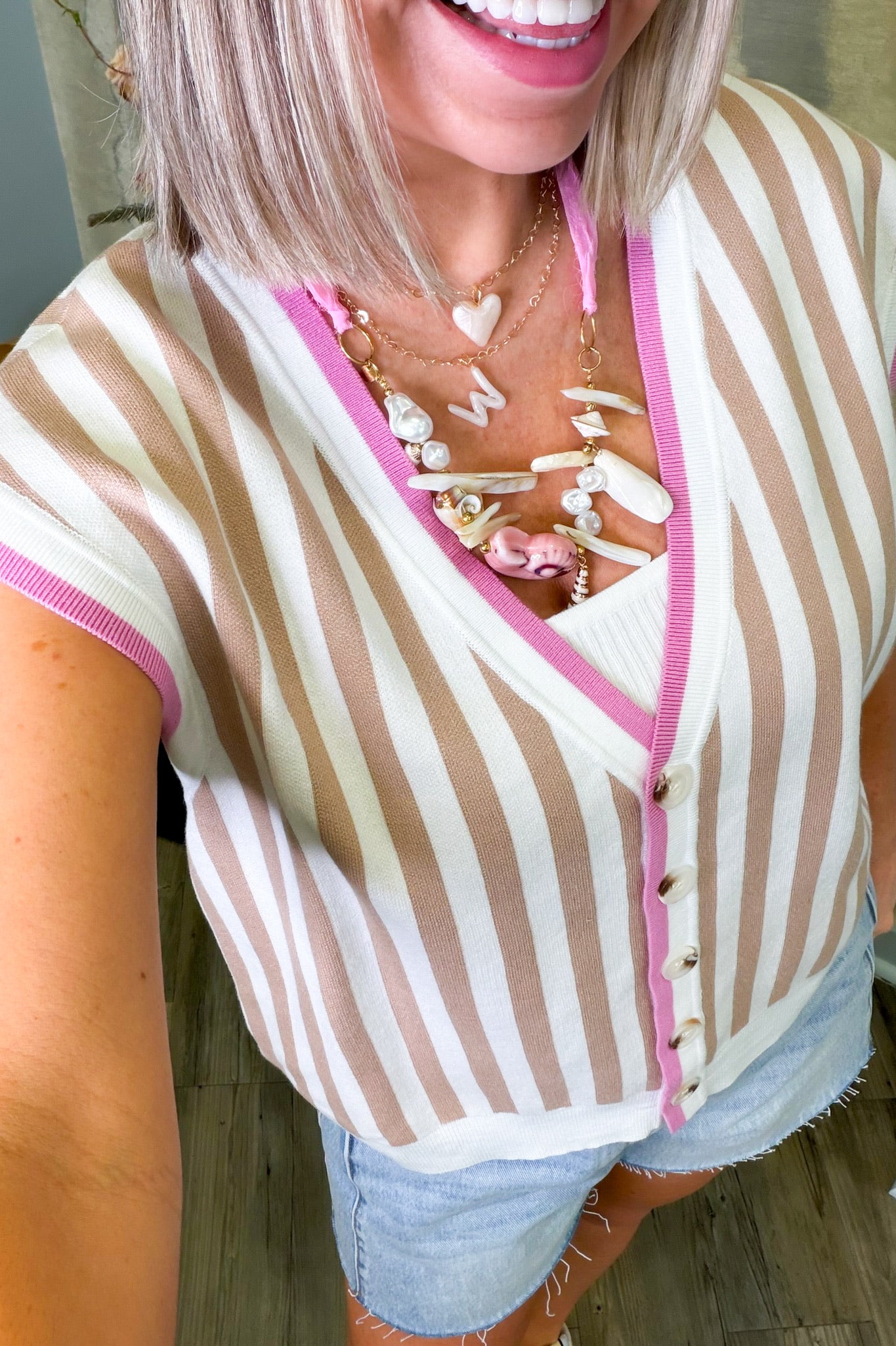 Stripes meet sophistication in this lightweight Piper vest! Mocha and cream bands create effortless visual interest, while the unexpected pop of pink lining adds a playful surprise when you move. Perfect for layering over your favorite tees or dresses, this breezy piece transitions seamlessly from casual coffee runs to weekend adventures. Lightweight construction keeps you comfortable without the bulk, making it an instant wardrobe essential for any season.