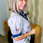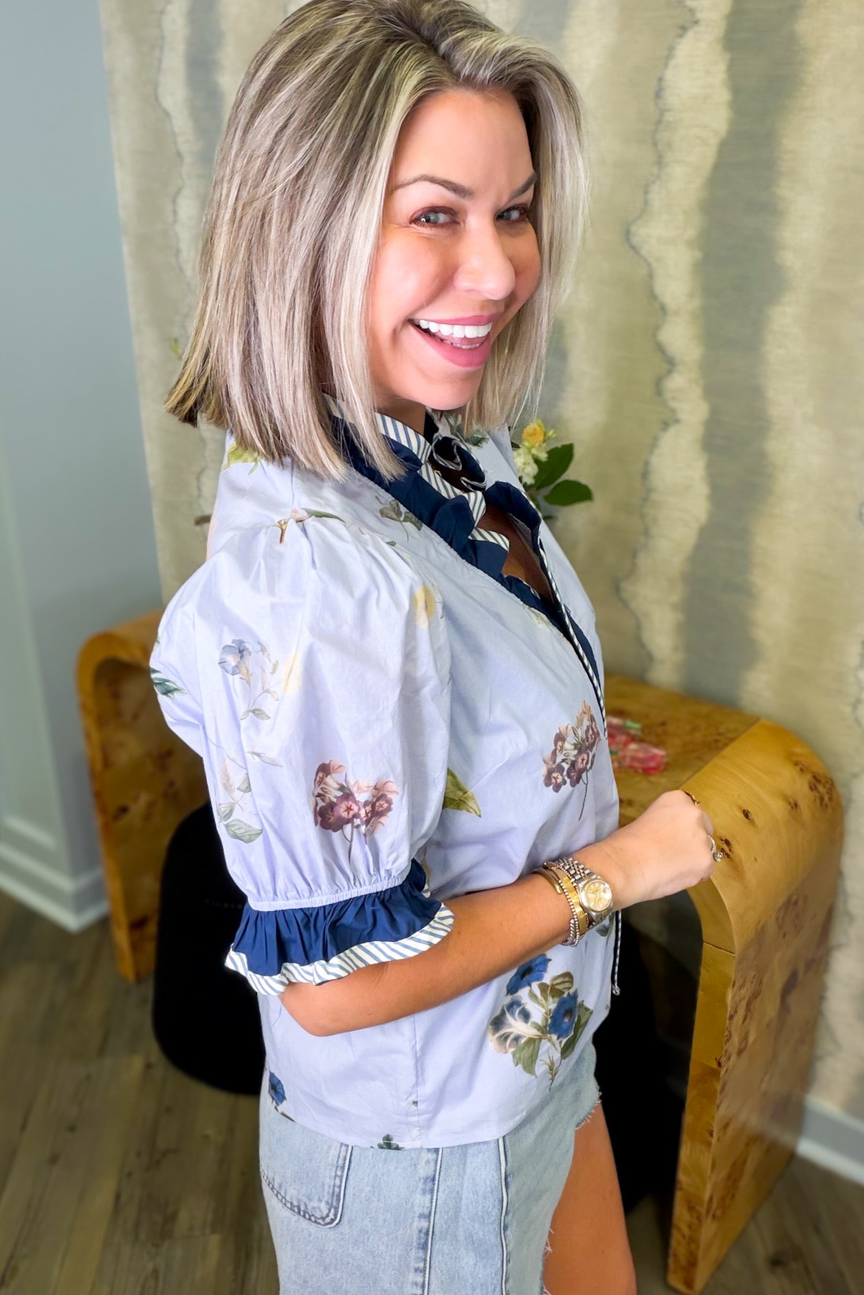 Flirt with spring in this charming babydoll blouse that's equal parts sweet and chic. Soft blue fabric blooms with delicate floral detailing, while crisp stripes run down the center and frame the sleeves for a playful contrast. The relaxed silhouette skims your frame beautifully, and it runs true to size for an effortless fit. Perfect for pairing with your favorite denim or tucking into a skirt for instant polish.
