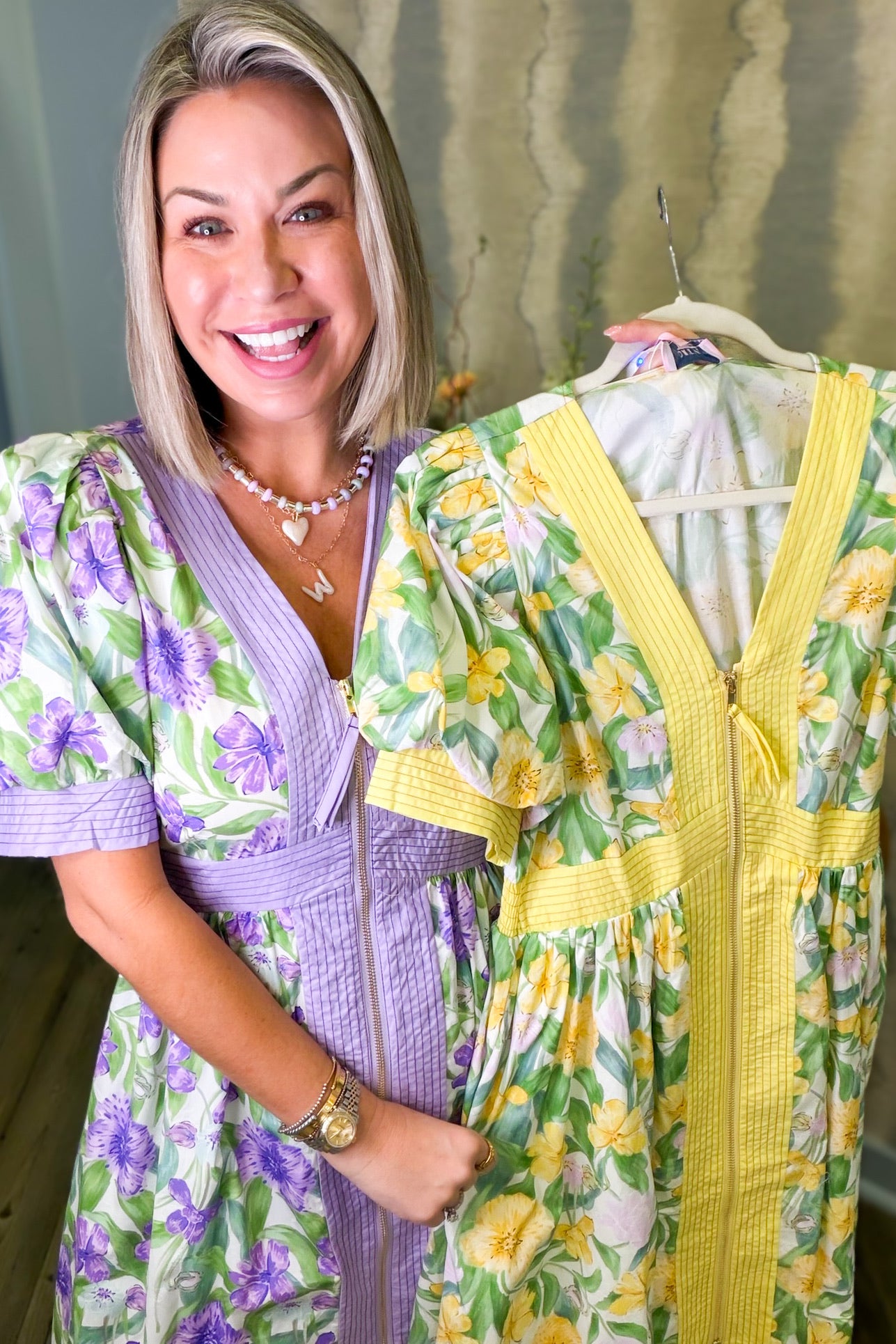 Brighten your wardrobe with this cheerful yellow floral midi dress that's bursting with personality. The playful babydoll sleeves add a touch of whimsy, while intricate stitching details showcase quality craftsmanship throughout. A convenient front zip-up closure makes getting dressed effortless, and the true-to-size fit ensures a perfect silhouette every time. Perfect for spring outings, garden parties, or whenever you want to radiate sunshine and joy.