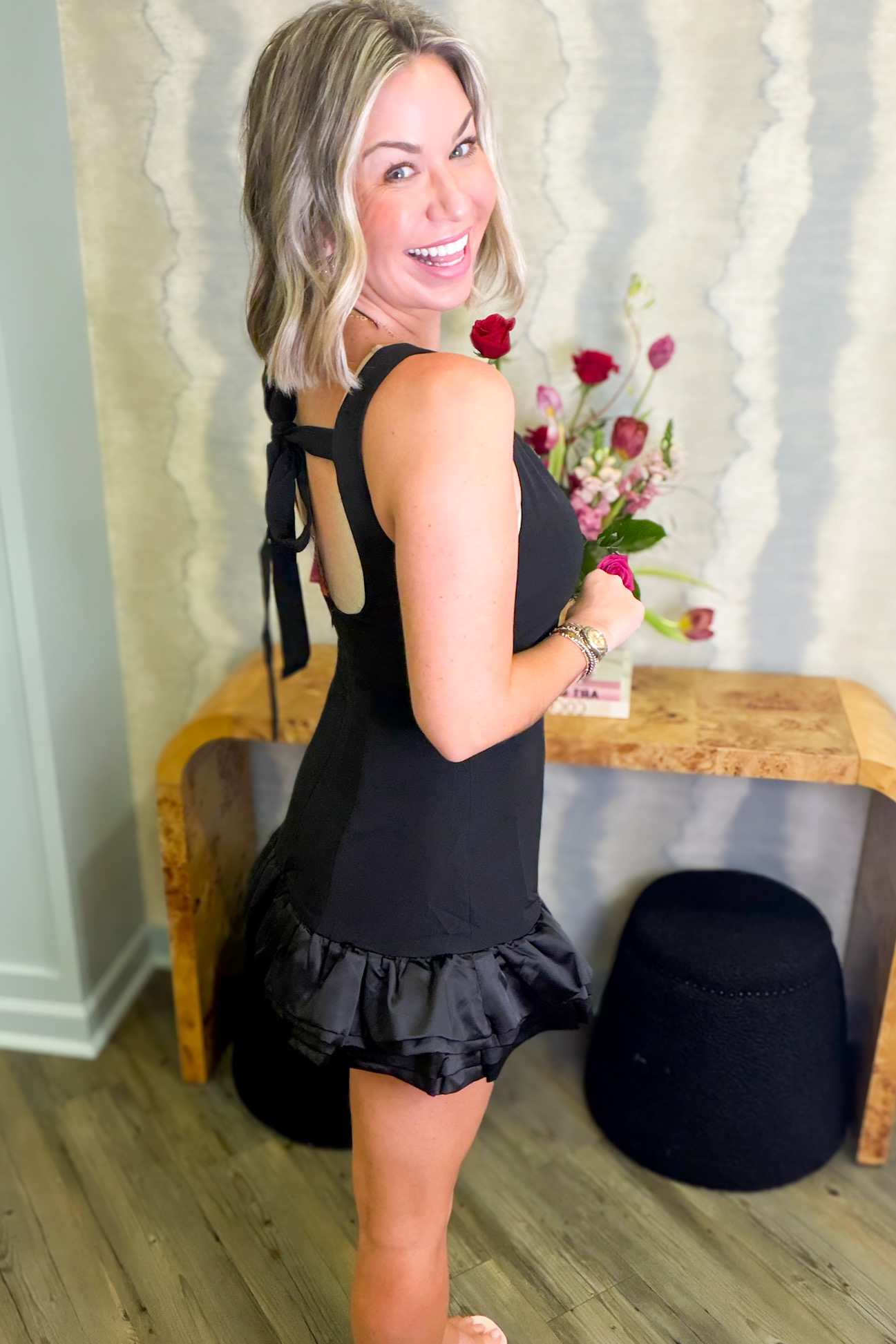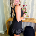 Strike a pose in this playful black romper that's all about the details! The ruffled bottom adds a flirty touch while the tie-back design lets you show off your style from every angle. A convenient back zipper makes getting dressed effortless, so you can spend less time fussing and more time having fun. Perfect for date night, brunch, or whenever you want to feel confident and cute.