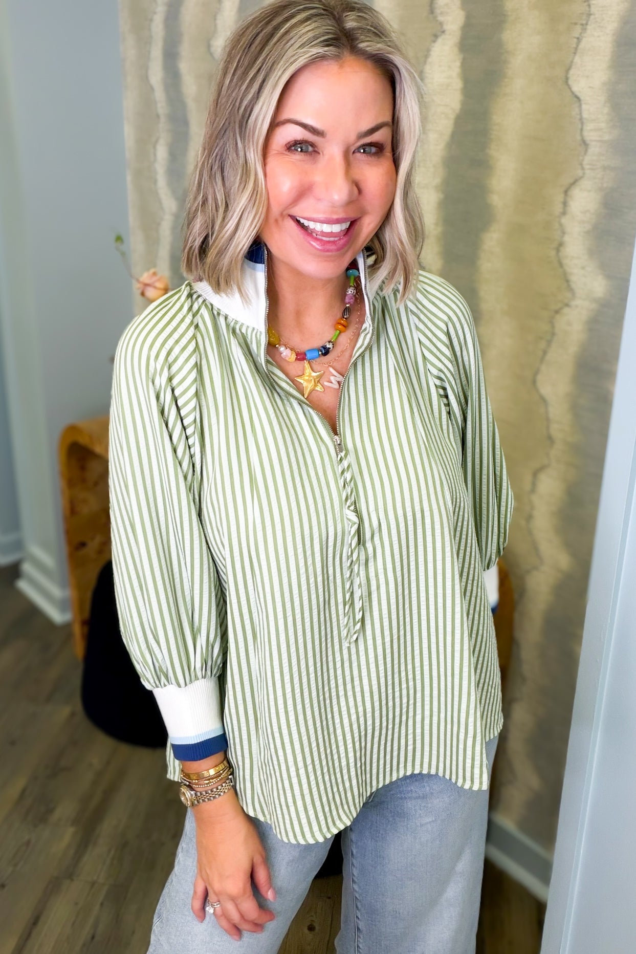 Stripes never go out of style—especially when they're this fresh! This green striped blouse features a half zip for easy layering and breezy adjustability. The 3/4 sleeves hit just right, giving you that effortless, put-together vibe without trying too hard. True to size, so you can grab your usual fit and call it a day. Perfect for everything from casual Fridays to weekend adventures.