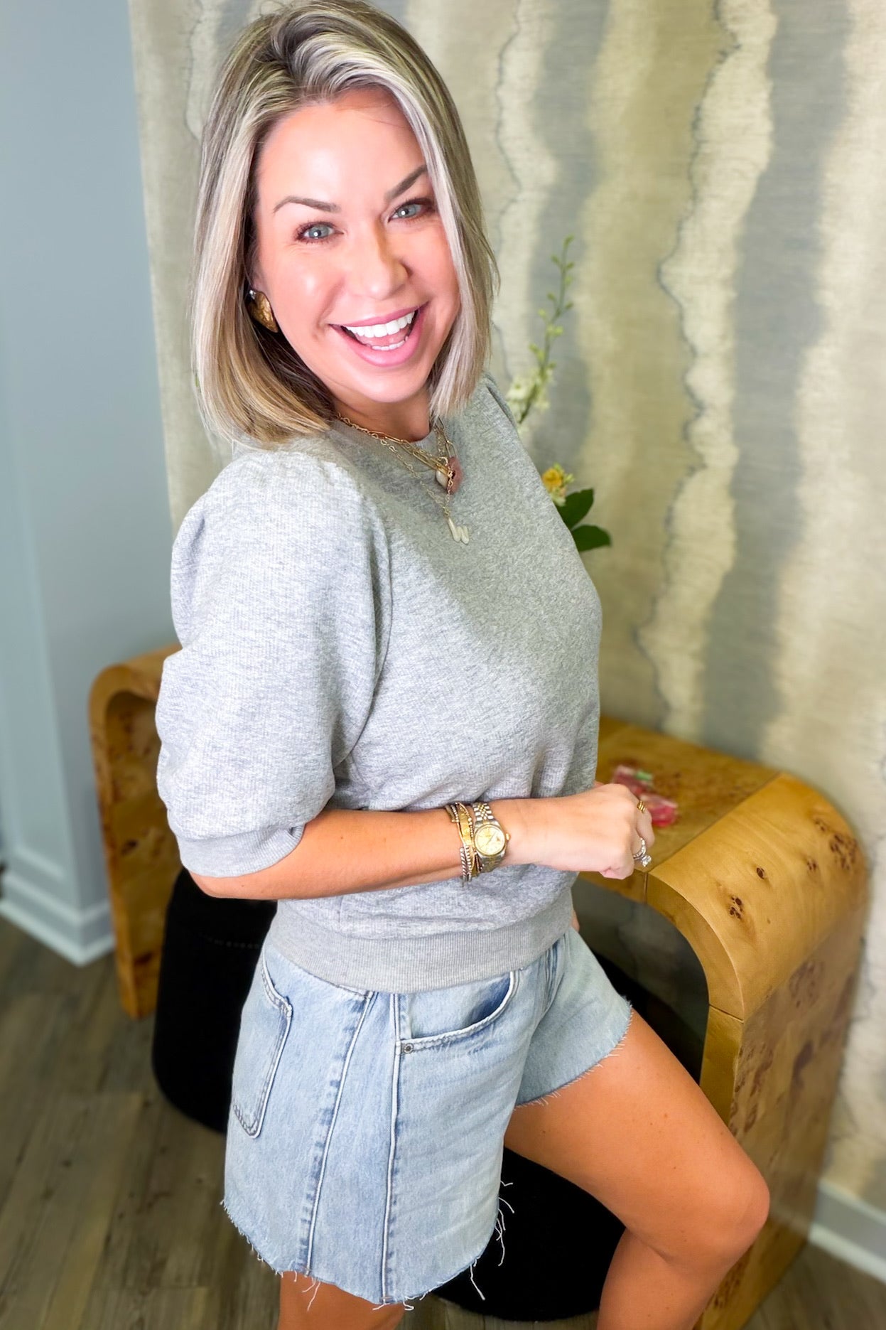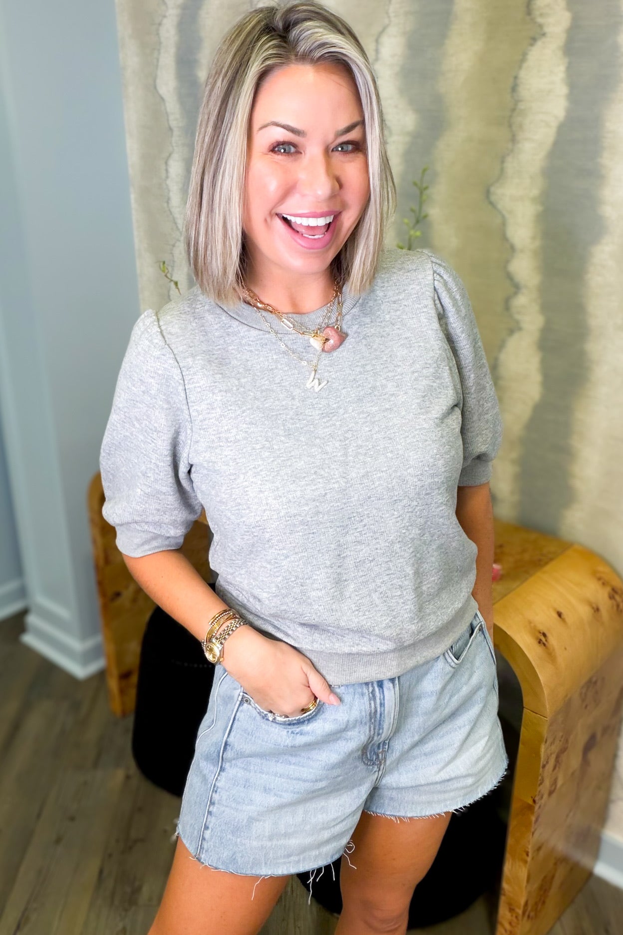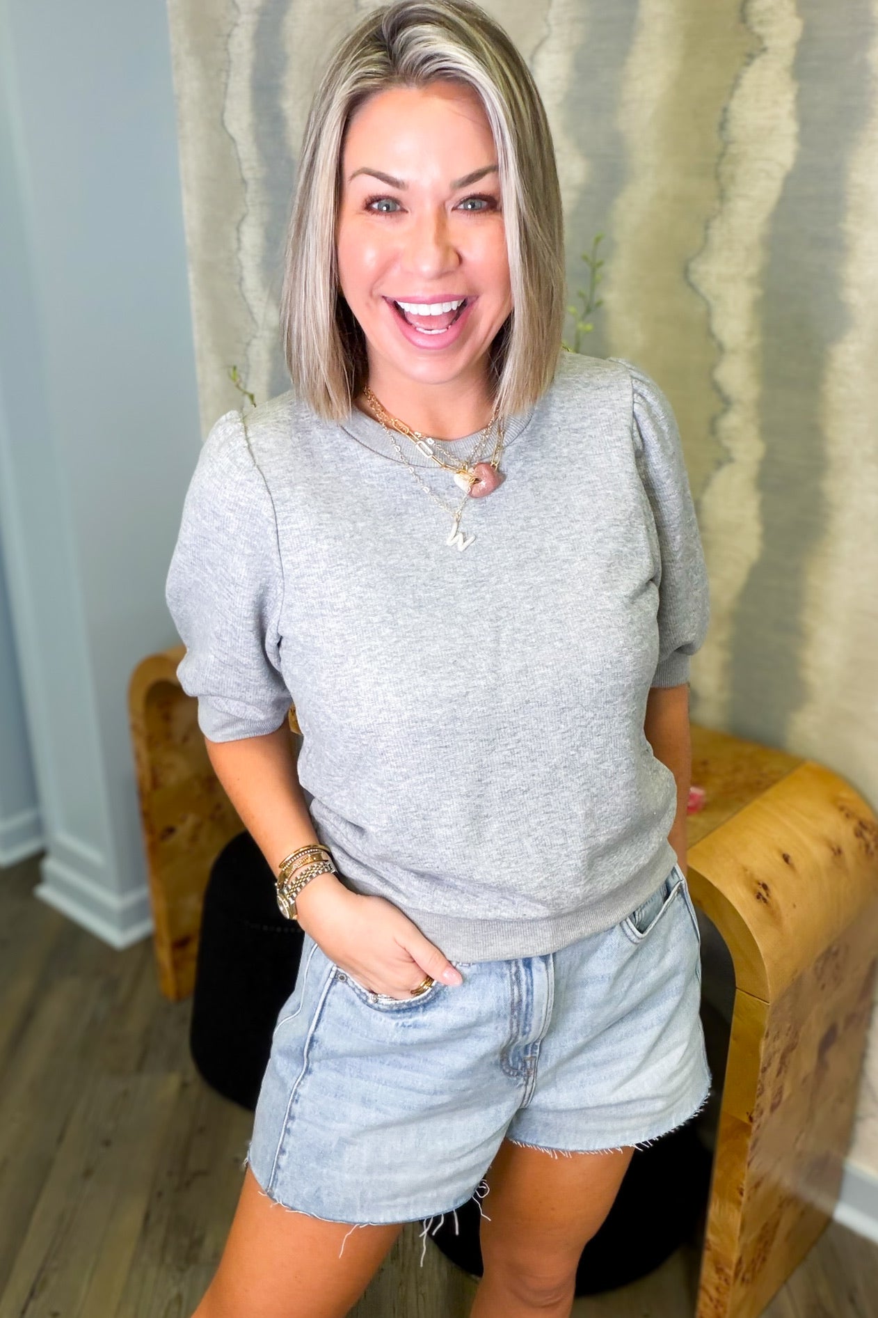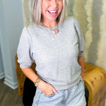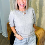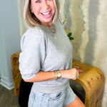 Effortless style meets cozy comfort with this charming gray knit top. The short sleeves keep things breezy while the soft knit fabric hugs you just right—perfect for layering or wearing solo. Whether you're running errands or grabbing coffee with friends, this versatile piece transitions seamlessly from casual to put-together. A wardrobe essential that works harder than it looks.