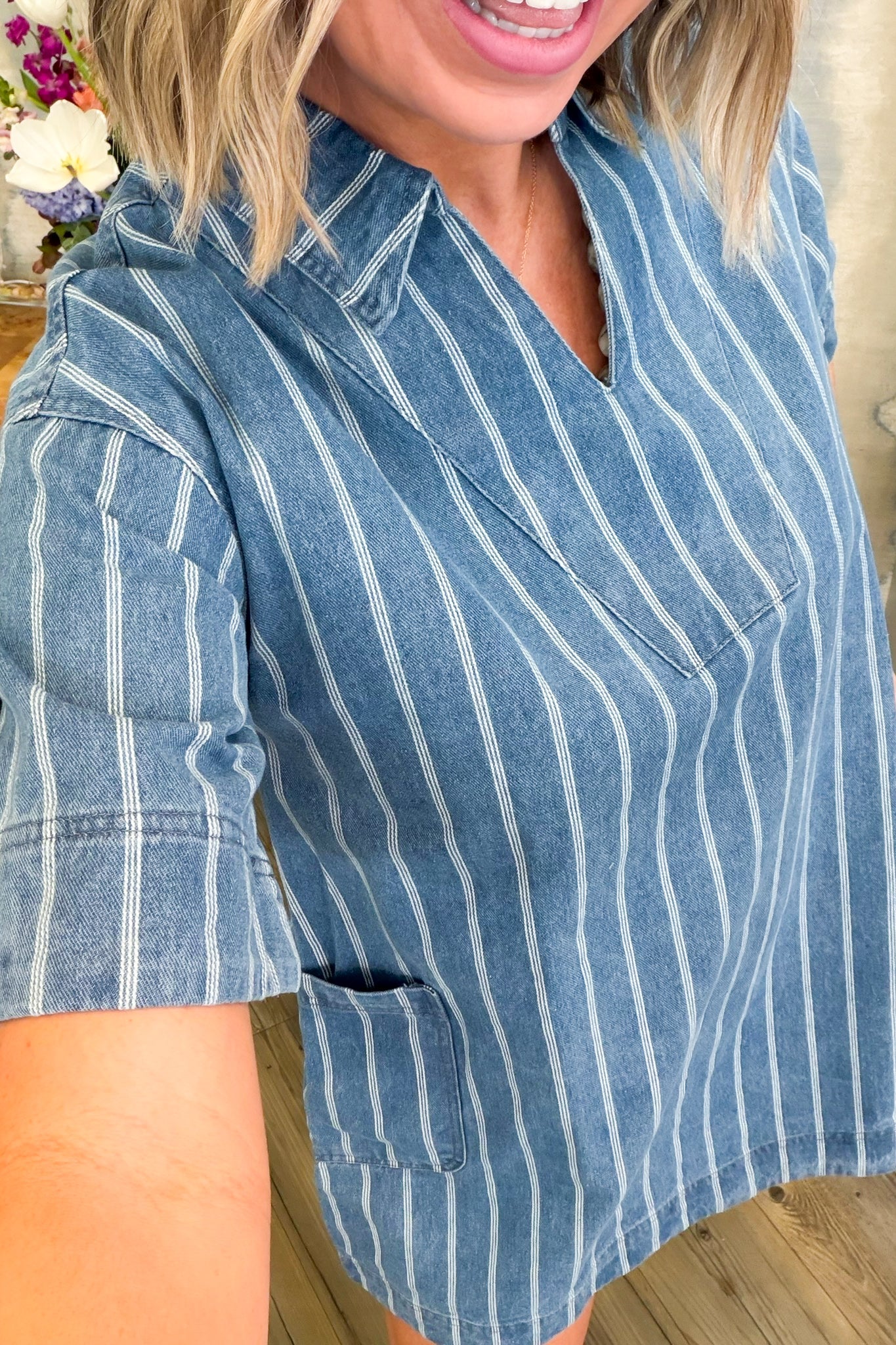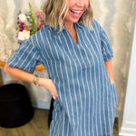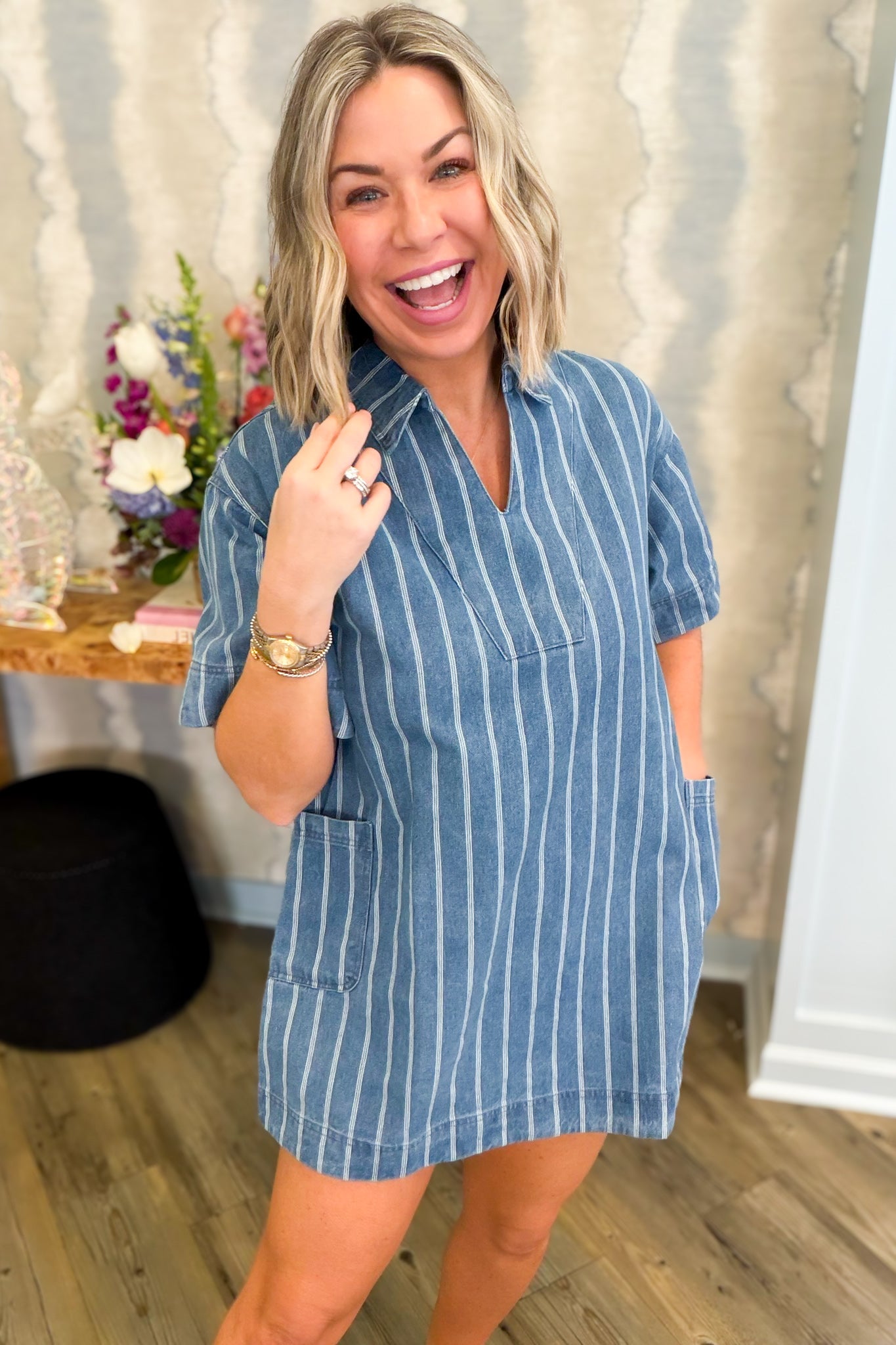 Throw on this breezy denim dress and you're ready for anything. The crisp short sleeves and classic collar keep things polished, while subtle pinstripes add just enough visual interest. Those generous side pockets? Pure genius for stashing your essentials without the bulk. Effortless style that actually works.