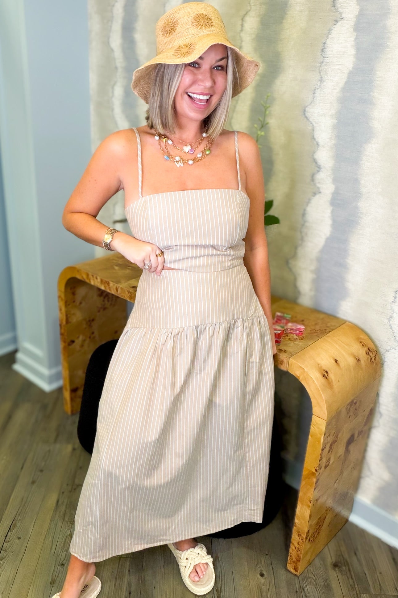 Get ready to make a statement with the Kylie set—where playful style meets effortless elegance. This dynamic duo pairs a taupe and blue striped crop top with a sultry smoked back and customizable straps alongside a flowing flared maxi skirt featuring a flattering curved yoke. Perfect for those who refuse to choose between comfort and turning heads.
