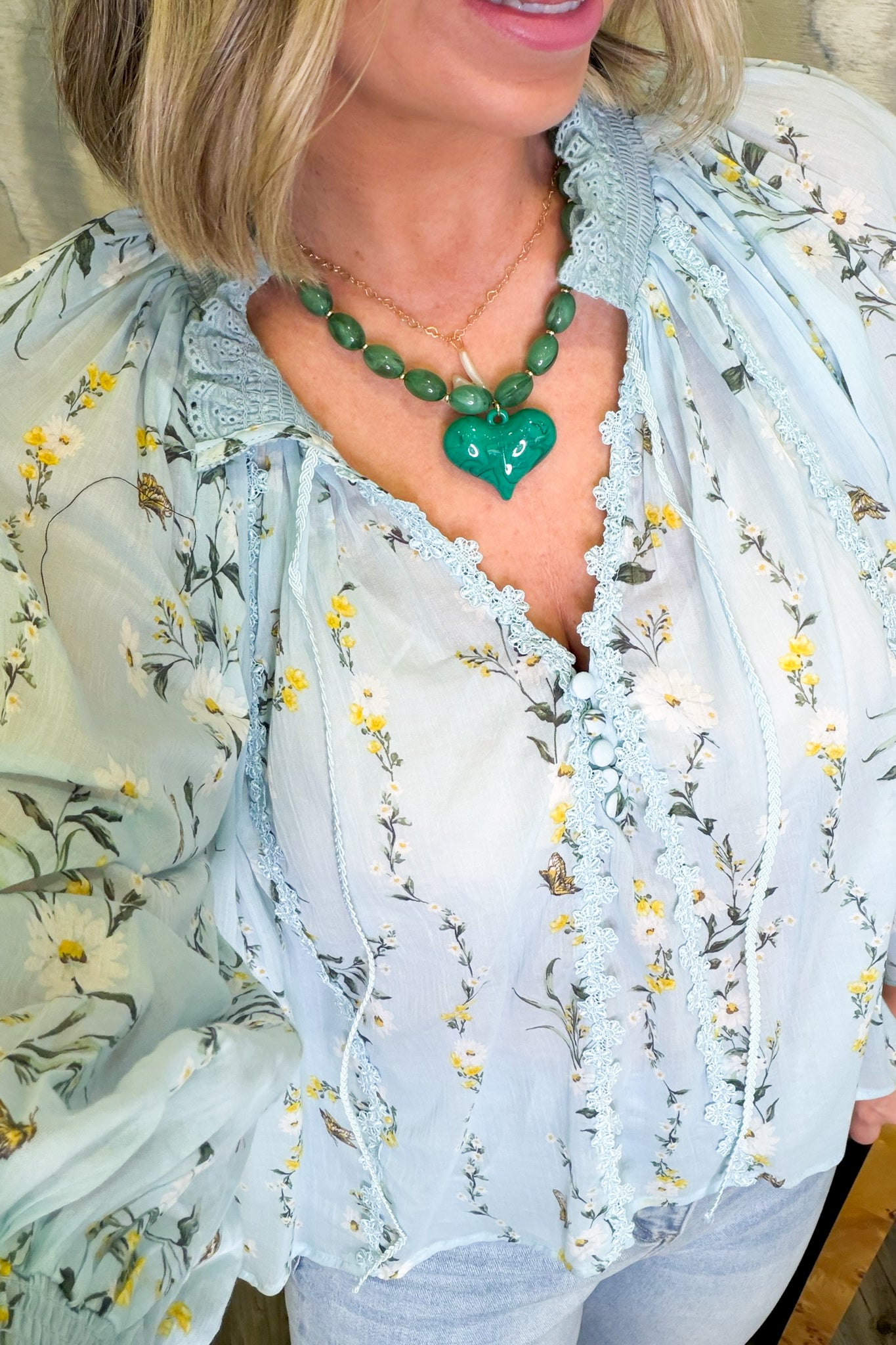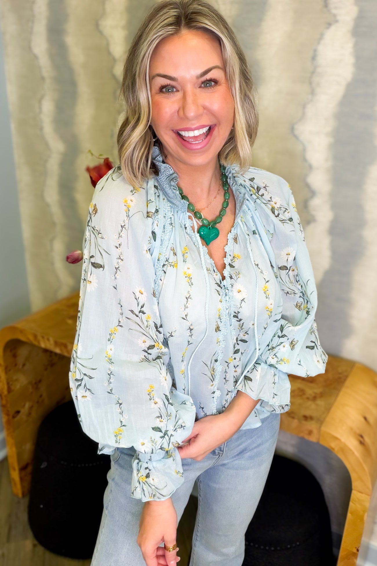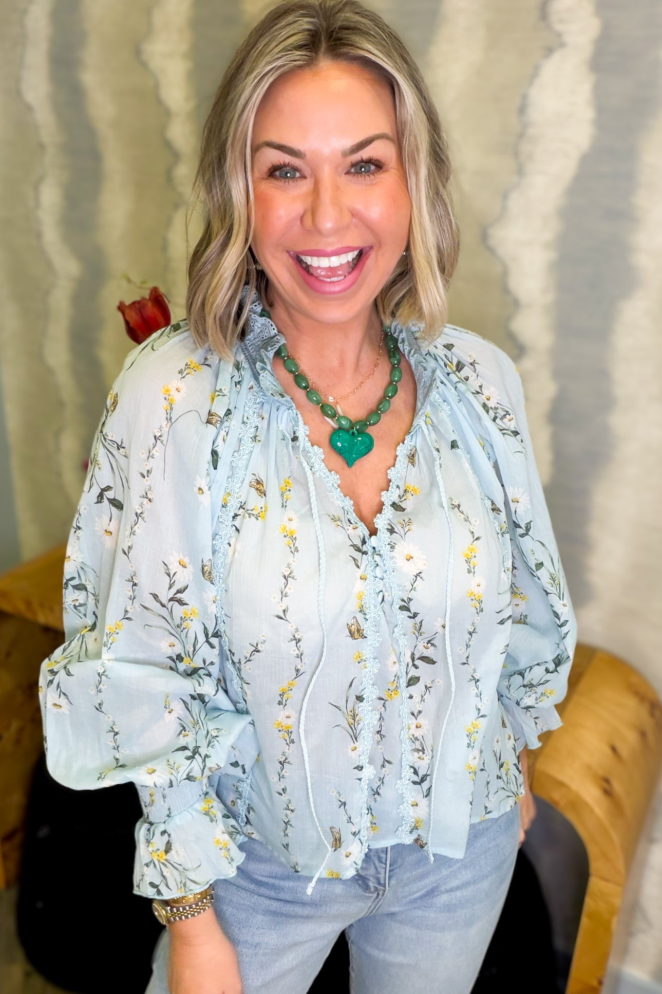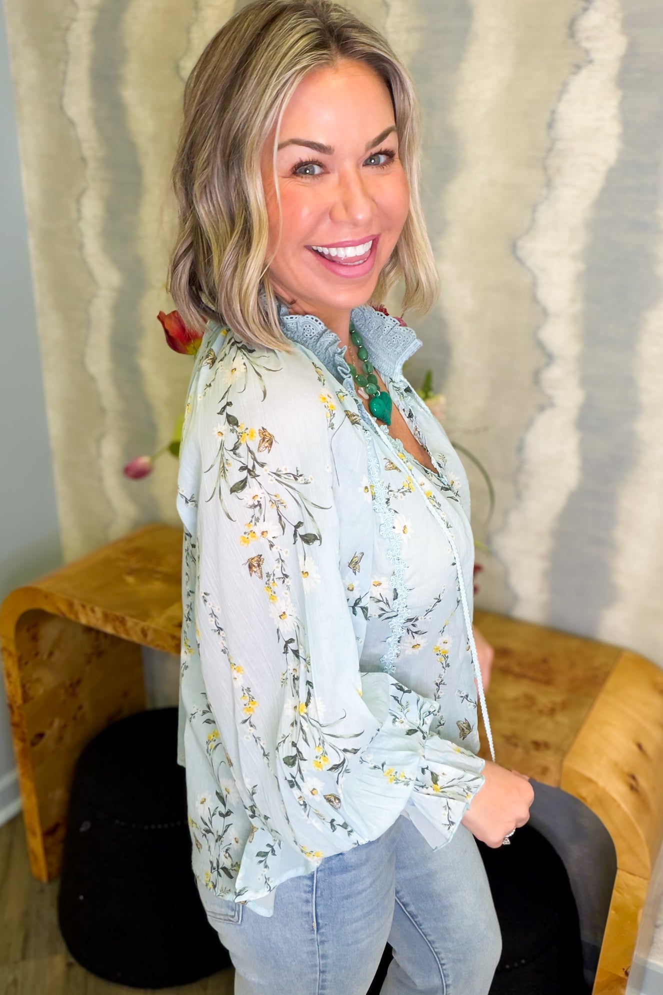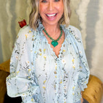 Introducing the Leslie Floral Light Blue Ruffled Blouse—your new go-to for effortless charm! This lightweight beauty features delicate yellow floral detailing that adds a pop of color to your wardrobe. The romantic ruffled design pairs perfectly with lace accents, while the front tie cinches your silhouette for a flattering fit. The V-neck neckline keeps things breezy and stylish, and long sleeves offer versatile coverage. True to size and impossibly comfortable, the Leslie is ready for brunch dates, casual outings, or whenever you want to feel put-together without trying too hard. Playful, feminine, and undeniably wearable.