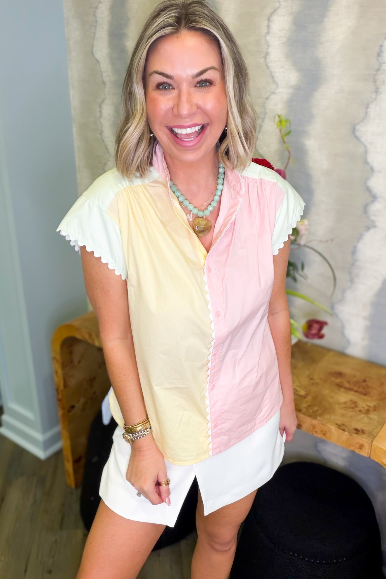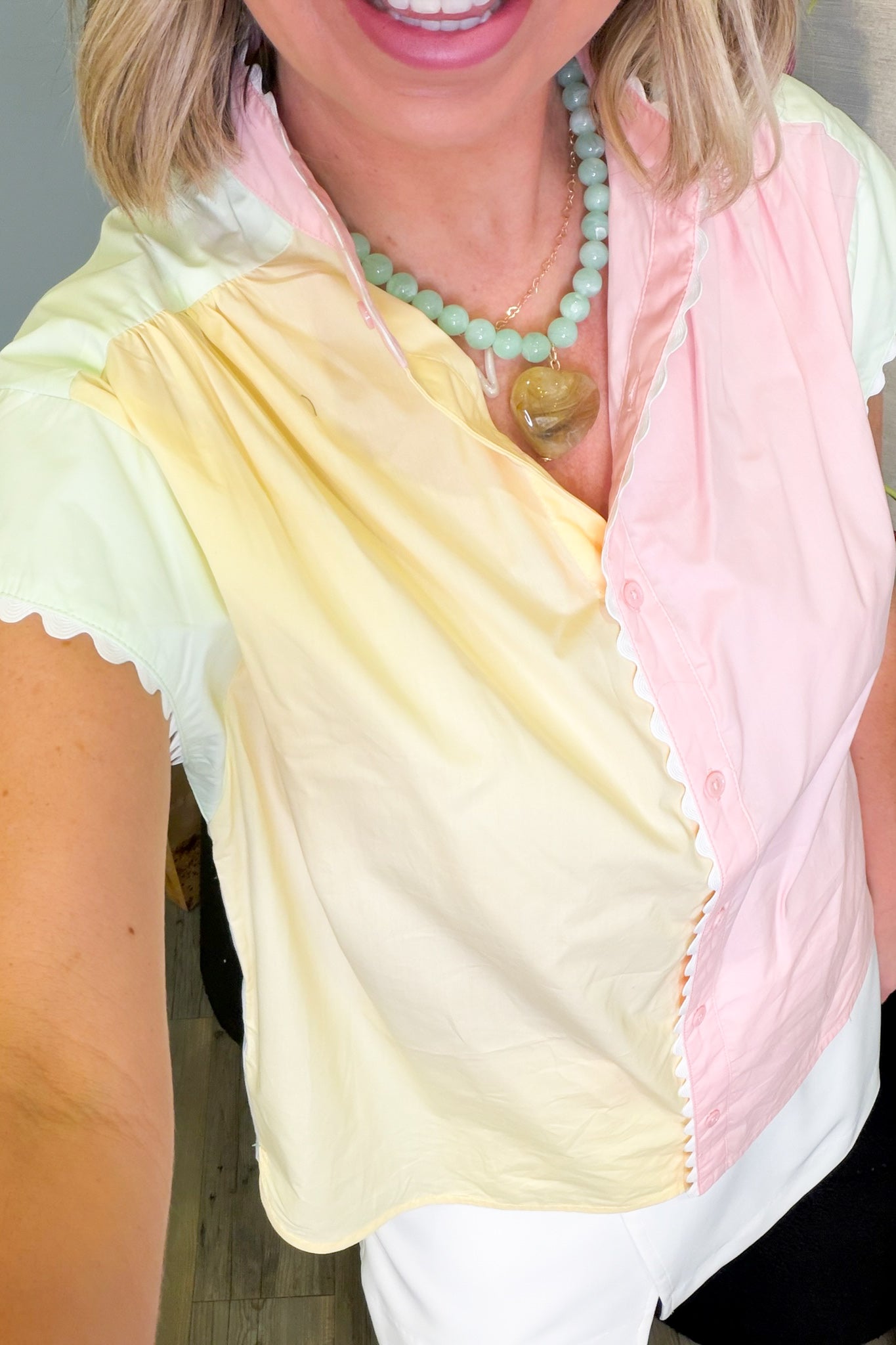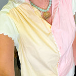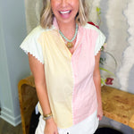 Brighten your wardrobe with this cheerful colorblock blouse featuring soft pastel pink, yellow, and green panels. The sleeveless design keeps things breezy and comfortable, while charming white ric rac trim adds a whimsical touch along the edges. Front button closure makes it easy to slip on and style with everything from denim to skirts. Perfect for adding a pop of playful color to your everyday look.