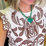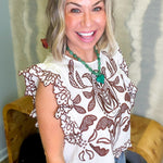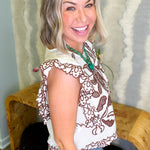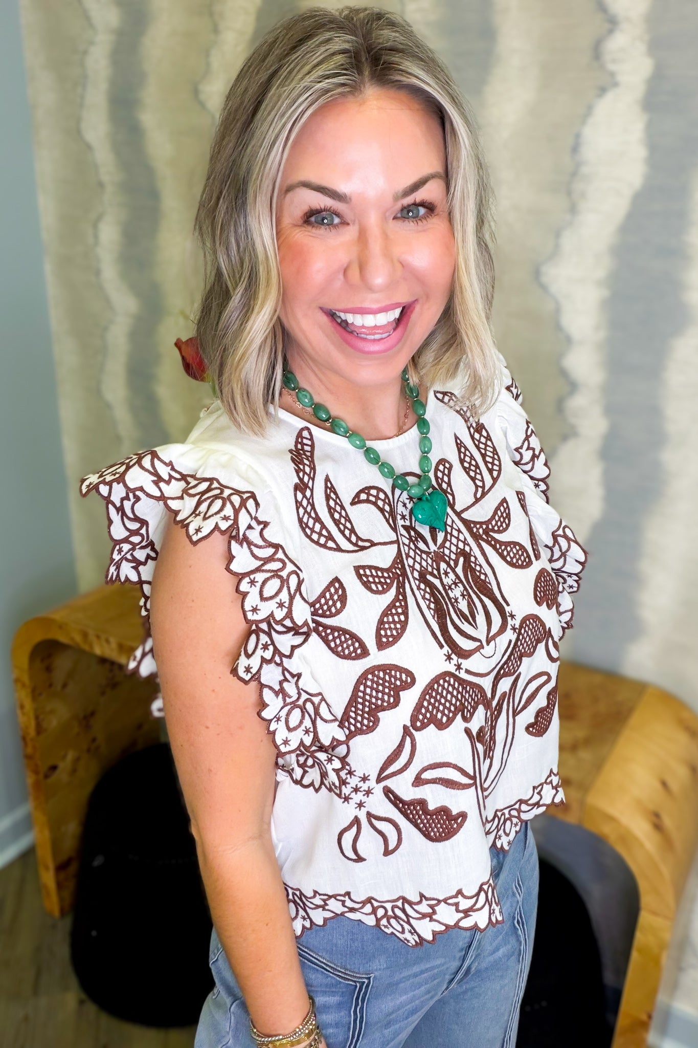 Twirl into spring with the Sydney White Embroidered Blouse, where charming ruffled sleeves meet delicate brown embroidery for an effortlessly chic look. This crisp white blouse features intricate embroidered details that add personality and dimension to your everyday wardrobe. The playful ruffle sleeves bring movement and a touch of whimsy to any outfit, whether you're dressing up for brunch or keeping it casual. True to size for a perfect fit every time. A versatile piece that transitions beautifully from season to season.