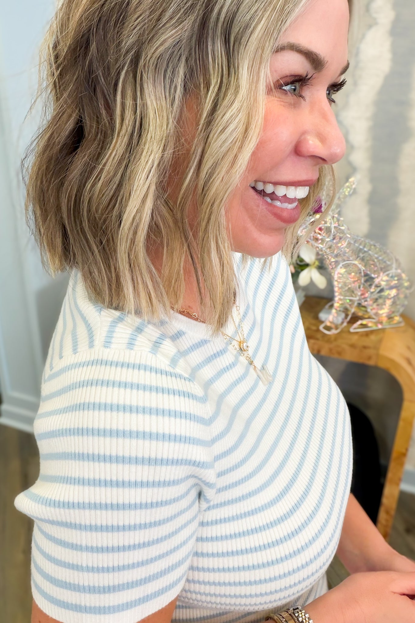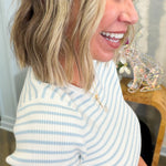 Stripes that pop in the coolest shade of icy blue! This short-sleeve ribbed knit top brings effortless style to your everyday rotation. The fitted ribbed texture adds dimension and comfort, while the crisp striped pattern keeps things fresh and fun. Perfect for layering or wearing solo, the Mollie is your new go-to for casual vibes with a touch of personality.