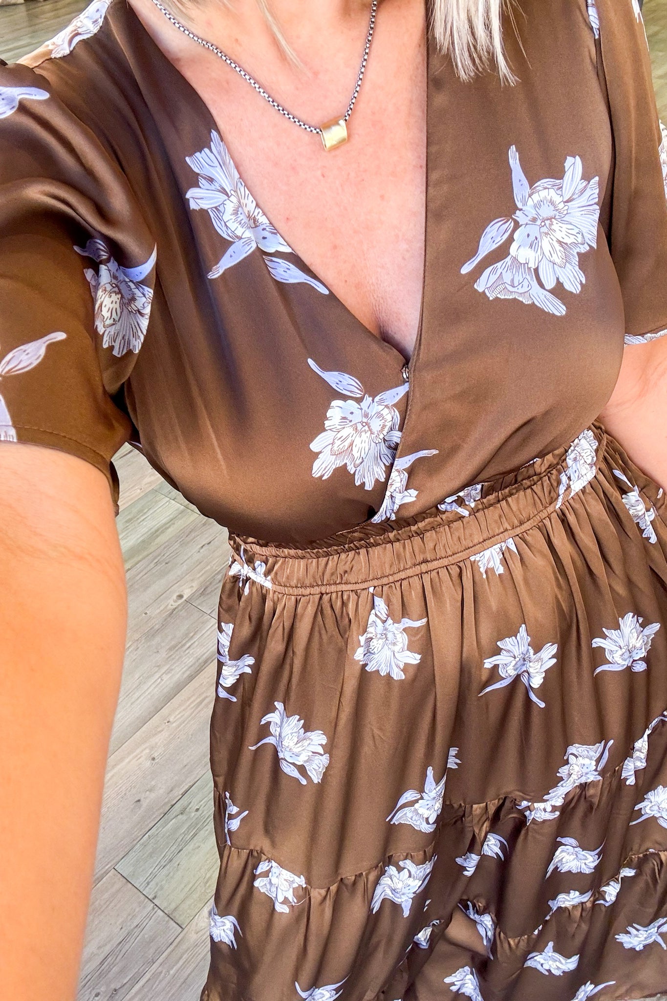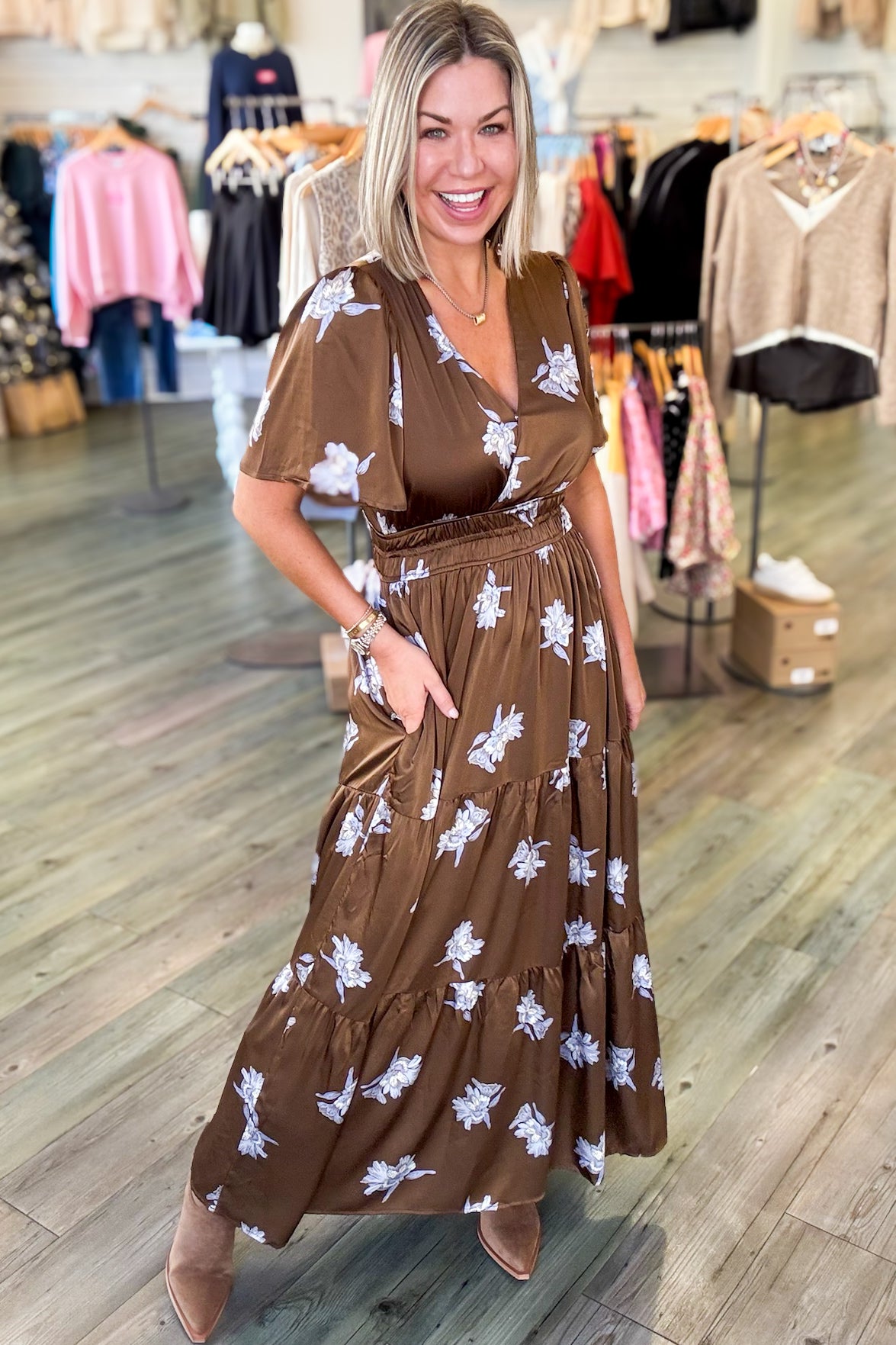 Twirl into autumn with this charming midi dress that pairs rich brown tones with delicate blue florals. The flattering v-neck creates an effortlessly elegant silhouette, while the midi length offers versatile styling for everything from casual brunches to evening outings. Perfect for adding a pop of botanical beauty to your wardrobe without sacrificing comfort or sophistication.
