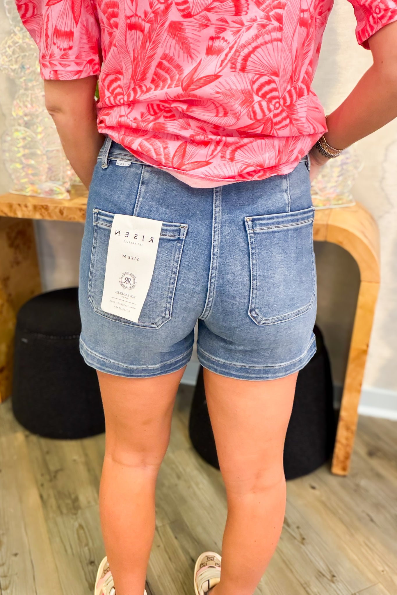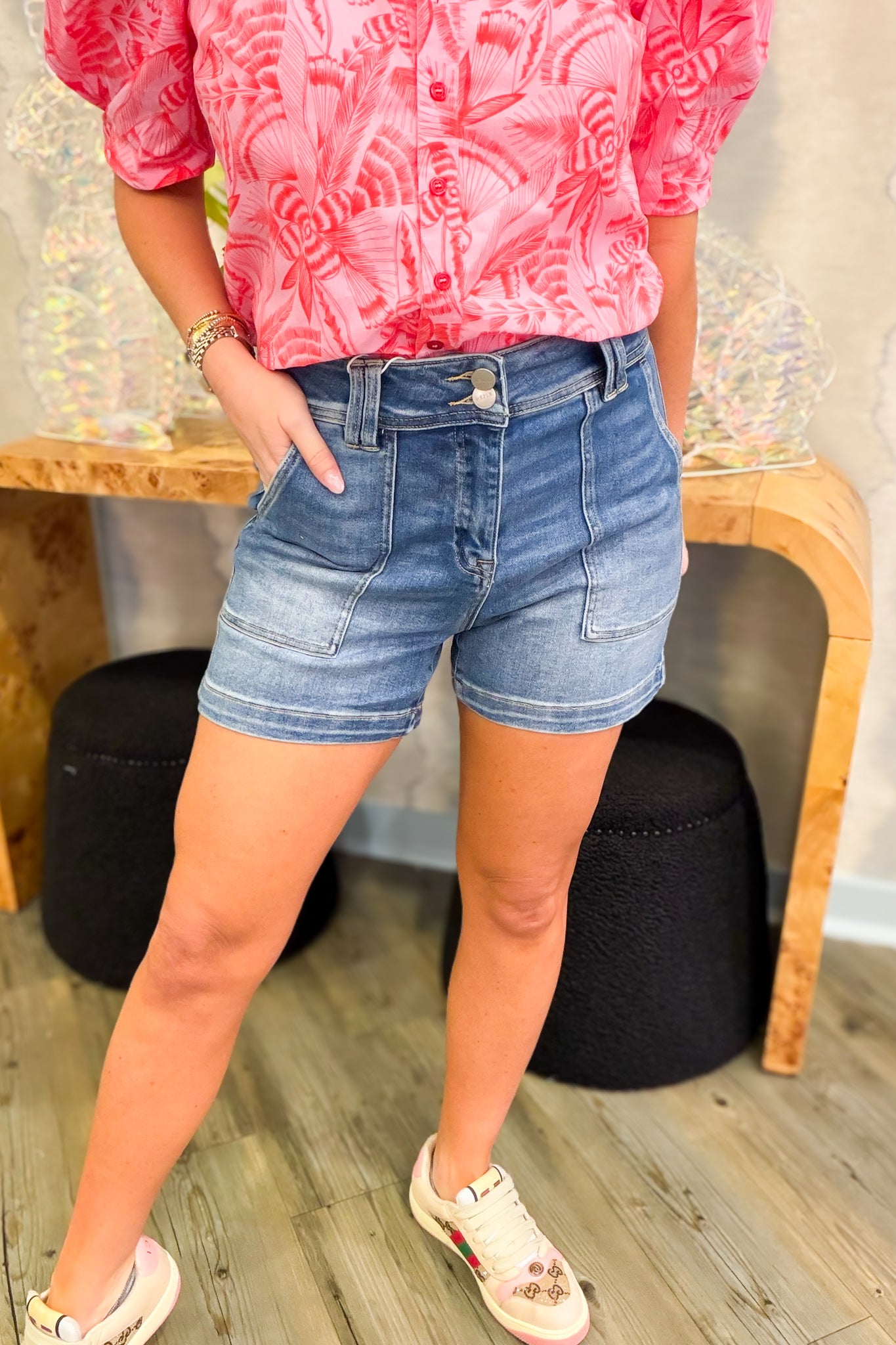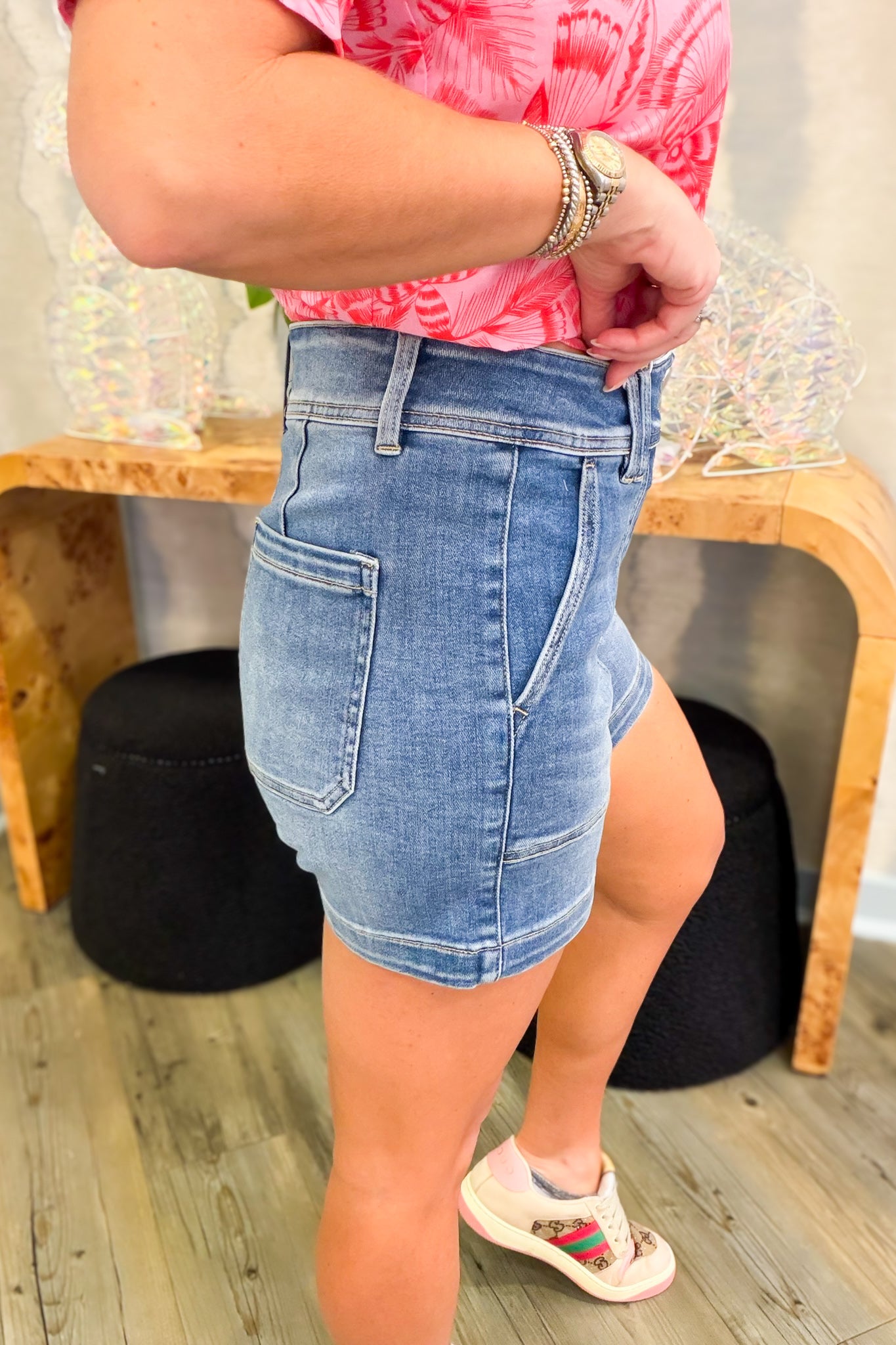 Rock that effortless vintage vibe with these high-rise denim shorts featuring eye-catching patched front pockets. The medium wash delivers that perfectly worn-in look that pairs with everything from crop tops to oversized tees. Built for comfort and style, these shorts are your new go-to for casual days and weekend adventures. Embrace the playful, retro-inspired details that make getting dressed fun again.