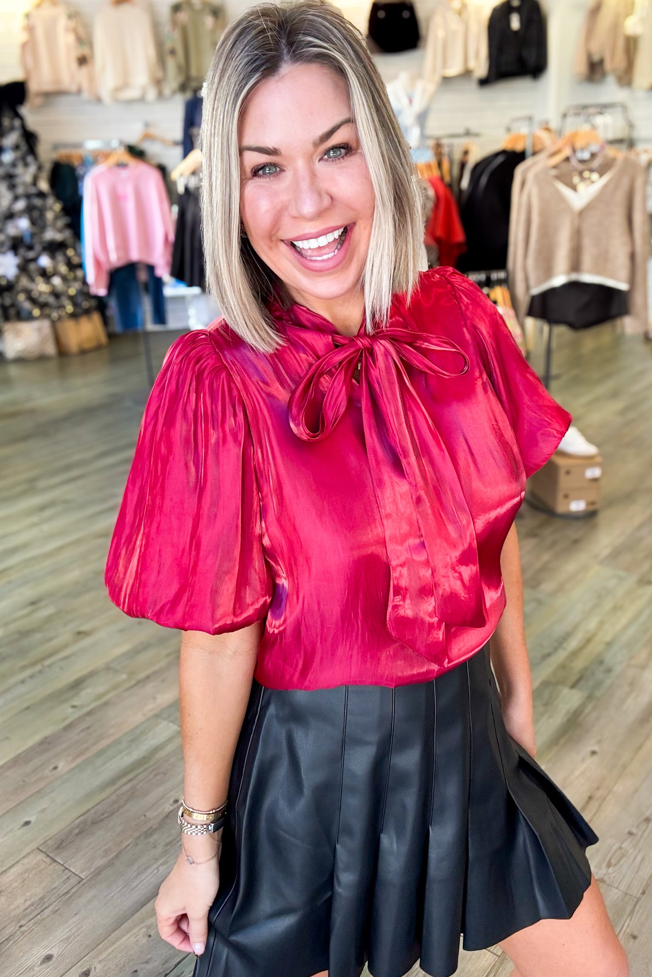 Elevate your wardrobe with this stunning red satin blouse that's equal parts sophisticated and fun. The luxe satin fabric drapes beautifully while the charming tie-front detail adds a flirty, feminine touch that lets you adjust the fit to perfection. Whether you're dressing up for a night out or adding polish to your everyday look, this versatile top brings instant elegance and a playful spirit to any outfit.