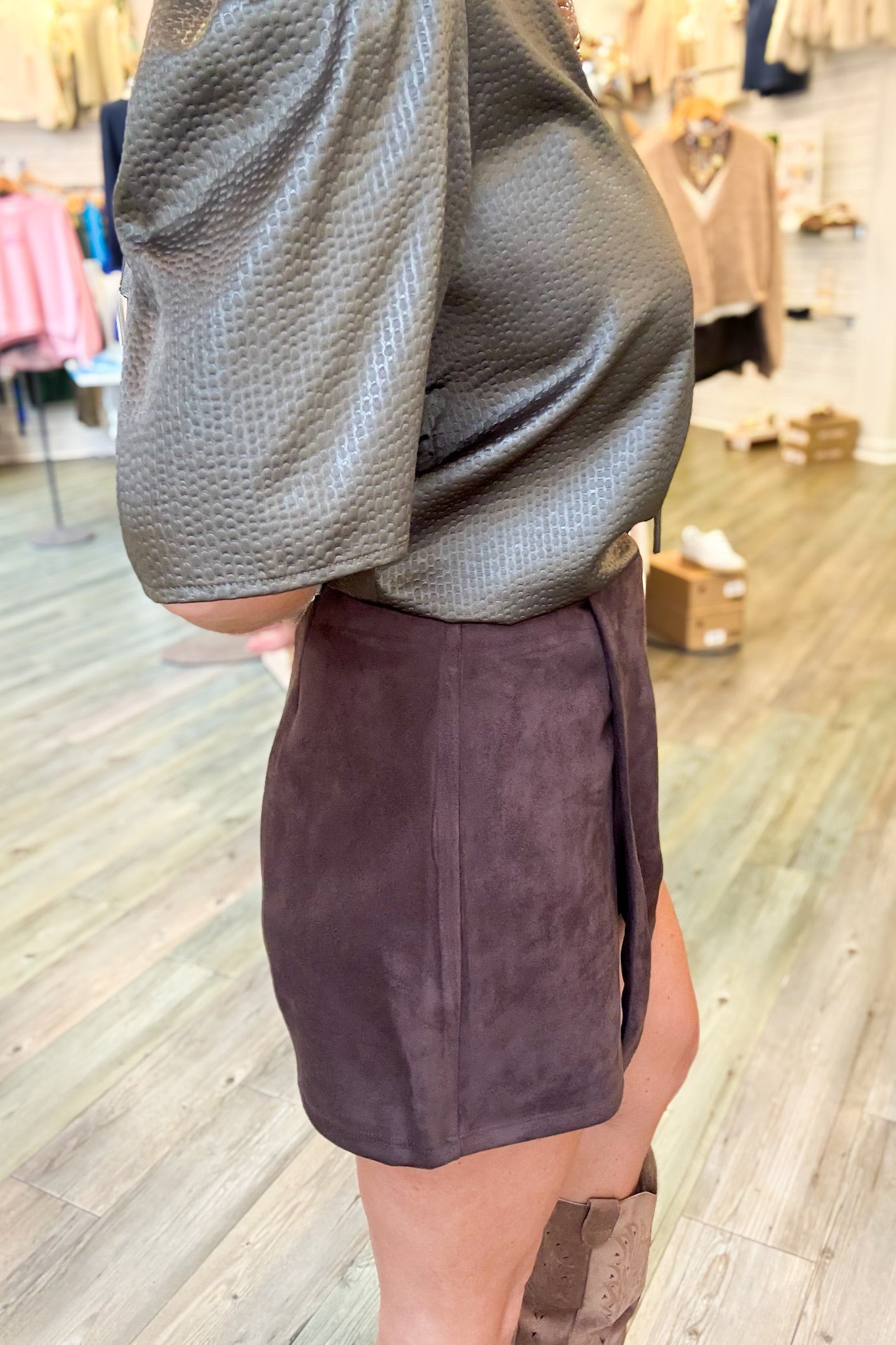 Discover the effortless sophistication of rich chocolate suede. This skirt features a striking front flap detail that sets it apart from ordinary pieces, while the smooth suede fabric drapes beautifully against your body. The interior lining ensures all-day comfort and longevity, making this an investment piece you'll reach for again and again. Whether you're heading to the office or out for the evening, this skirt delivers polished style that never goes out of fashion.