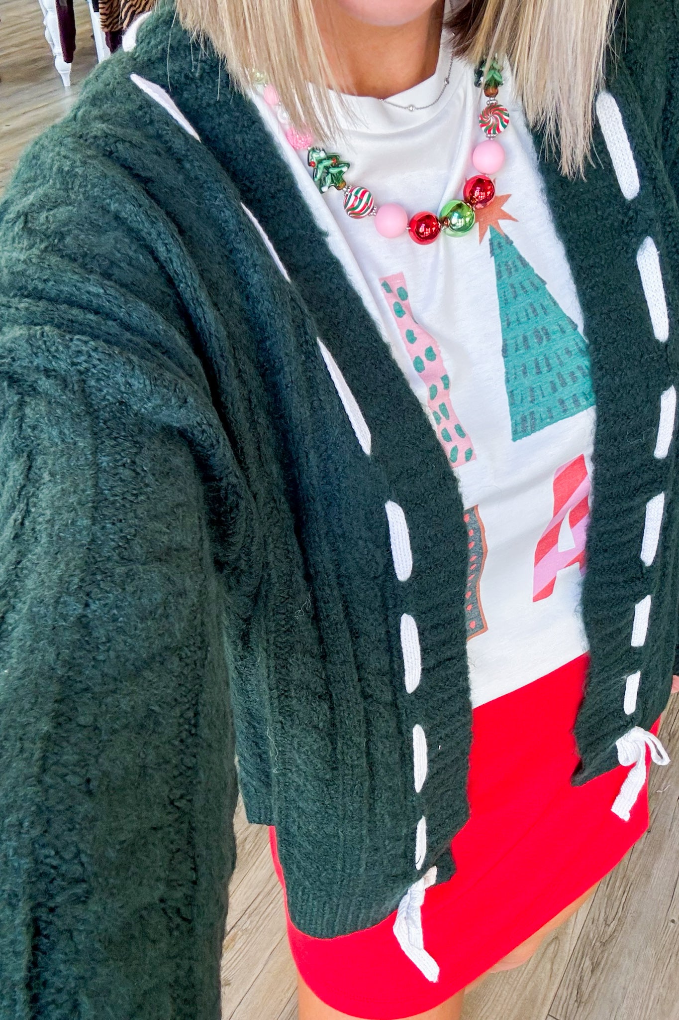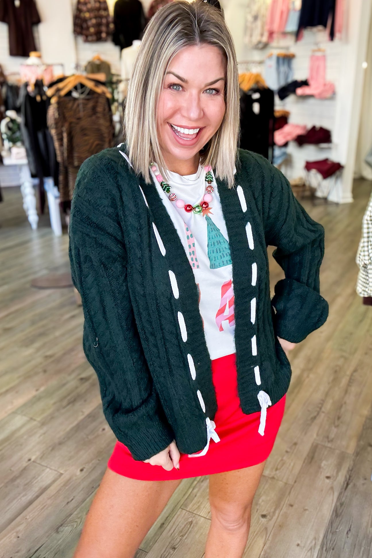 Wrap yourself in holiday cheer with this hunter green cable knit cardigan, perfect for festive gatherings and cozy winter nights. The rich, sophisticated green pairs beautifully with playful white details that add a touch of whimsy to your seasonal wardrobe. Crafted from soft, textured knit, this cardigan layers effortlessly over your favorite holiday outfits while keeping you warm and stylish. Whether you're sipping cocoa by the fire or heading out to celebrate, this festive essential brings comfort and character to every moment.