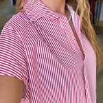 The Roxie Red Collared Stripe Top features bold red and white stripes, a flattering V-neck, and a classic collared neckline for a polished look. Its sleeveless, boxy cut offers comfortable wear and easy styling. Designed to fit roomy, this top allows you to size down for a more tailored silhouette without sacrificing comfort. Perfect for casual or dressier occasions, it brings a vibrant, fresh touch to your wardrobe.