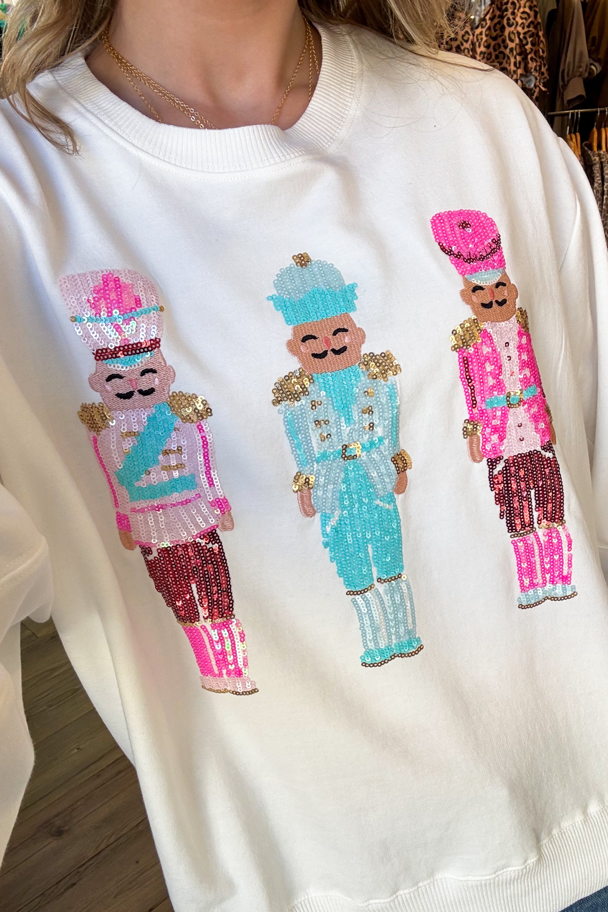 Experience cozy comfort with the Sarah Three Nutcrackers Sweatshirt, featuring charming pink and blue nutcracker designs. This super soft white sweatshirt offers a true-to-size fit for easy styling and all-day wear. Perfect for adding a festive touch while keeping warm and comfortable.