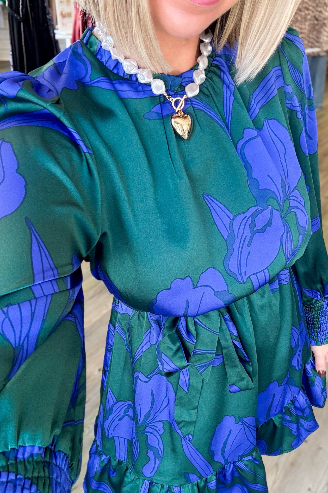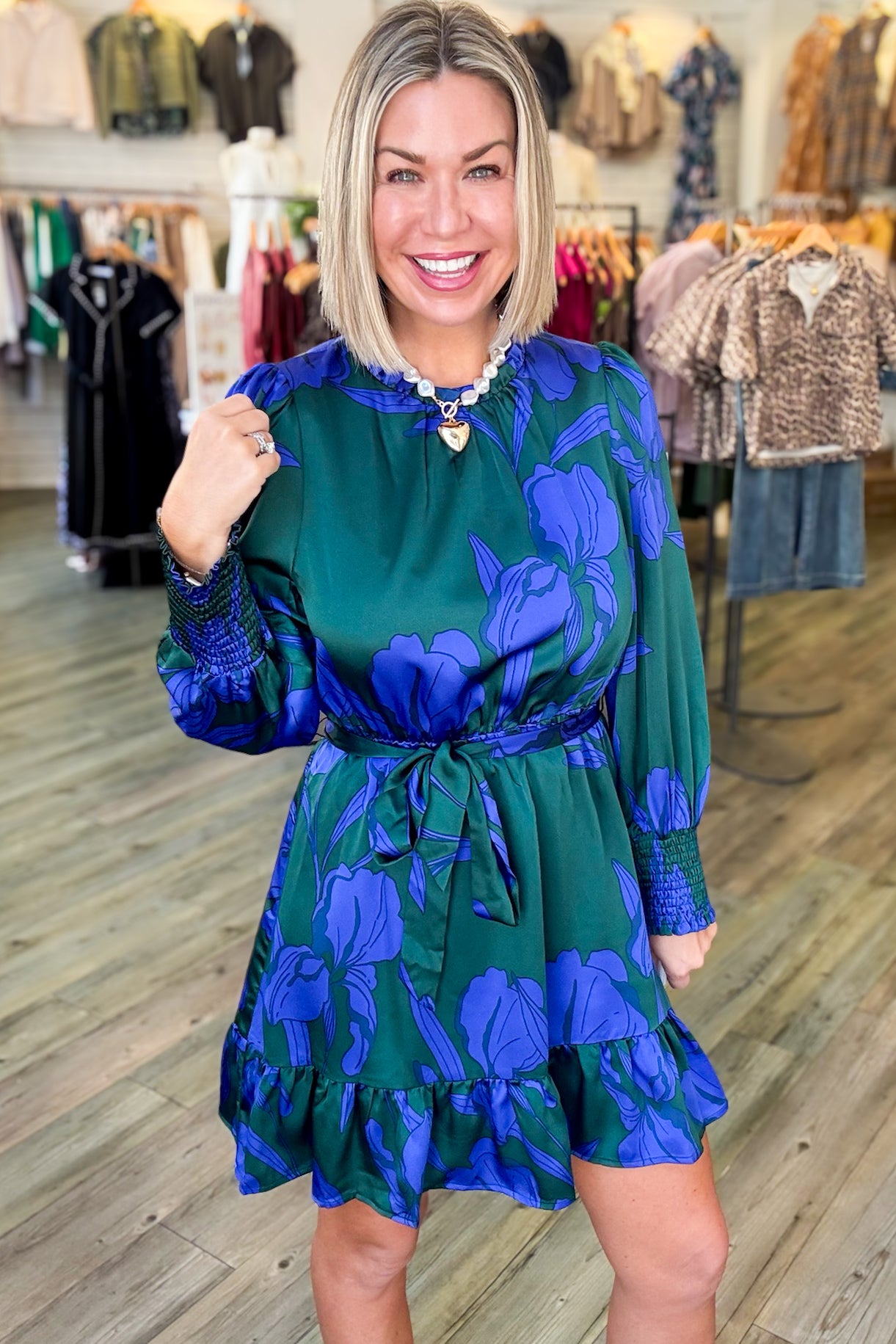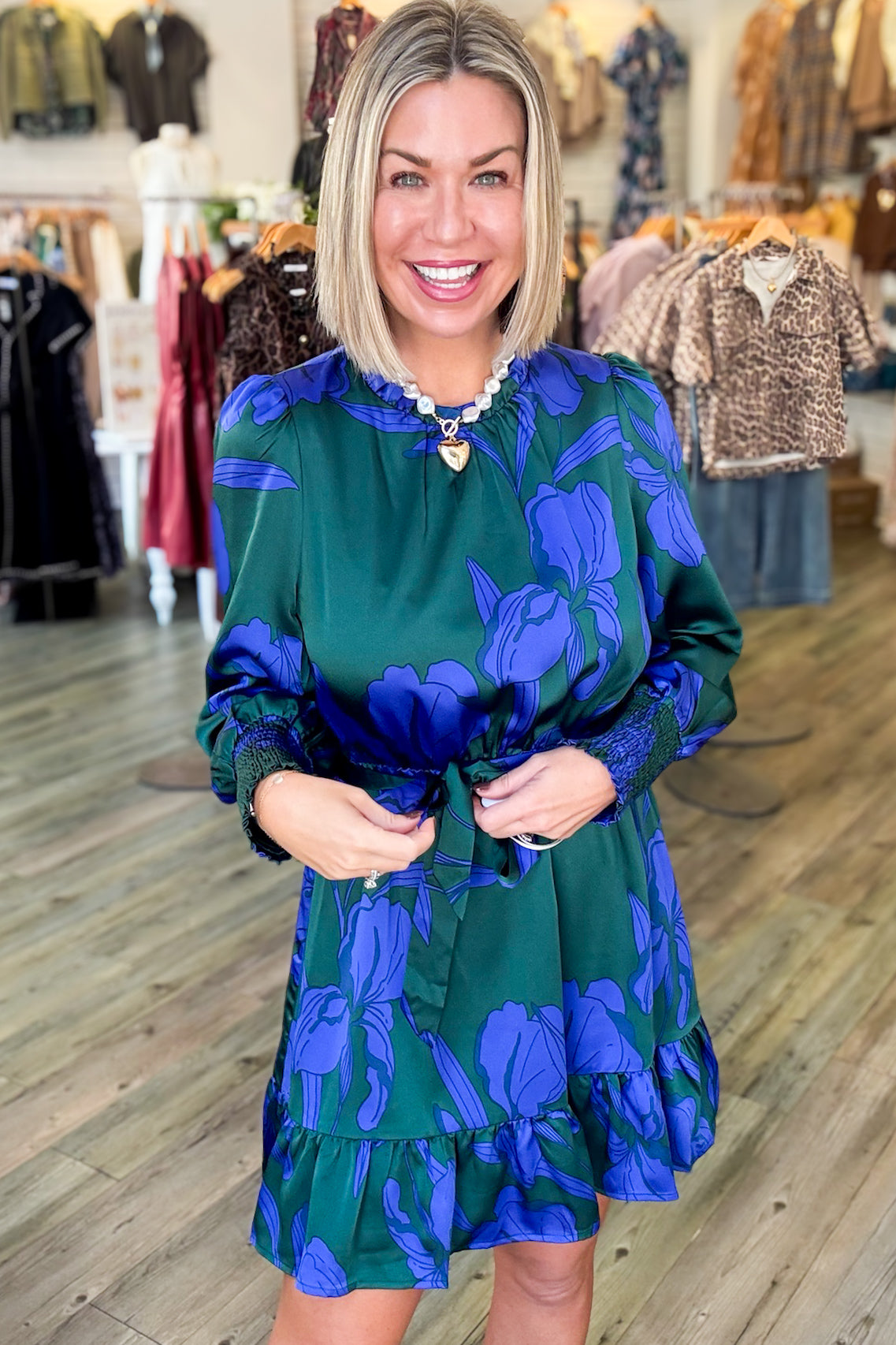 The Sevilla Ruffle Dress features a delicate blue and green satin print that flows beautifully. Its ruffle bottom adds a playful touch, while the cinched waist with a bow creates a flattering silhouette. The keyhole button back offers an elegant finish, making this dress perfect for any occasion where you want to feel confident and stylish.