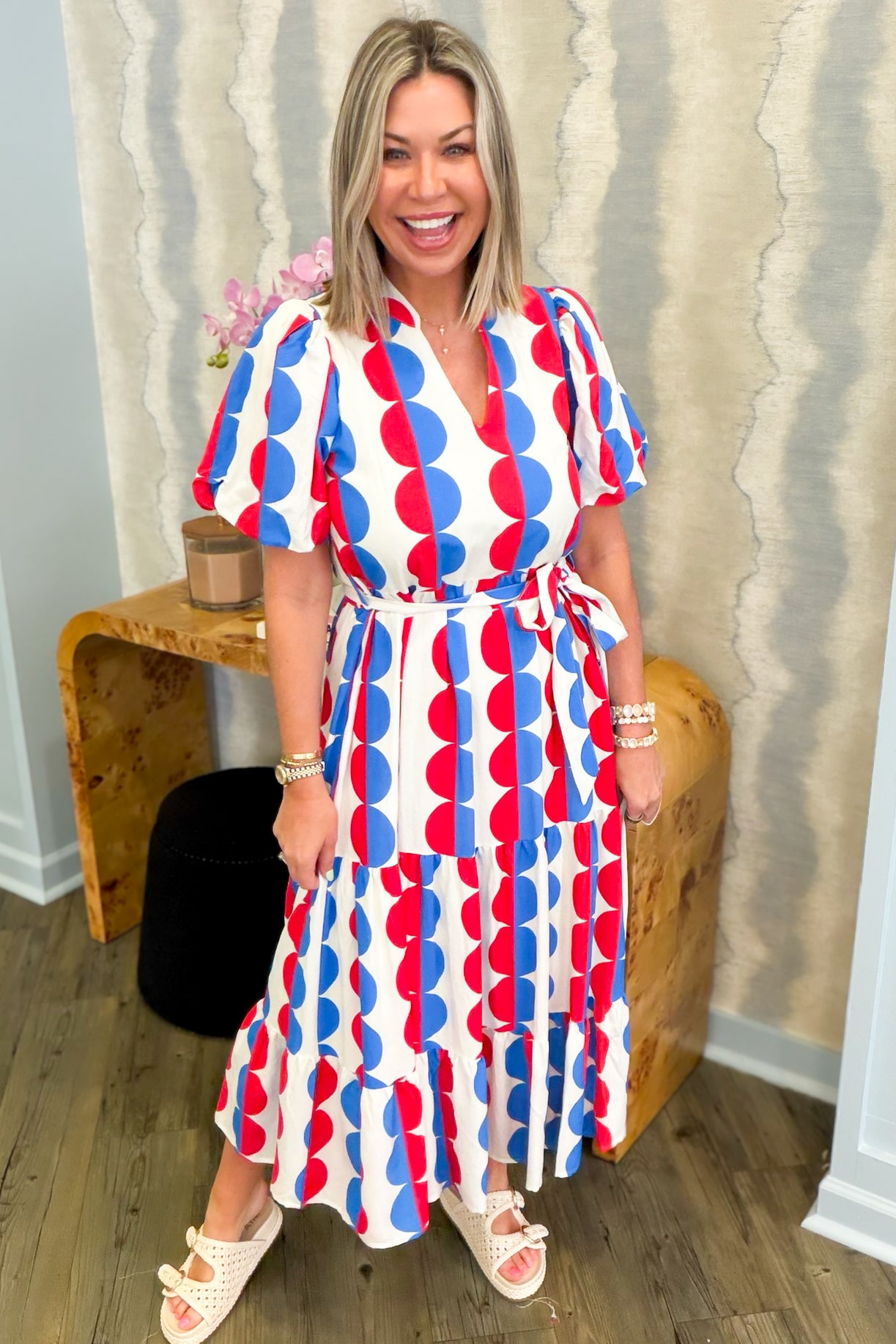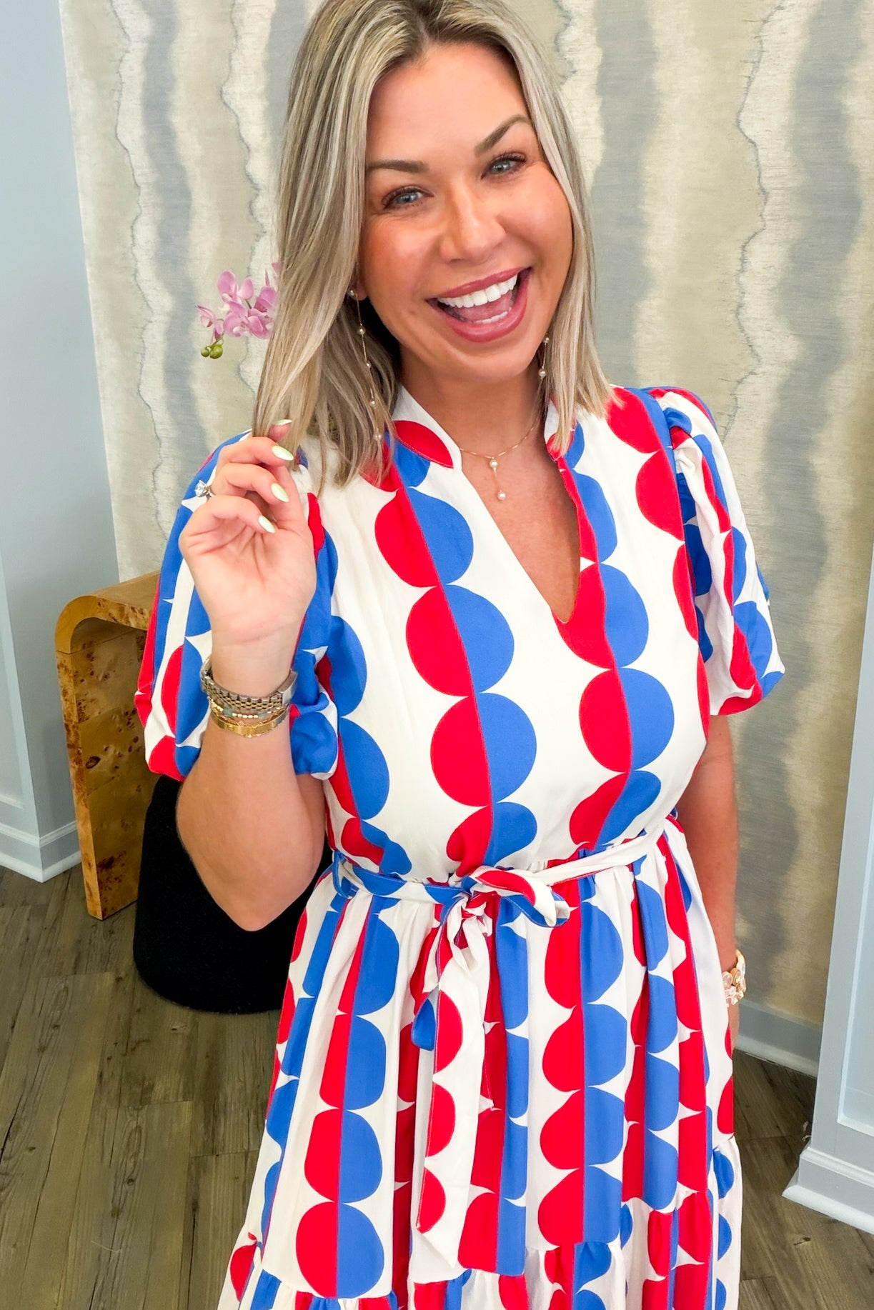 The Sofia Circle Dress combines easy style with a fun design. This short-sleeve, v-neck dress boasts a figure-flattering tie waist and a striking blue and red circle print, adding a touch of individuality to any collection. Ideal for both everyday wear and special events, this adaptable garment effortlessly moves from day to evening.