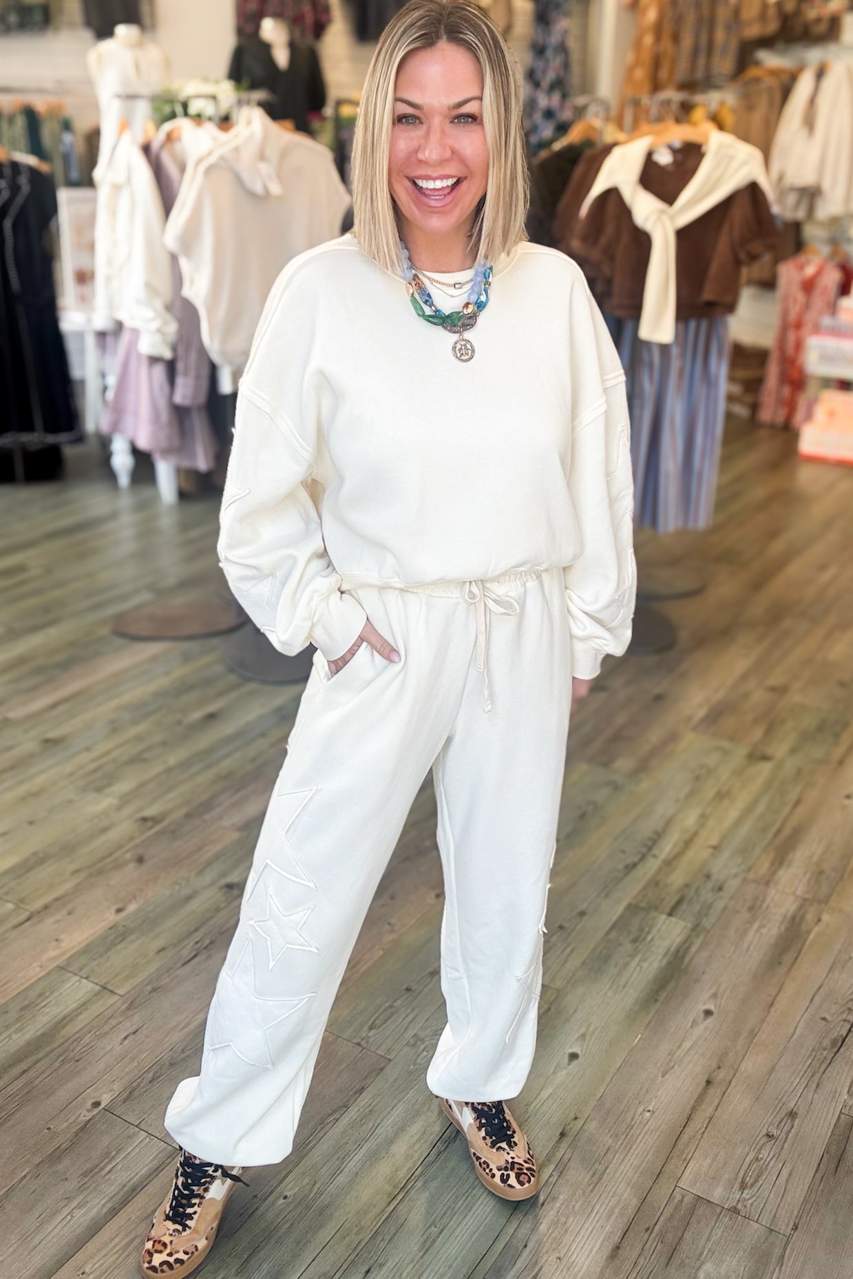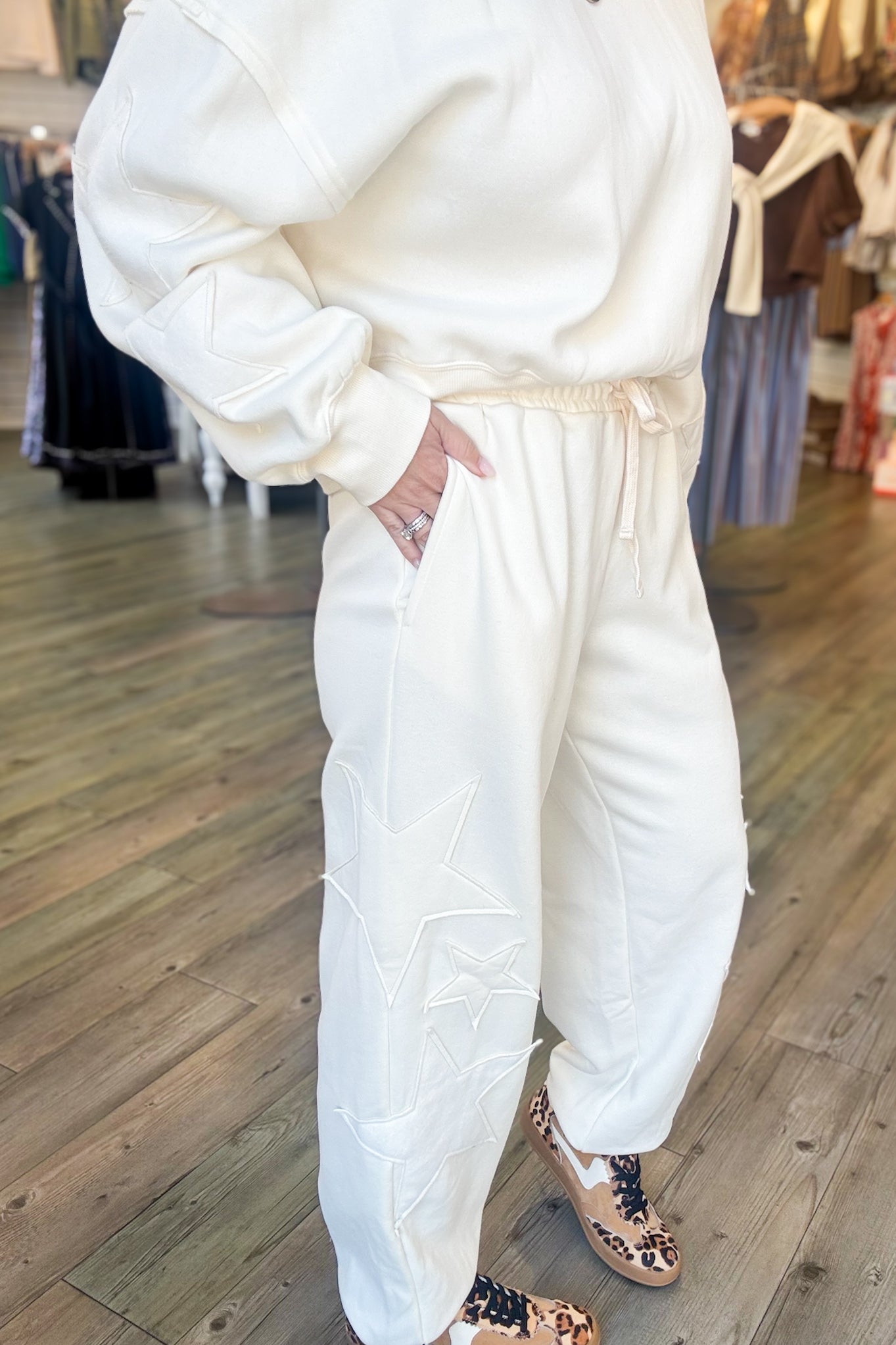 Experience cozy comfort with the Starry Sweatpants, featuring a soft cream fabric perfect for relaxing days. Detailed stitched stars along the legs add a subtle yet stylish touch, letting you stand out effortlessly. The adjustable drawstring ensures a perfect fit, providing support whether you're lounging at home or stepping out for errands.
