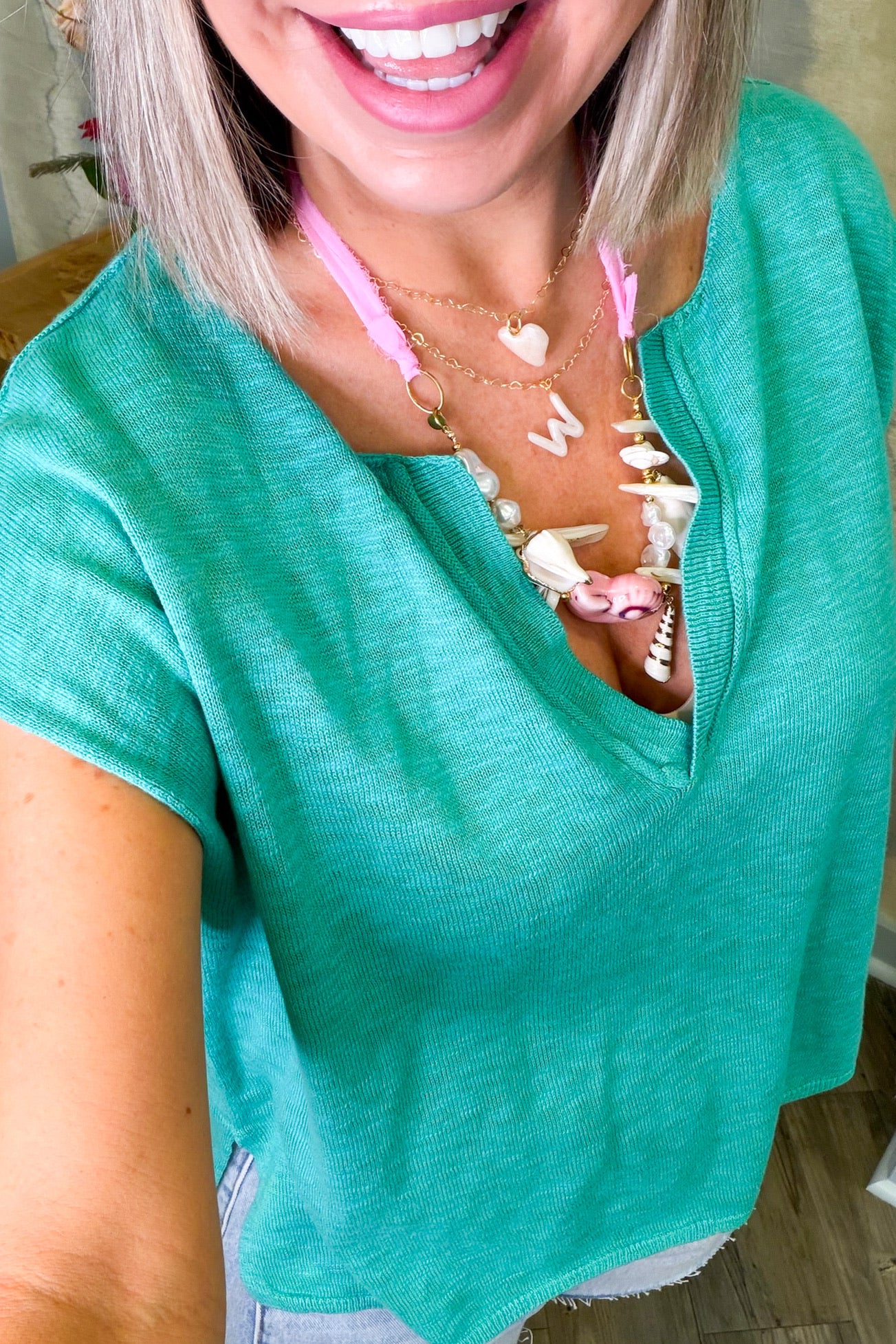 Dive into effortless style with this breezy seafoam short sleeve top. The flattering v-neck creates a chic silhouette that's perfect for layering or wearing solo. Soft, breathable fabric keeps you comfortable all day long, whether you're running errands or catching up with friends. A versatile wardrobe essential that pairs beautifully with everything from denim to linen pants. Fresh, fun, and ready for anything.