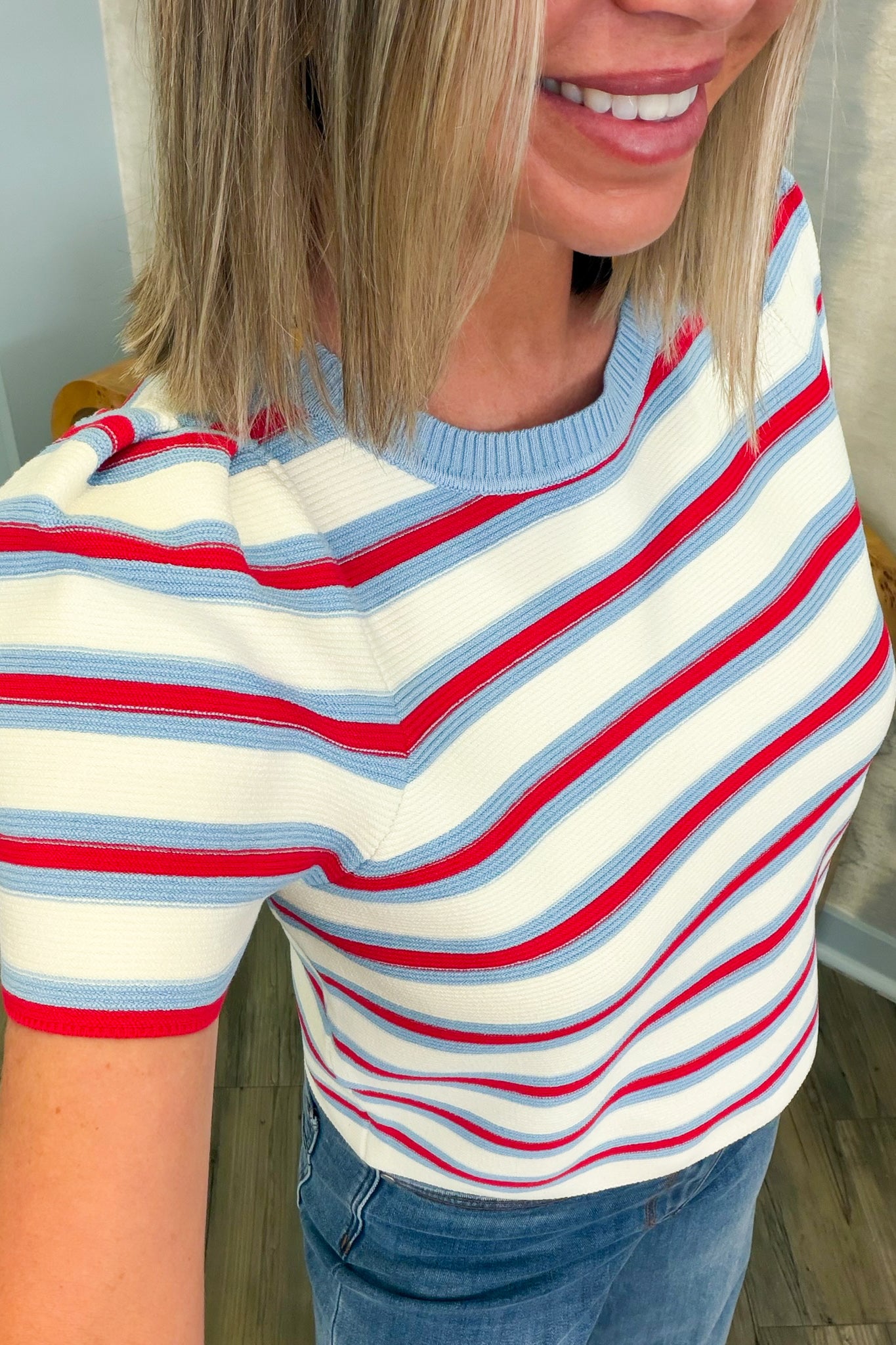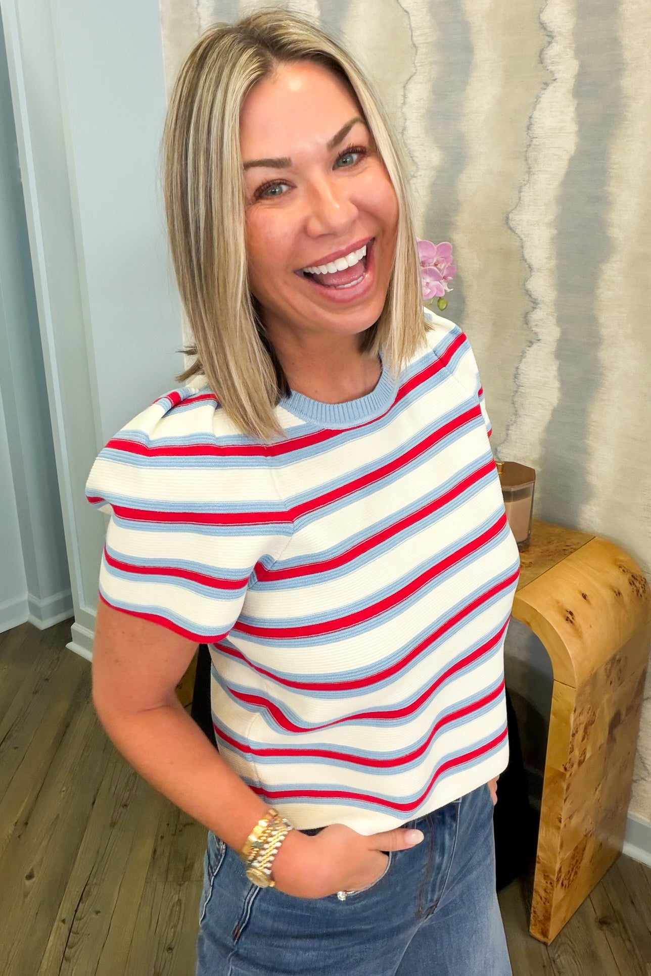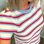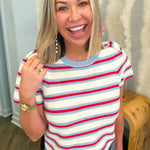 Stripes that pop and a vibe that's pure fun—this cream short sleeve top features bold red and blue stripes that bring instant personality to your everyday rotation. Light, breathable, and effortlessly cool, it's the kind of piece that works solo or layered. Perfect for mixing with your favorite basics or dressing up with statement accessories. A wardrobe essential that never goes out of style.