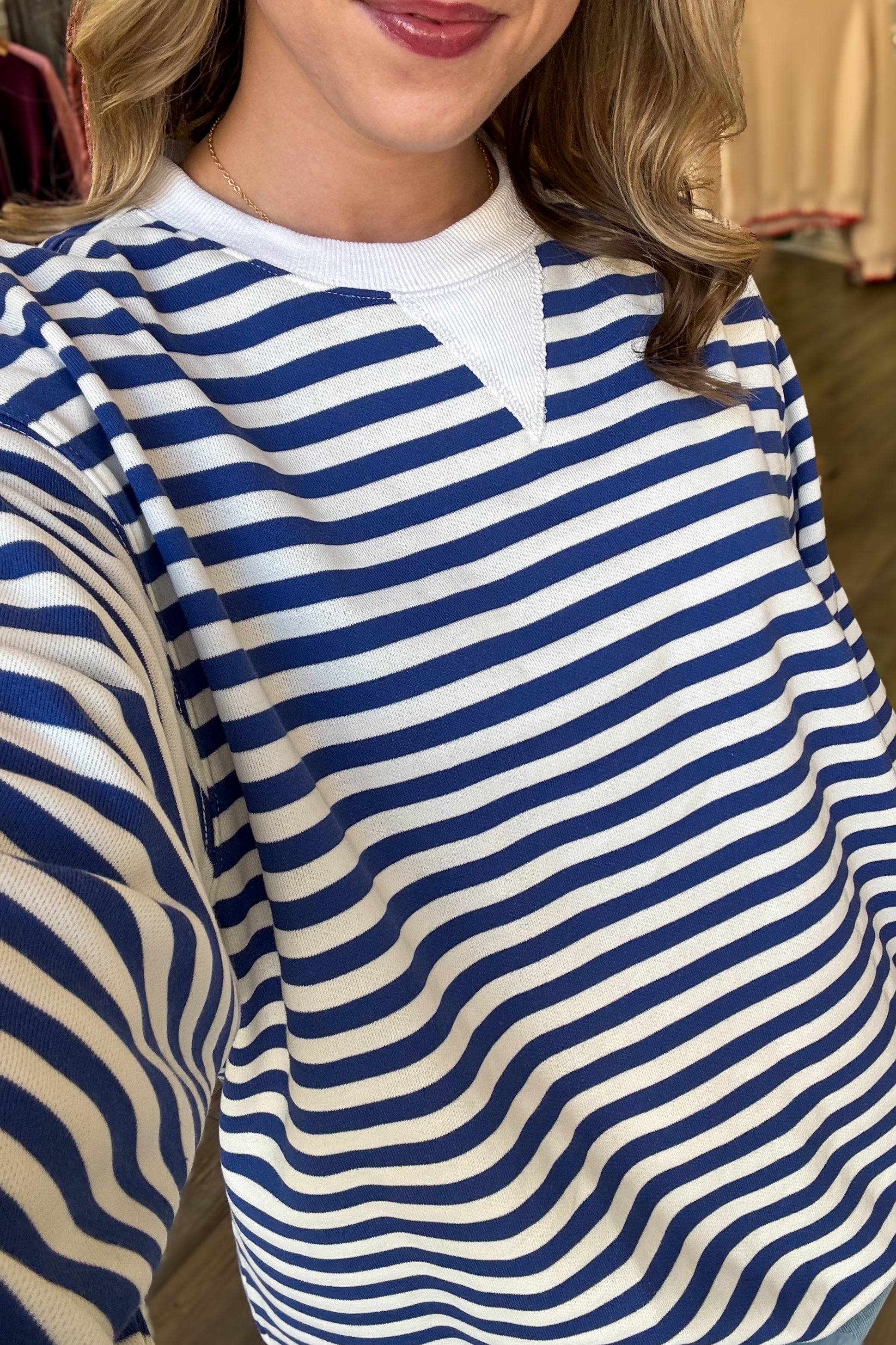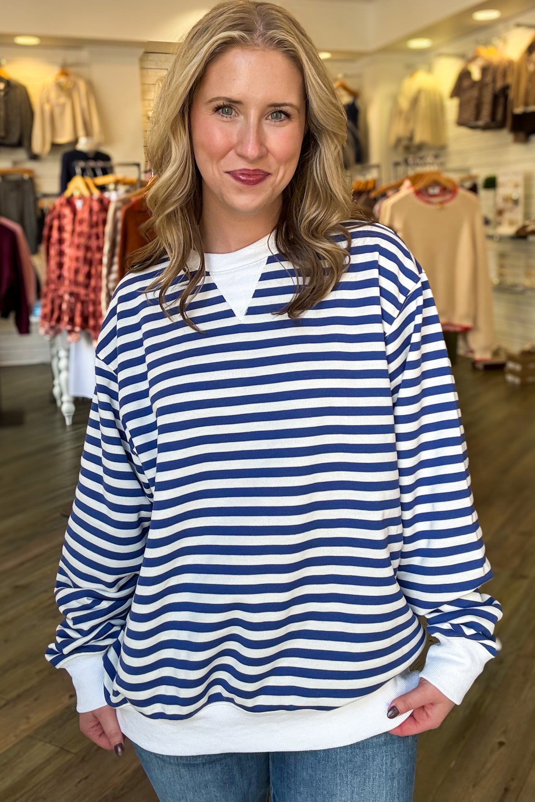 This Tiffany Blue Striped Sweatshirt features classic blue and white stripes with crisp white cuffs, a ribbed neckline, and a ribbed bottom hem for a comfortable fit. Designed to run true to size, it offers both style and ease for everyday wear. Perfect for layering or wearing on its own, this sweatshirt combines timeless design with cozy comfort.