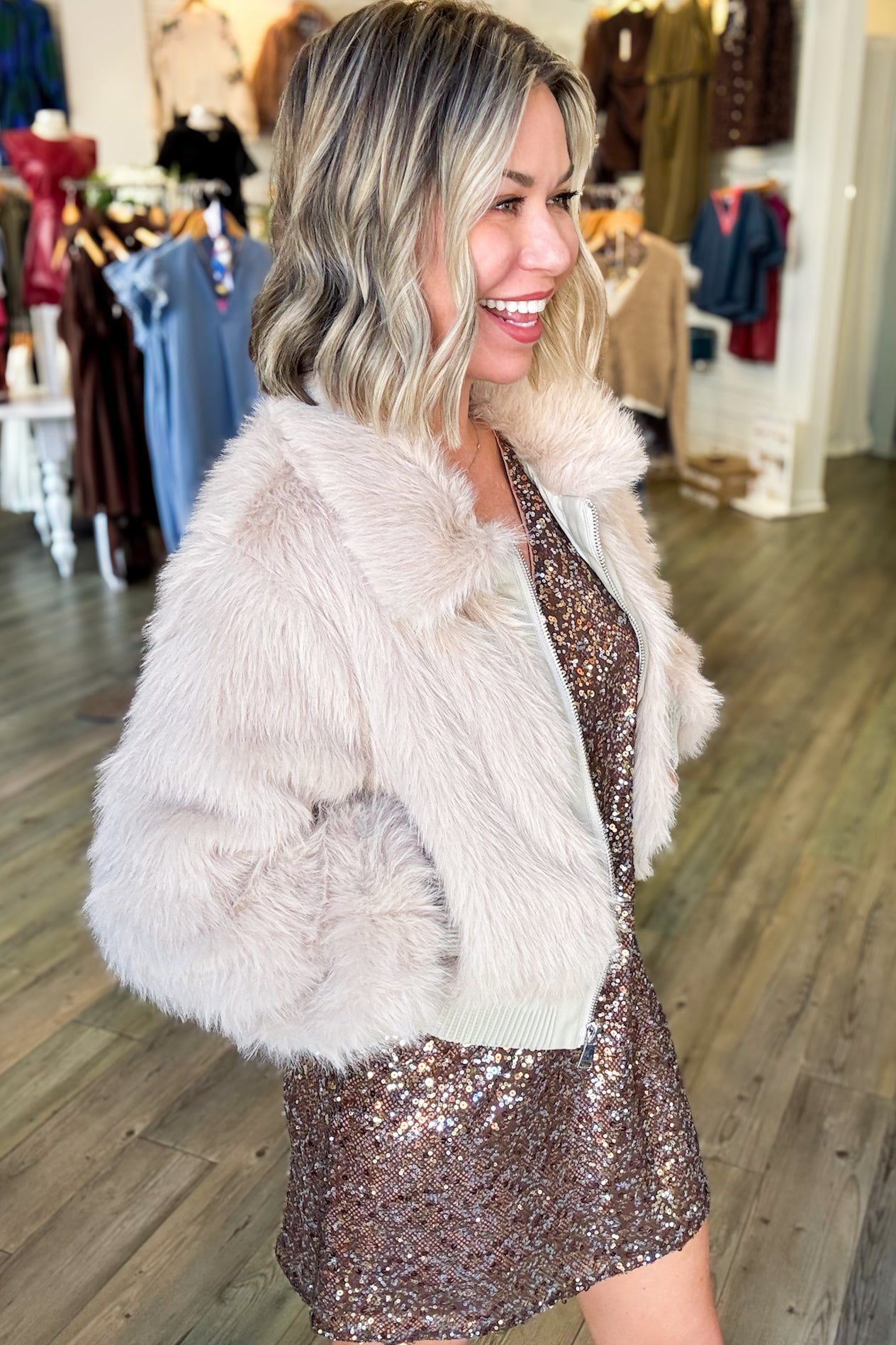 Stay cozy and stylish in the Tiffany Bomber Jacket. Crafted from soft faux fur, this jacket offers warmth without compromising on comfort. The leather zip detail adds a sleek touch, while convenient pockets provide practical storage for your essentials. Perfect for those chilly days when you want to look effortlessly chic.