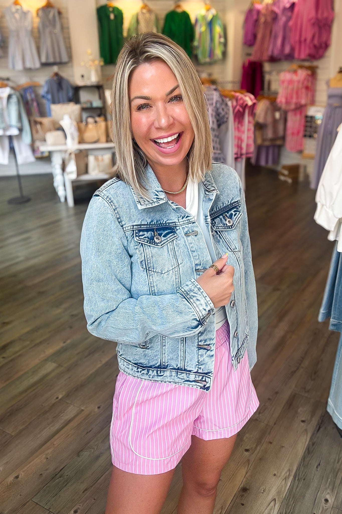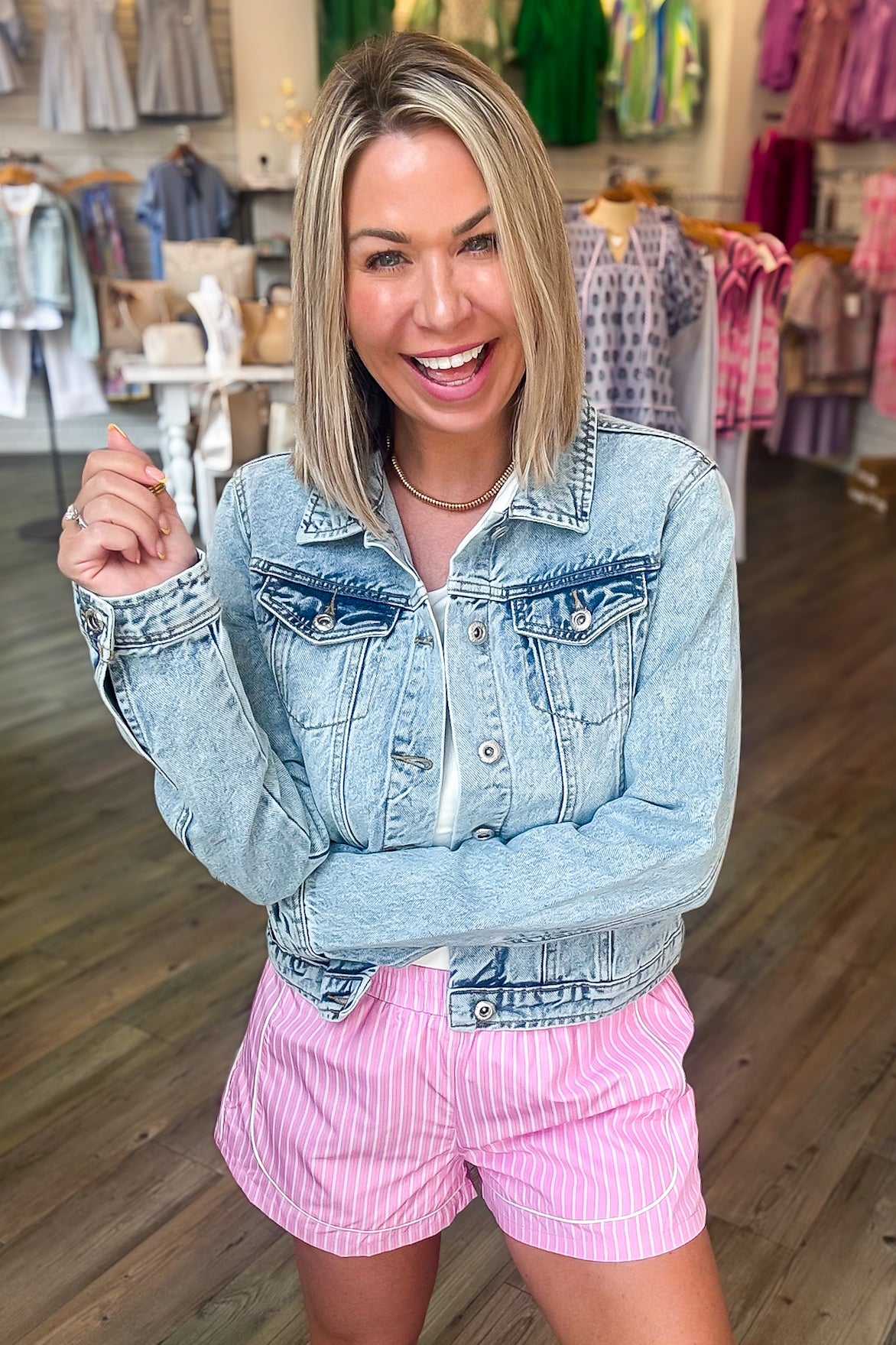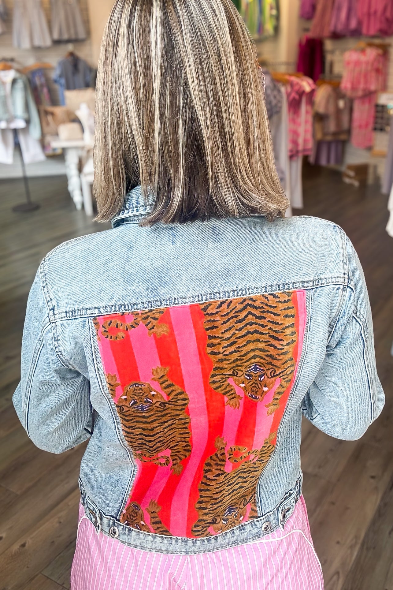 Expertly crafted with a light wash denim, this jacket features a striking pink stripe patch of a bold tiger on the back. Designed for maximum style and comfort, size up for the perfect fit. Elevate your wardrobe with this unique statement piece.