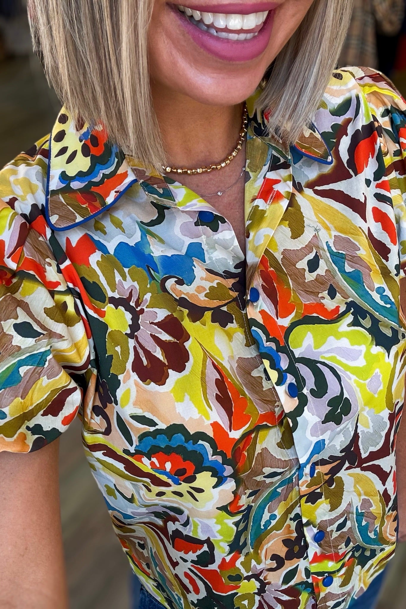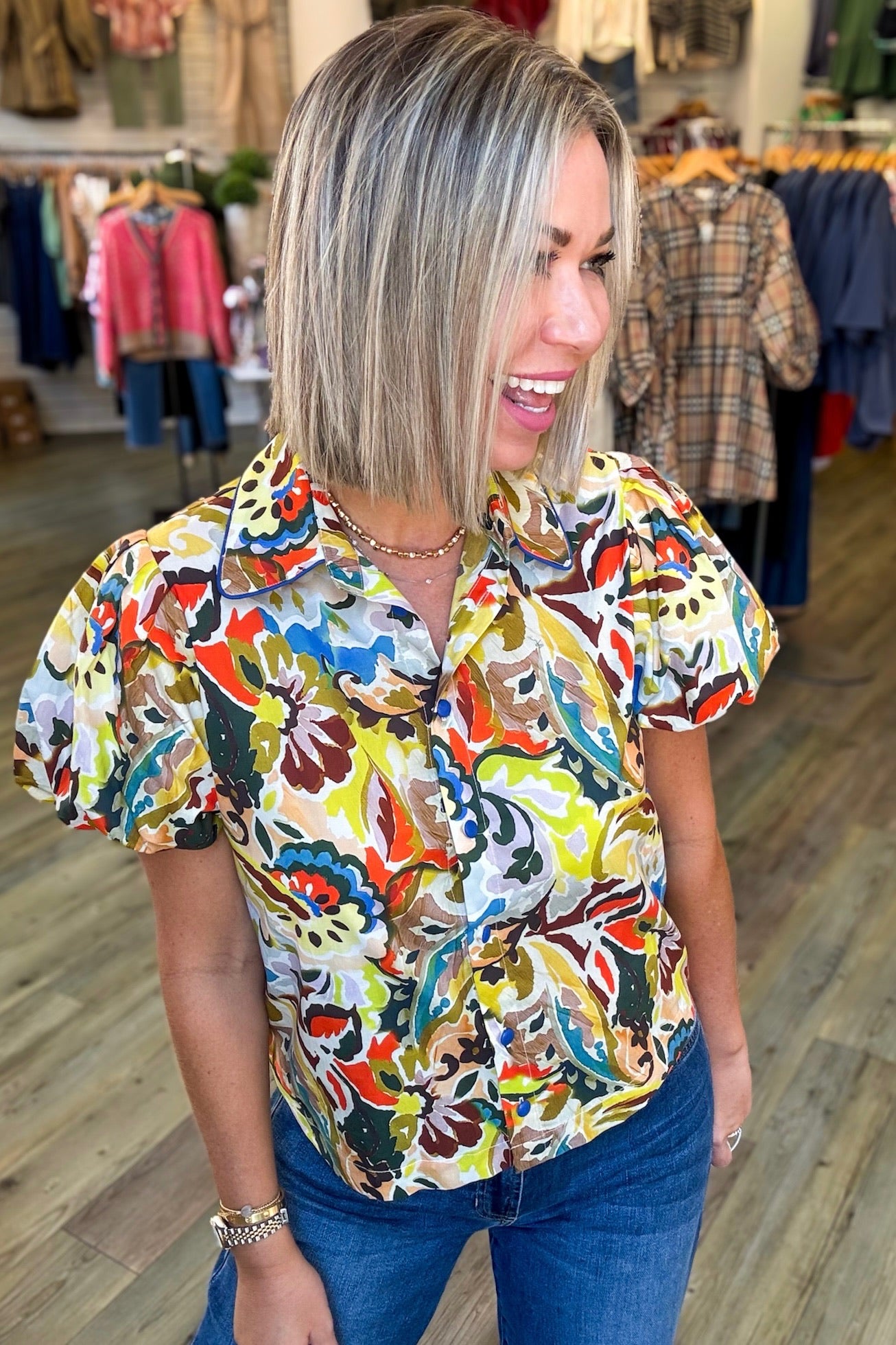 This Tina Floral Button Up Blouse features a vibrant multicolor watercolor floral print on soft cotton fabric, offering both comfort and style. Designed with puff sleeves and blue buttons, it adds a charming touch to your wardrobe. The classic collar and blue piped trim enhance its polished look, making it perfect for everyday wear. True to size, this blouse combines feminine details with easy wearability to support your confident, effortless style.