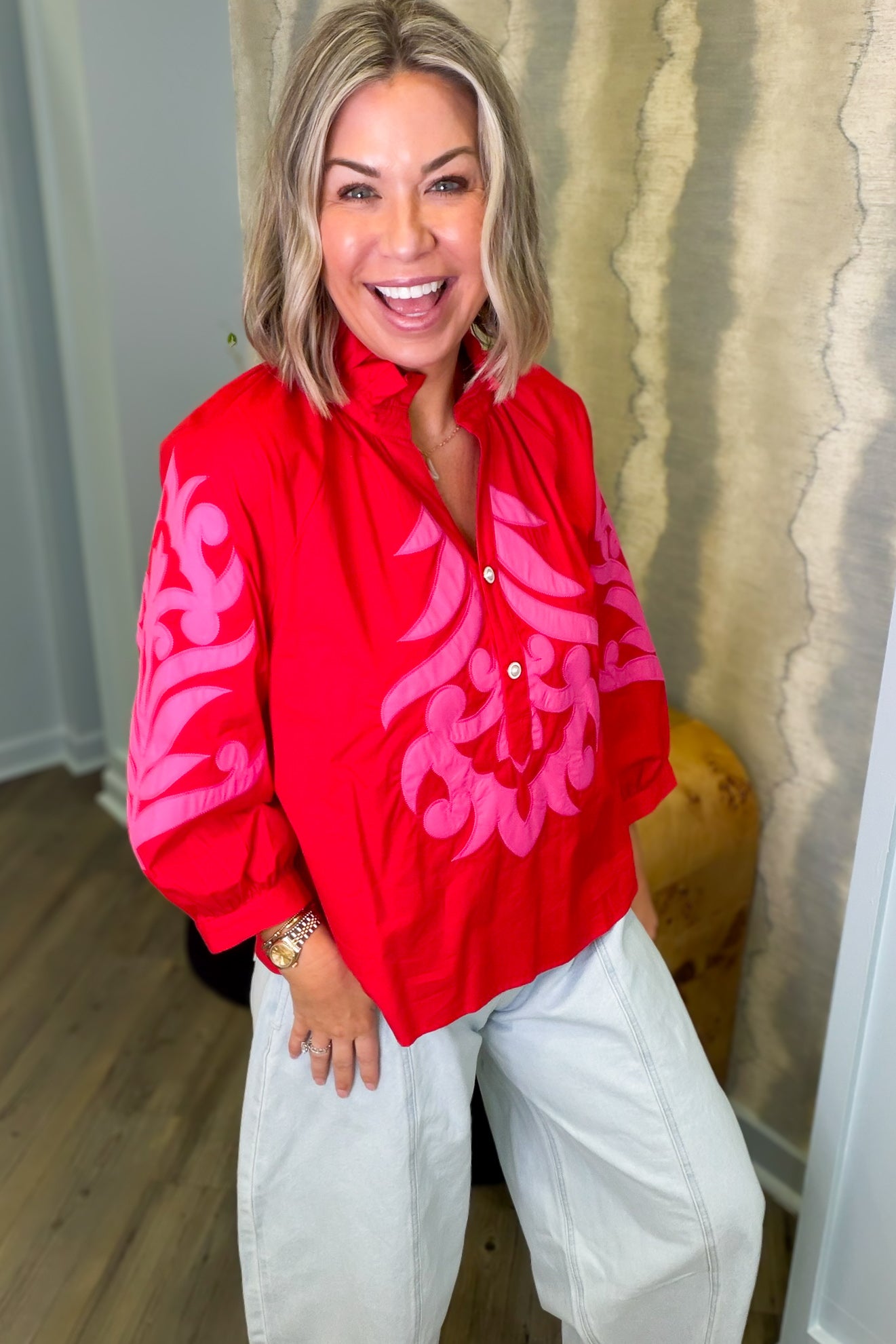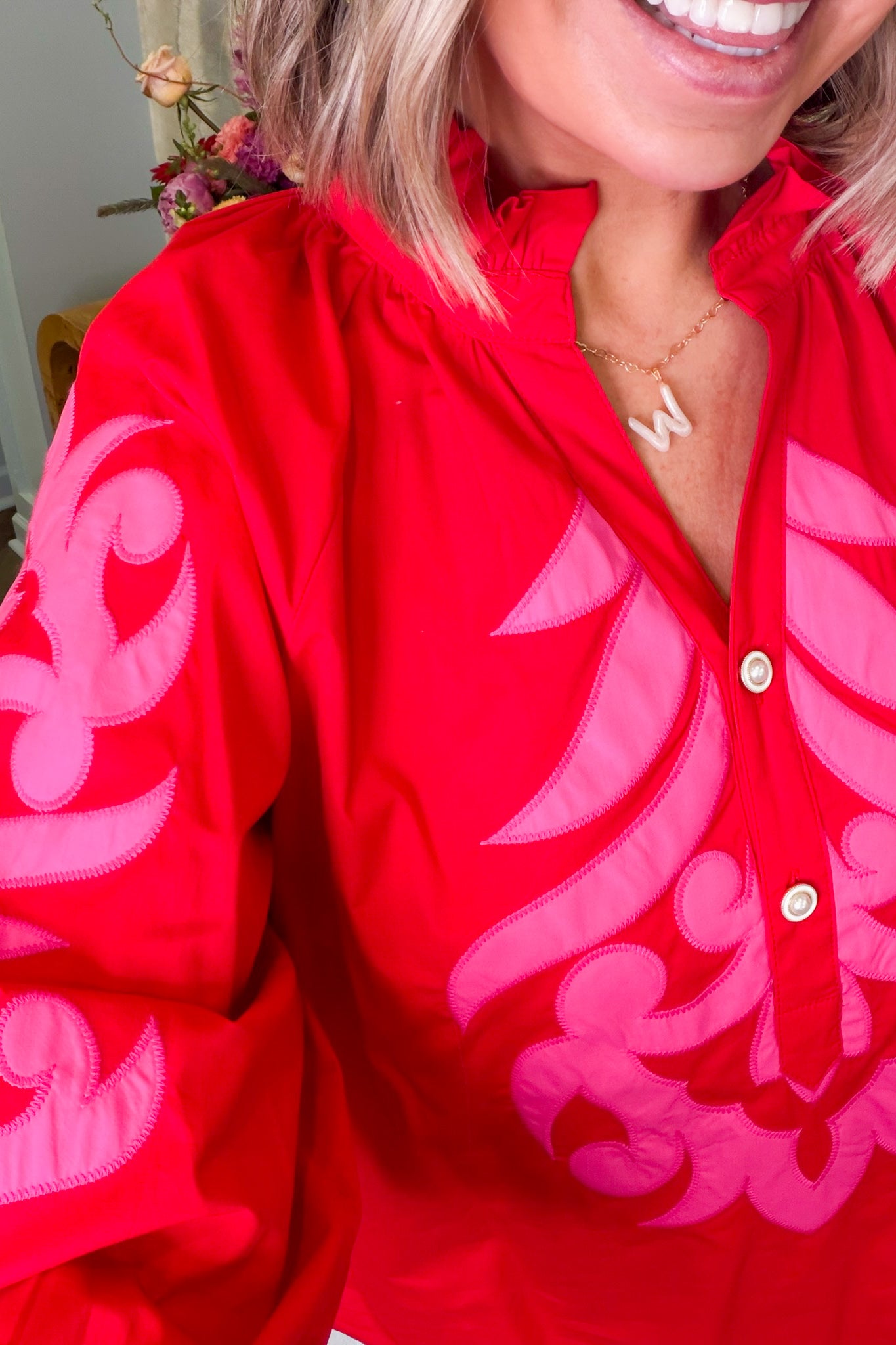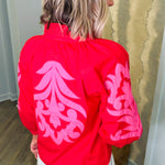 Introducing the Laurie Red Embroidered Blouse—your new go-to for effortless style! This vibrant red beauty features delicate pink embroidery that adds just the right amount of personality and charm. The flattering V-neckline and long sleeves create a polished look that works for everything from casual outings to dressed-up occasions. Best of all, it runs true to size, so you can shop with confidence. Slip it on and let the compliments roll in!