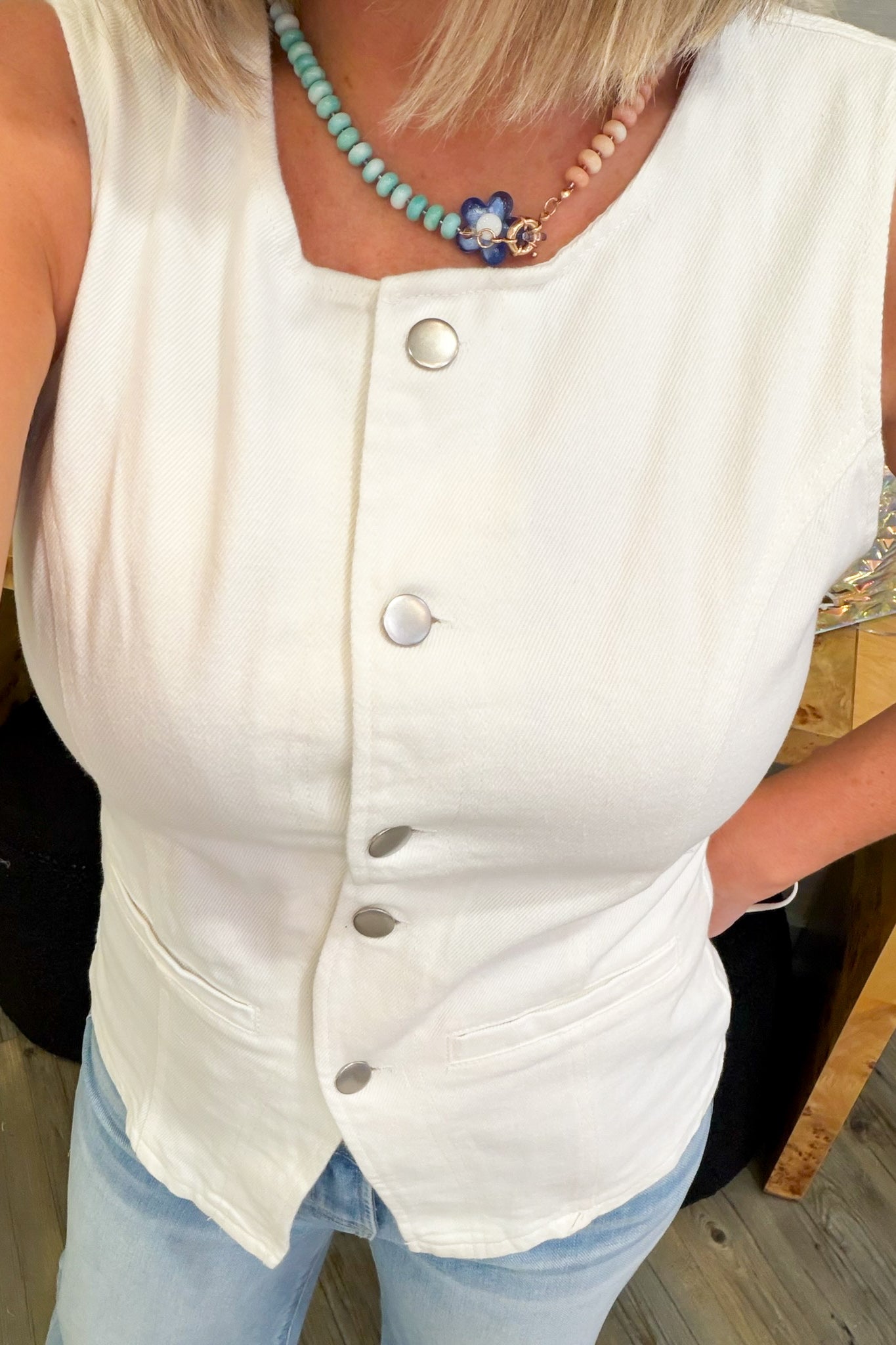 Crisp white denim meets effortless cool in this sleeveless button-down essential. Perfect for layering over your favorite tee or wearing solo when the weather warms up, this versatile top transitions seamlessly from casual weekends to dressed-up occasions. The classic button-front design and structured denim fabric keep you looking polished while the sleeveless cut offers maximum comfort and style. A wardrobe staple that works harder than you'd think.