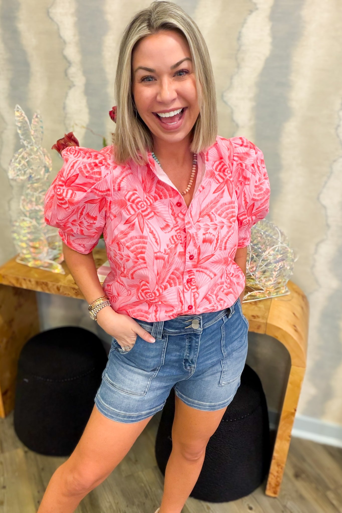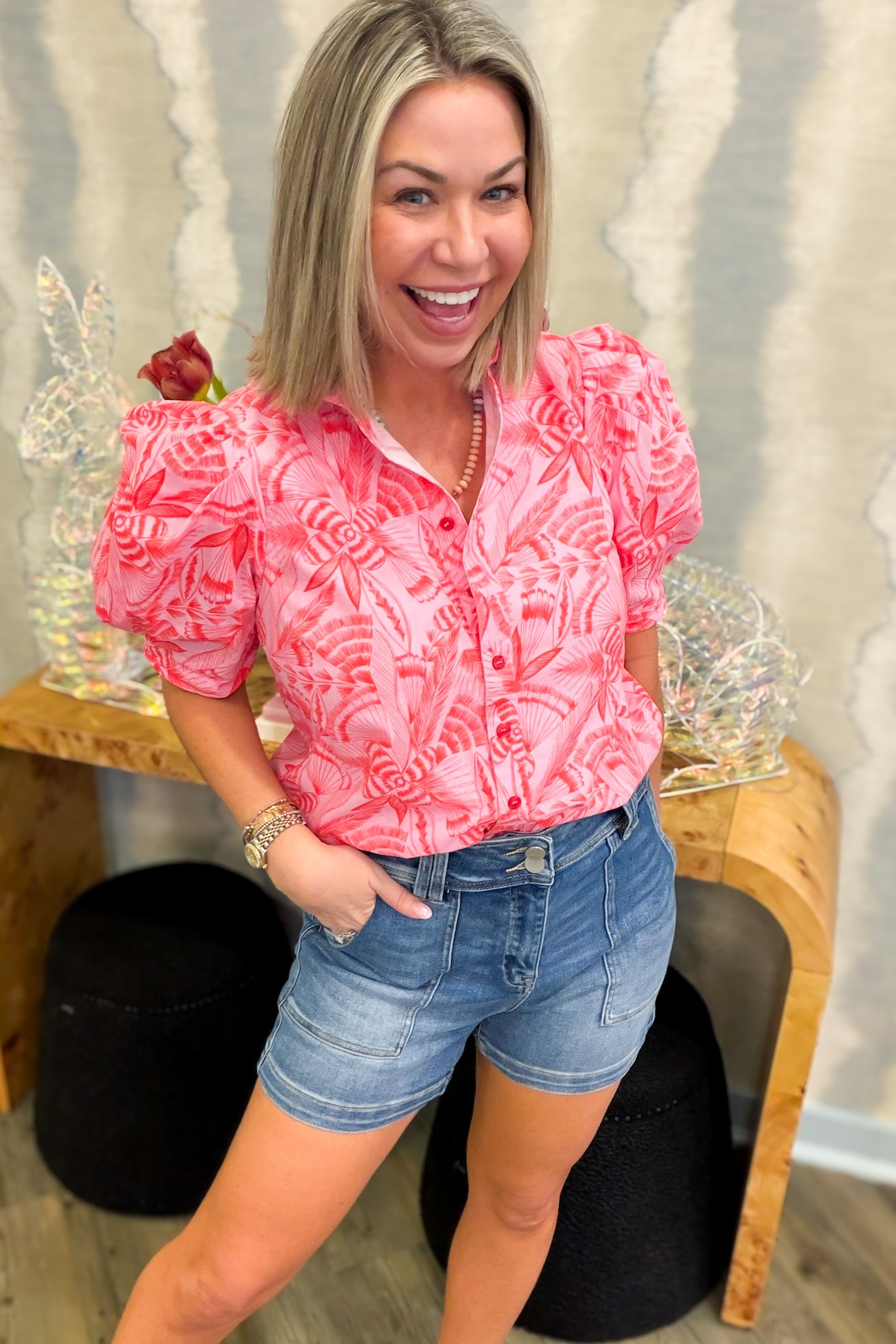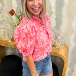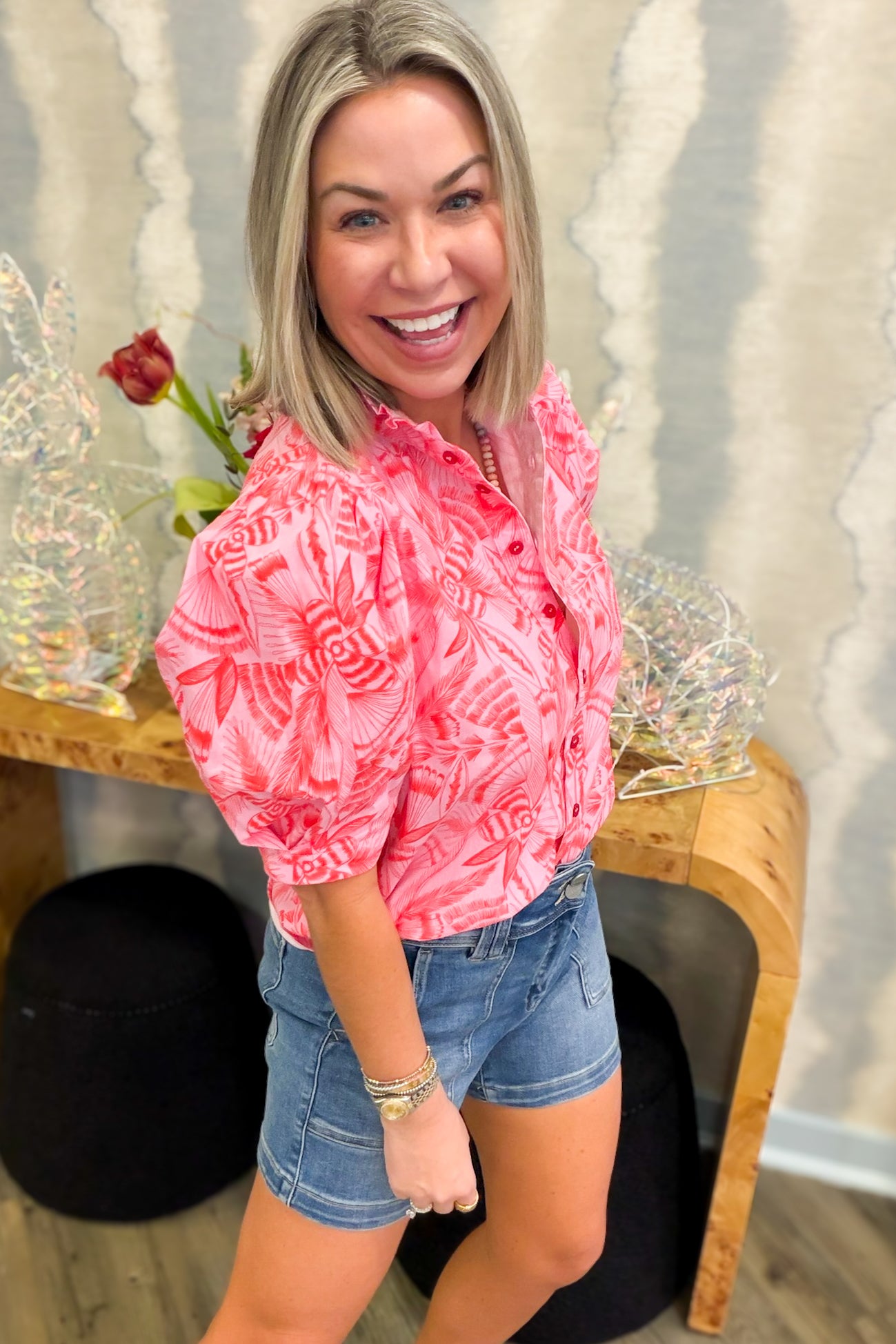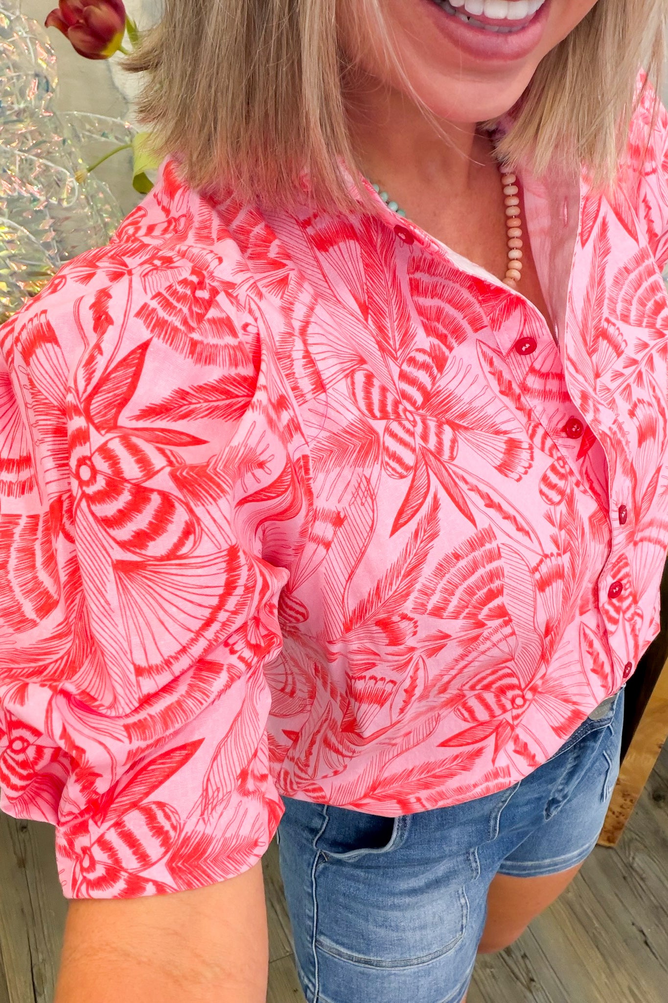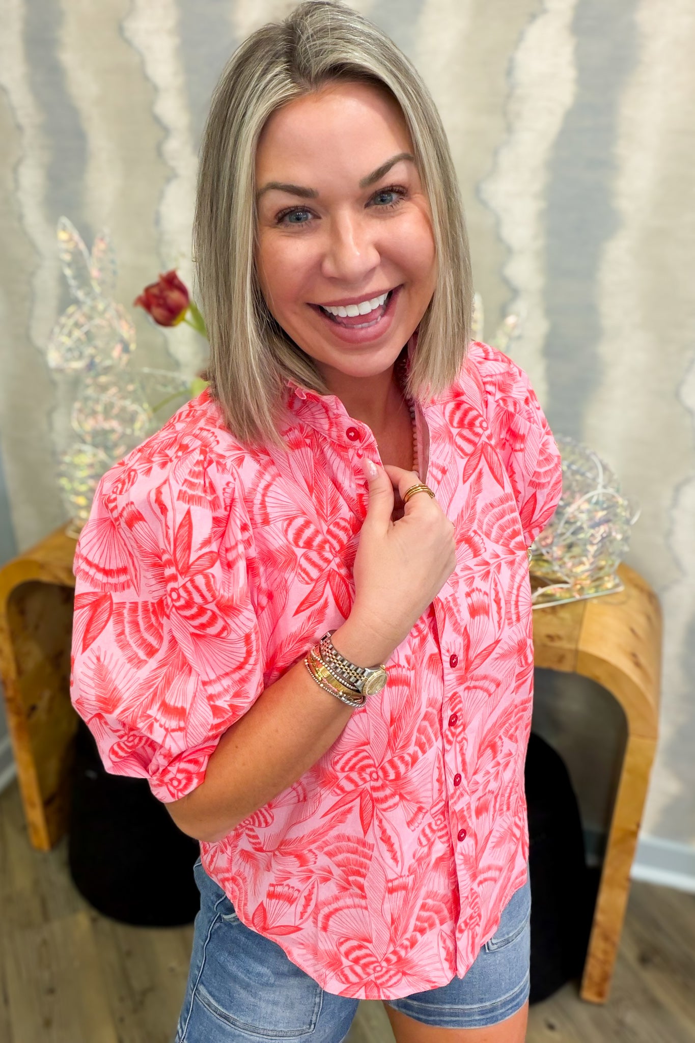 Escape to paradise with this breezy linen button-down featuring vibrant pink and coral tropical prints. Perfect for warm weather adventures, casual getaways, or simply channeling island vibes at home. The relaxed short sleeves and easy button closure make it effortlessly stylish—throw it on over a tank or wear it solo for an instant vacation mood. Lightweight and breathable, this top keeps you cool while turning heads with its bold, cheerful design.