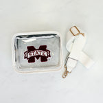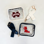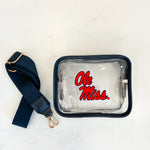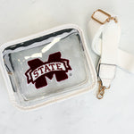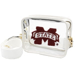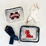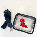 Style up game day with our decorative Varsity Patch Clear Camera Crossbody. This security compliant crossbody features a clear PVC body with gold hardware and beautiful faux leather accents. The main zippered compartment is perfect for securely storing your personal items. The matching webbed cotton and faux leather strap are both trend right and durably designed. Features a decorative chenille logo patch for your favorite team.