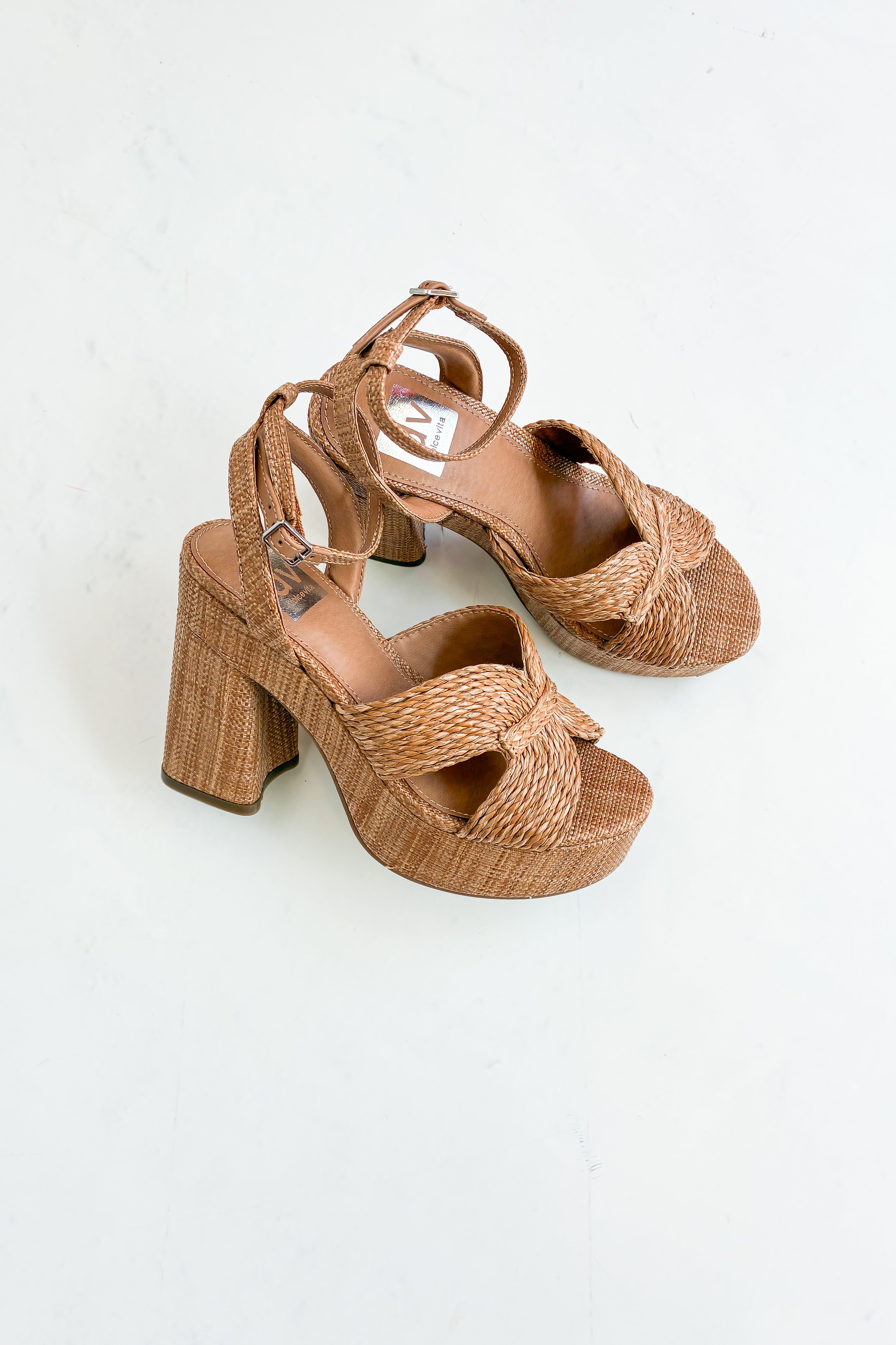 Woven raffia blends with sophisticated ankle straps over retro-inspired platform heels for a breezy lift in the DV Dolce Vita Waylan espadrille sandals.