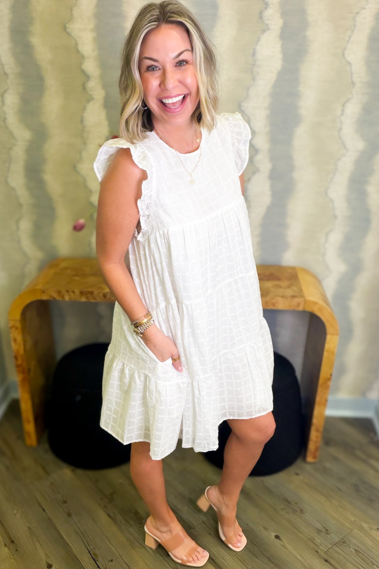 Flirty and feminine, this white eyelet babydoll mini dress is your go-to for effortless charm. The delicate eyelet detailing adds a sweet, romantic touch, while the relaxed babydoll silhouette flatters every figure. Perfect for warm-weather adventures, casual dates, or whenever you want to feel adorably put-together. Pair it with sneakers for a laid-back vibe or dress it up with heels for something extra special.