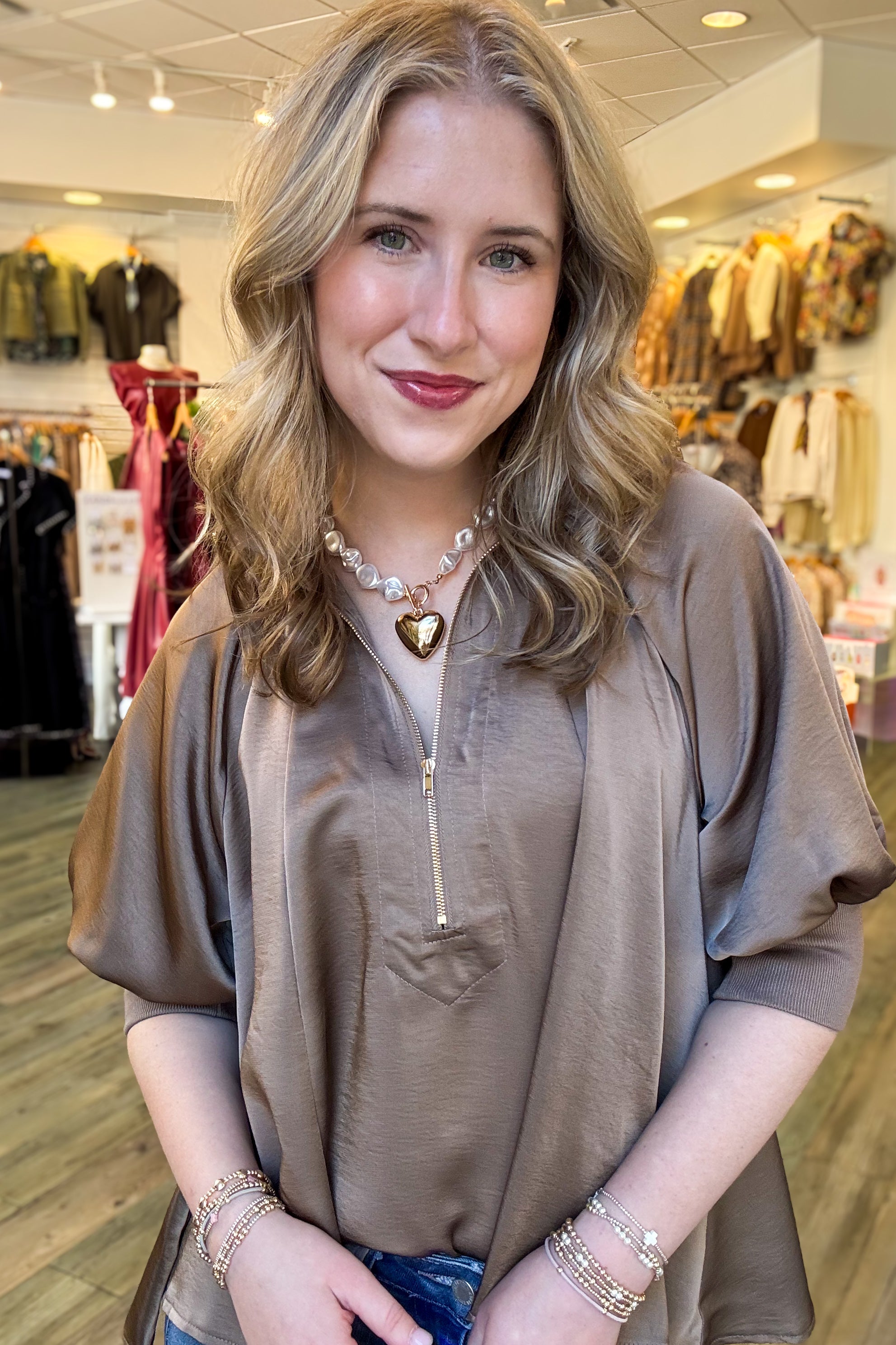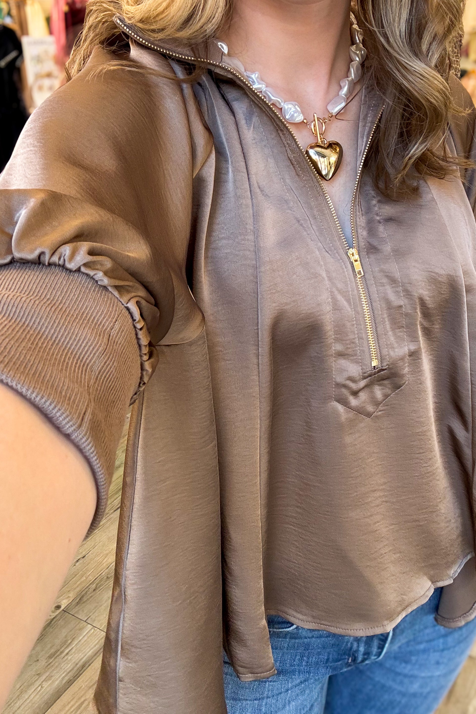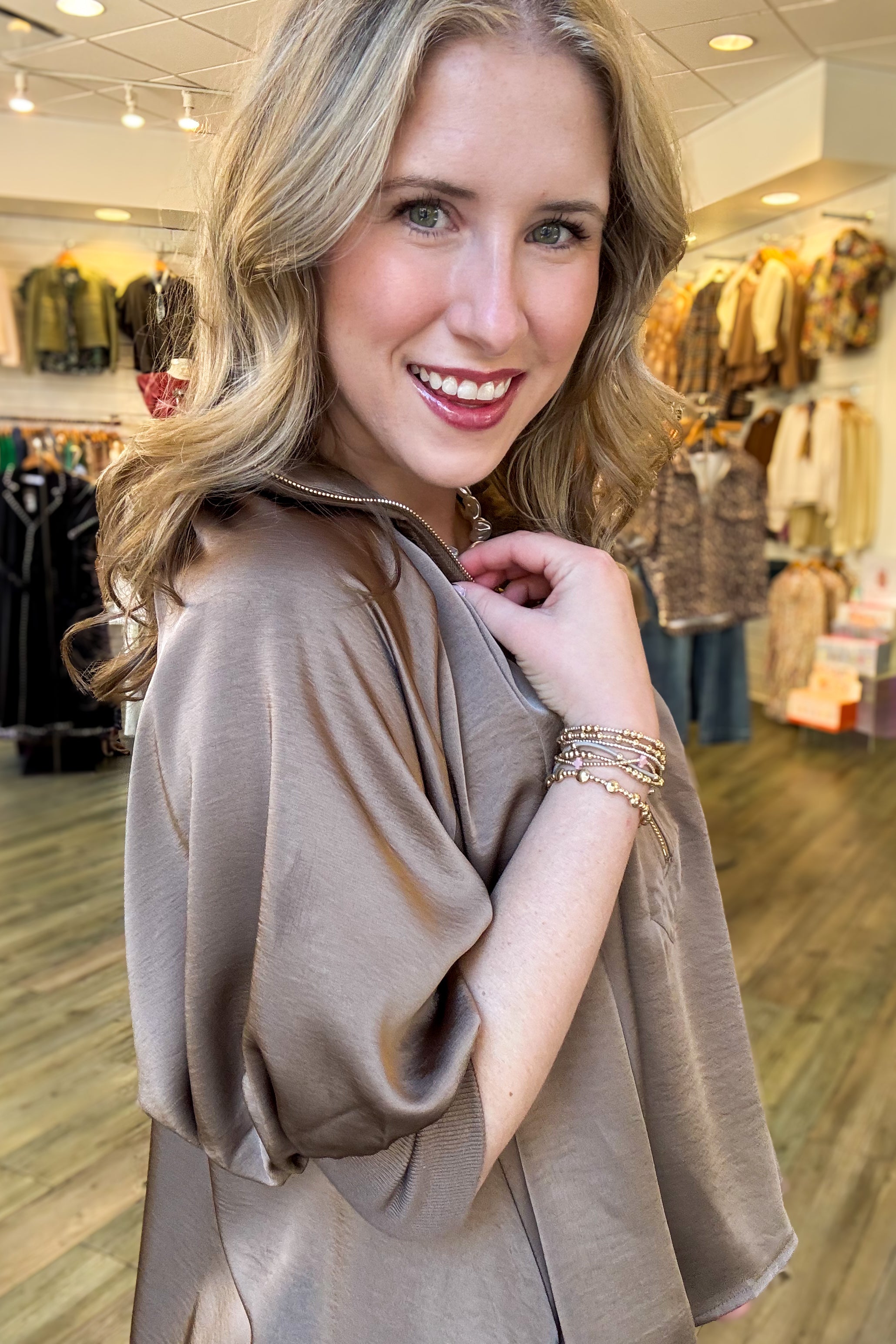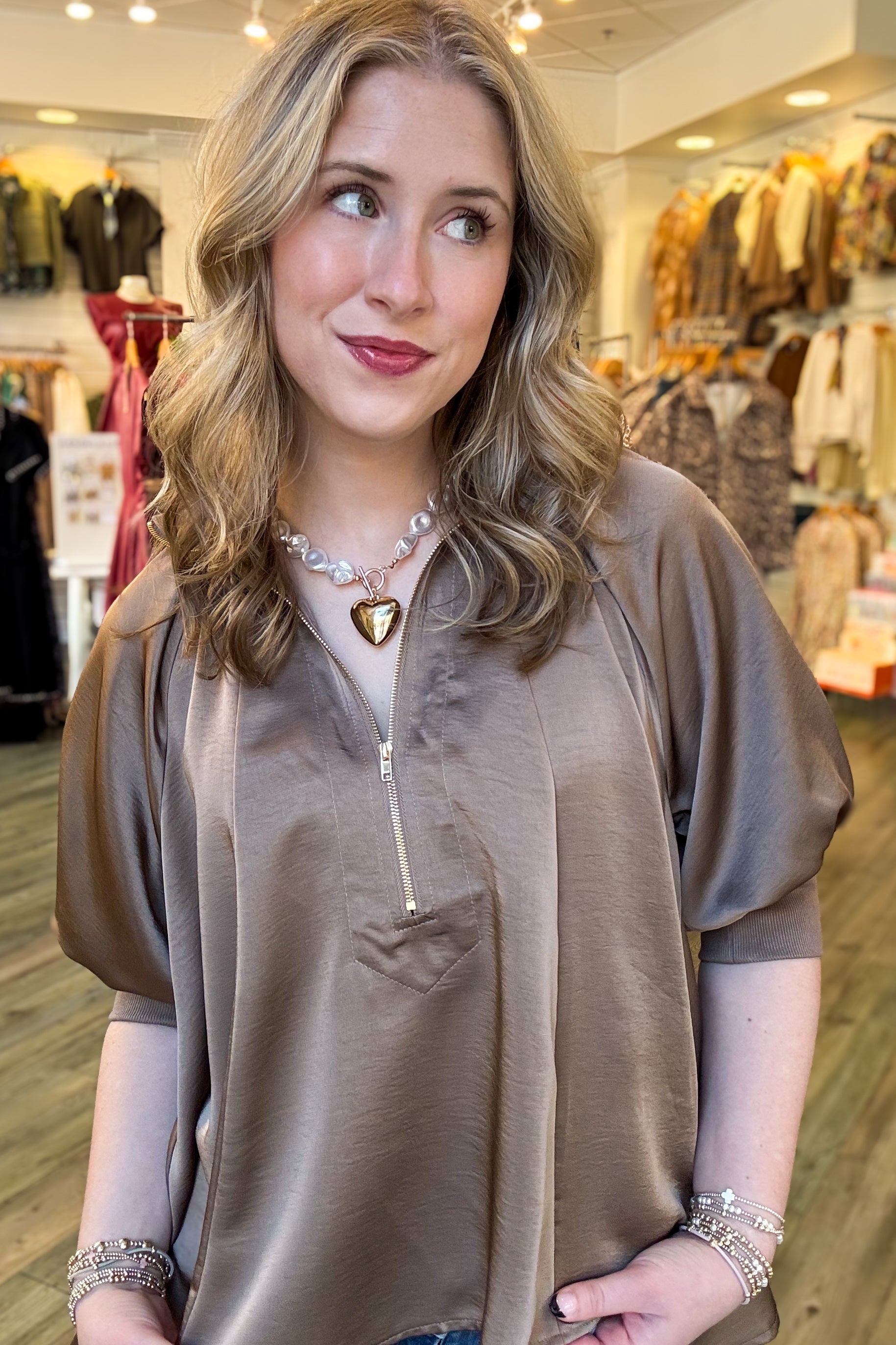 The Zoey Quarter Zip Blouse in mocha satin combines elegant style with effortless comfort. Featuring a mock neck band and puff sleeves, its quarter-zip design allows easy layering and a flattering fit. The flowy fabric drapes nicely for a graceful silhouette, and it runs true to size for a reliable fit. Perfect for dressing up or casual wear, this blouse offers versatile appeal and a touch of sophistication.